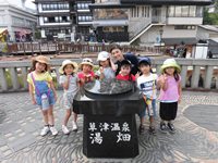 草津に到着し西の河原で昼食のおにぎりを食べ、お祭り雰囲気の街を散策しながら湯畑を一周し、ホテルに向かいました。