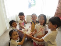 お楽しみ会では花火をしました。置き型の花火を見ては歓声があがったり、手持ち花火は火の勢いに驚く姿もありましたが皆とても喜んでいました。疲れてすぐ眠った子も居れば、寝付くのに時間がかかったお友達もいましたね。