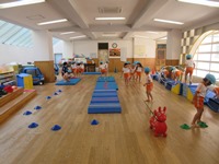ゴム跳びの後は、前転を行いました。迷路を作っていただき、前転をした後にゴムを跳び、フラフープのトンネルをくぐり抜けてゴールという迷路でした。