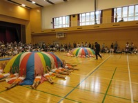 障害物競争での跳び箱、白熱したリレー、大きな見せ場の組体操・バルーン「サークル オブ ハピネス」動きや技の1つひとつがたくましく、3年間の大きな成長が感じられ目頭が熱くなりました。みんなで気持ちを合わせた姿が立派でした。