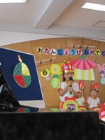 「ミュージックスタート!」の合図で音楽が鳴り拍手に包まれながら7月・8月生まれ総勢28名のお友だちが舞台に上がりました。