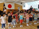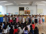 また、君が代、園歌の他に、年少組は『手をたたきましょう』、年中組は『線路はつづくよどこまでも』、年長組は『南の国のハメハメハ大王』を歌いました。どのクラスも元気に歌えていました。