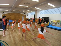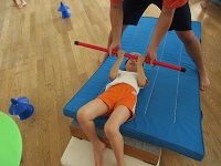 跳び箱のロイター板の上にマットを置き、高さを出して後転をすることで回りやすくしたり、バランスボールの上から後転することで回る時の背中の丸みを感じたり、棒を自分のお腹に引き寄せそれを講師の先生が持ち上げることで逆上がりの回る感覚を掴んだりと、後転、逆上がりのポイントを押さえた指導をして頂きました。