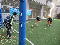 ゴール前に積んだコーンを倒すシュート、真ん中のコーンを避けて端っこへ向けてのシュート、キーパーに向かってのシュート、障害物を飛び越えられるようなフライのシュート、置いてある対象物へ向けて一点をめがけたシュート等様々でした。