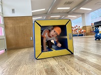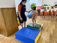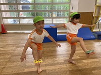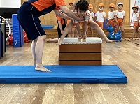 本日は1学期2回目の体操教室でした。 あいにくの雨でしたが、体操教室を通してホールで思いっきり体を動かす事ができました。 いつも通り「お願いします!」という元気なご挨拶から始まり、バランスを中心に準備運動を行いました。 まずは片足立ちで10秒、その後足の甲に数字が書いてあるおもりを乗せて10秒、最後に重りの上に片足立ち3秒をした後にグージャンプをしました。 倒れそうになりながらもしっかりできるように一生懸命踏ん張っていました。「1・2・3・グー」を合言葉に跳び箱の助走に繋げました。 そして跳び箱の導入としてグージャンプを意識しながら、腕支持や開脚跳びに必要な動作をサーキットに取り入れながら練習しました。 そして、いよいよ跳び箱3段に挑戦! 少し怖がりながらも積極的に挑戦する姿が見られ、3段を跳ぶことができた子もいます! 1学期の体操教室は本日が最後となりますが、教えていただいたことを思い出しながら、全員が跳べるように練習していきます。