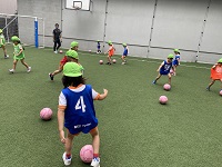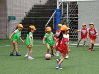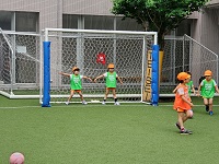 自分のボールをよく見て蹴っていました。動いているボールを足で止める事はなかなか難しく時に手が出てしまう場面もありました。