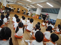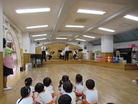 9月5日に音楽鑑賞会があり、東邦音楽大学のお兄さんお姉さんに金管楽器の5重奏を聴かせていただきました。 演奏が始まると、手拍子や身体を揺らしてリズムにのる姿が見られました。 聞いたことのある曲があると楽しそうに口ずさんでいました。 楽器はトランペット、トロンボーン、ホルン、チューバがあり、どんな役割があるのか、どんな音がするのかなど、1つずつ丁寧に紹介してくださり、子どもたちも興味津々で学ぶことができました。 楽しい演奏を聴かせてくださりありがとうございました。