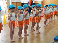 ちょうちょを捕まえるイメージで行い、「ちょうちょ うまくつかまえられたー!」等笑顔で行っていました。