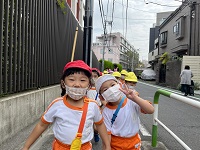 二人一組で手を繋いで仲良く歩きながら公園に向かいました。途中で横断歩道がありますが、しっかり手を挙げて速やかに渡ることができました。