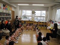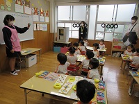 キッズ英語では、カラーソング、アニマルソングや、食べ物、自分の名前、ご機嫌うかがい、『What do you like ~』の英語を教えて頂きました。