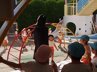 お庭とホールで遊んでいると、お化けの登場・・・!スーパーマリオ・ルイージ―やピーターパン、子どもたちは好きな仮装をしてハロウィンを楽しみました。