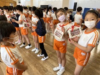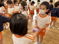 お庭や、ホールで一緒になった時は一緒に遊んでくれた年長さん。 困った時には優しく声を掛けてくれました。今までありがとう!という気持ちを込めて、プレゼントを作りました。 年中組からはランドセルの小物入れ、年少組からは写真立てを贈りました。 年長さんと一緒に「アルプス一万尺」を歌って手遊びをしたり、「勇気100%」を歌いました。 最後に最高の思い出ができました。 卒園式まであと2日、楽しく過ごしてくださいね。