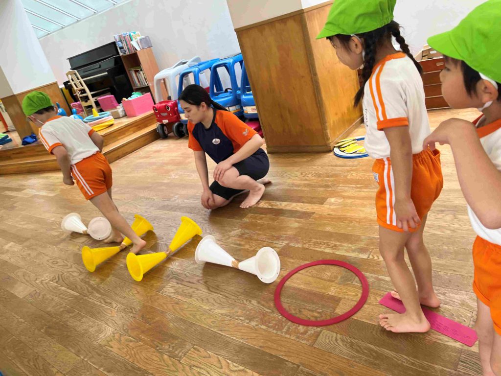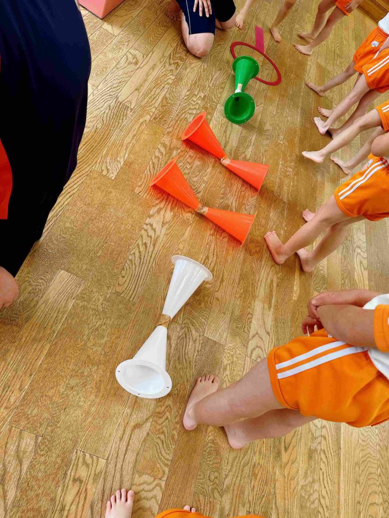 はじめに体操をし、ケンケン・グージャンプ・パージャンプ・チョキジャンプを2回、「ケン・グー・パー・チョキ・チョキ」と口に出しながらその場でジャンプ。その後、コーンを跳んで練習をしました。この「ケン・グー・パー・チョキ・チョキ」を止まらず、滑らかな動きを続けてできるようになると跳び箱が跳べるようになるそうです。
