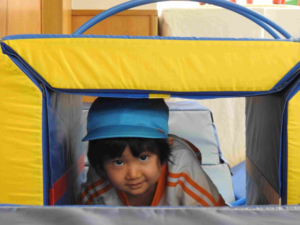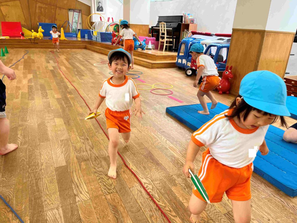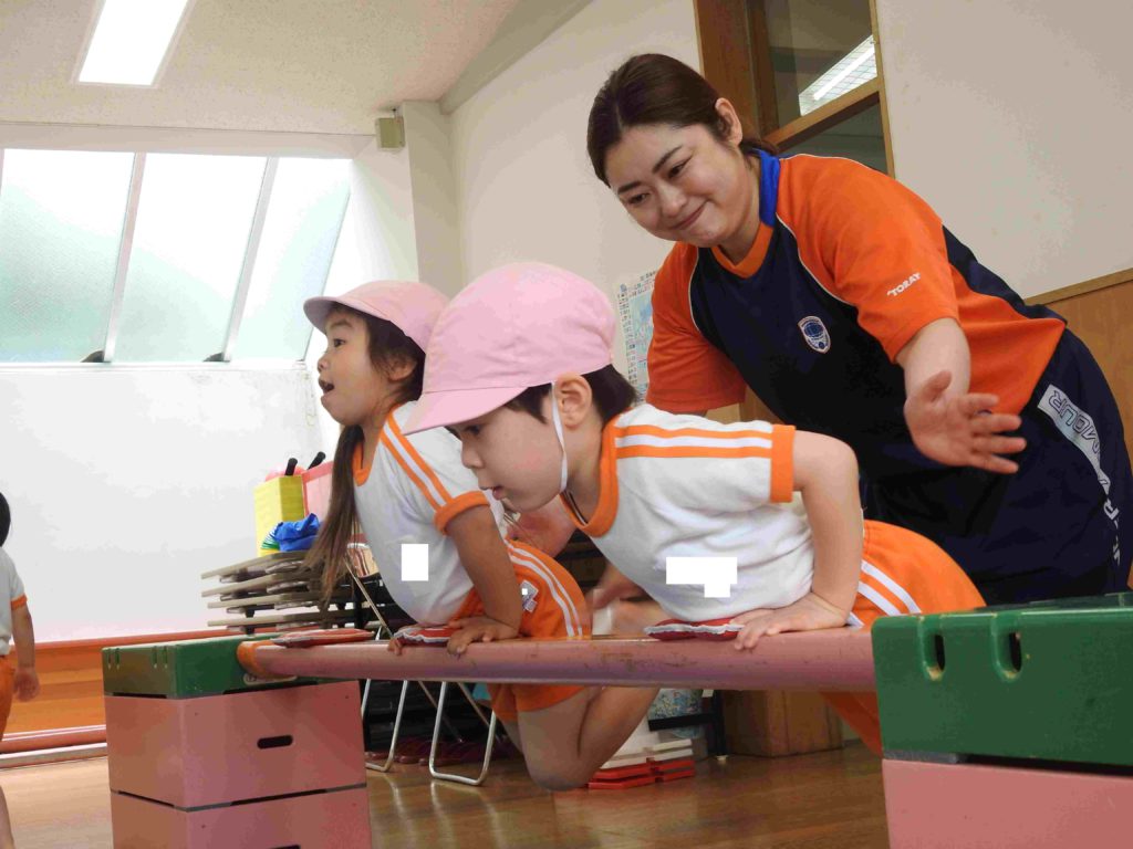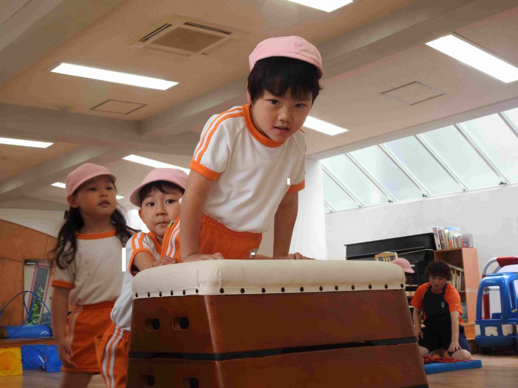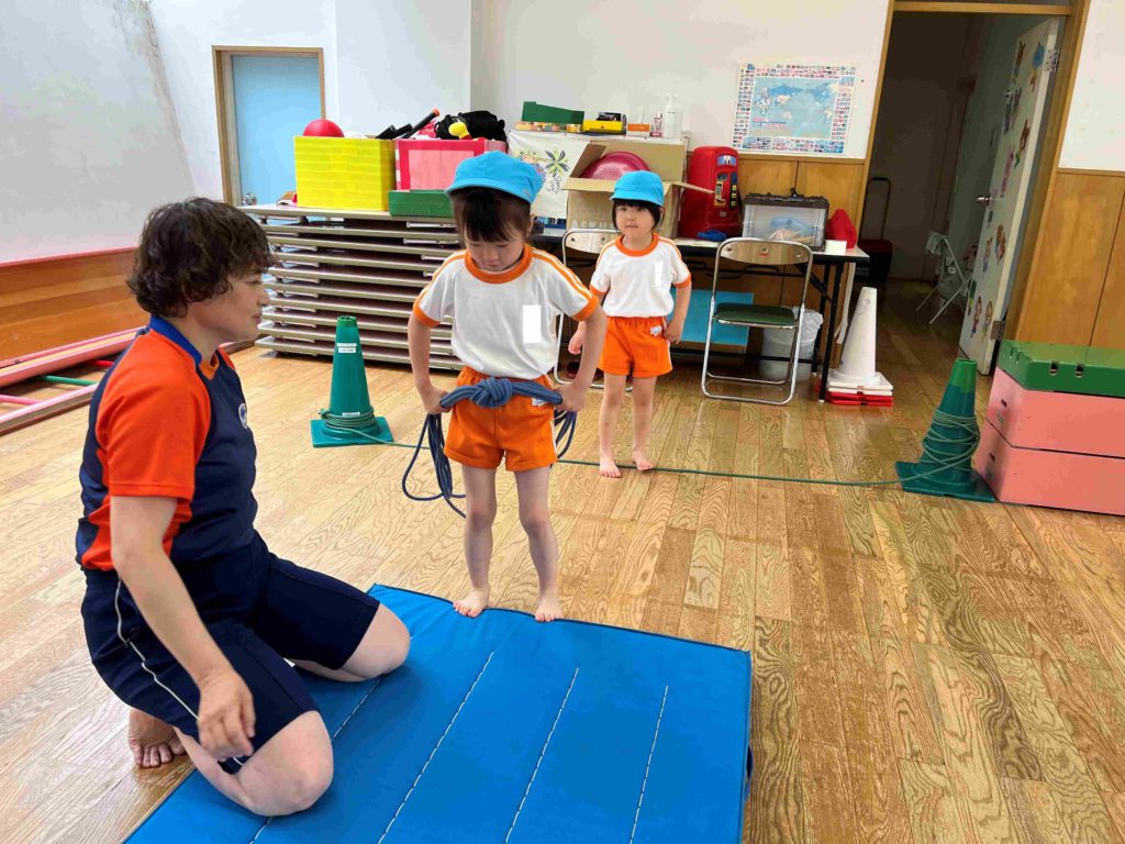 今回の体操教室では鉄棒の「前回りおり」ができるようにするための練習を中心にご指導をいただきました。鉄棒を使わずに「前回りおり」に必要な、腕支持、飛びつき、回転という動作ごとに分けて練習をしました。腕支持は腕をまっすぐ伸ばし平均台に乗り、バランスをとる動きを行いました。飛びつきでは跳び箱の目印の所に手を付きそのまま腕をまっすぐ伸ばす練習をしました。飛びついた勢いを利用してそのまま腕支持をするという動きが難しく、苦労する園児が多かったです。回転では、大縄を肩幅くらいに折り、中心に結び目を作り、それを足の付け根に当てたまま前転をしました。しっかりと身体を丸くして手を付かずに回れるとその動きがそのまま鉄棒の前回りの動きになるので、引き続きこの動きを練習することが大切だと感じました。