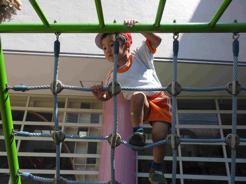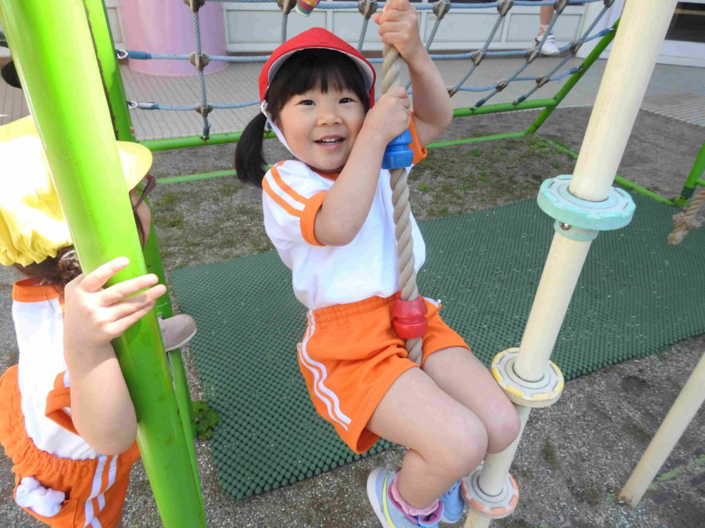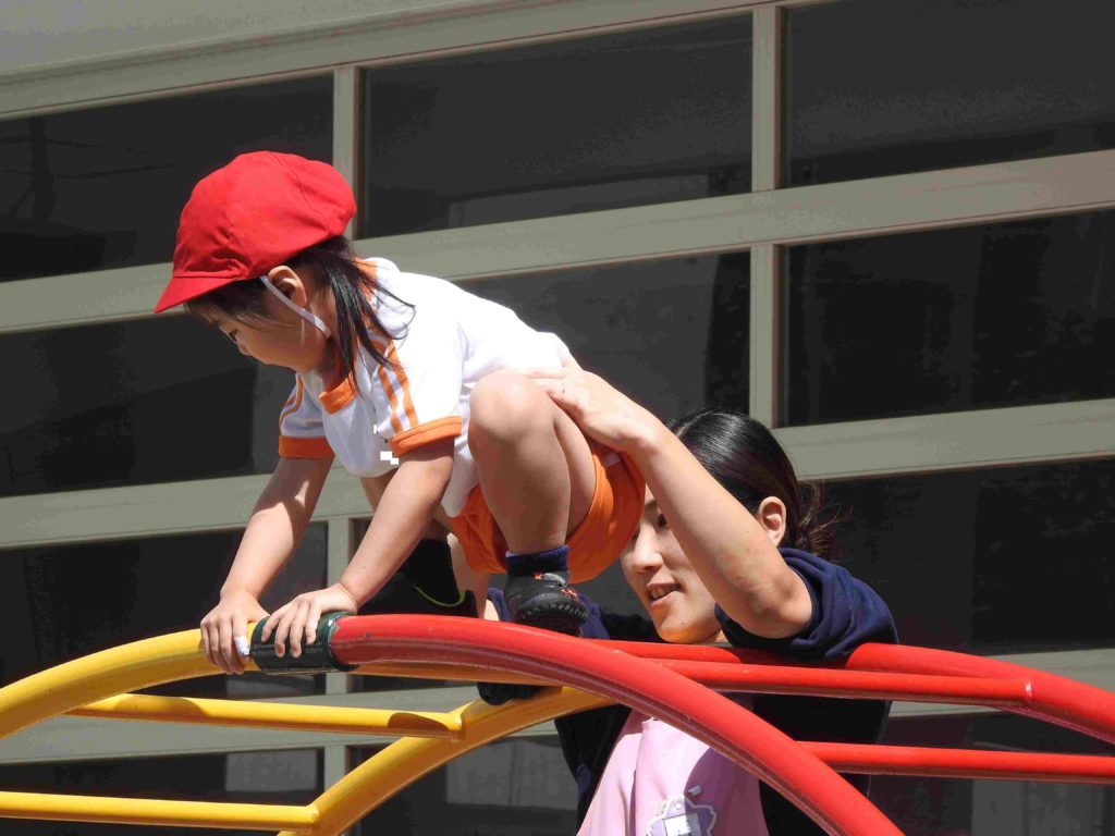 年少組の外遊びの様子です。園庭で遊具を使って思い思いに遊んでいます。鉄棒やたいこ橋、はん登棒に挑戦している姿が見られます。入園して1か月が過ぎ、遊具を使う順番を守ったり、お友だちと仲よく遊んだりするなど幼稚園での生活にも慣れてきたようです。