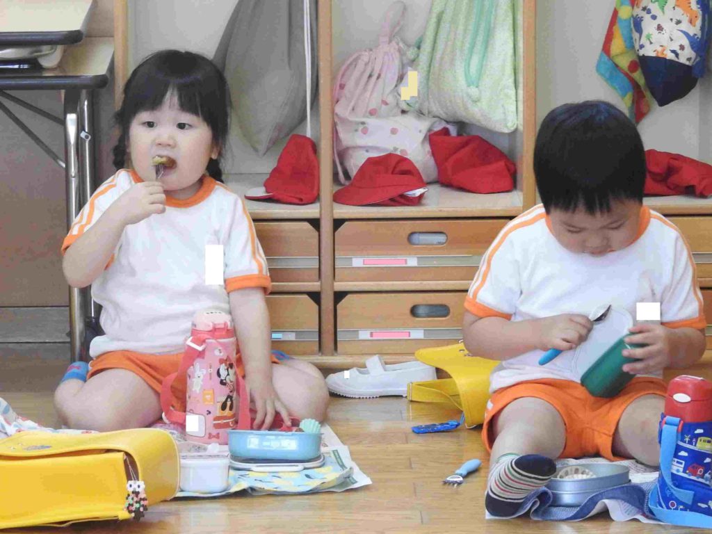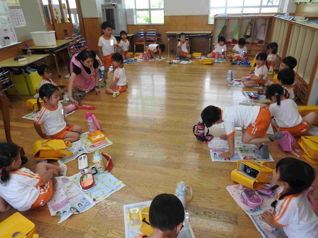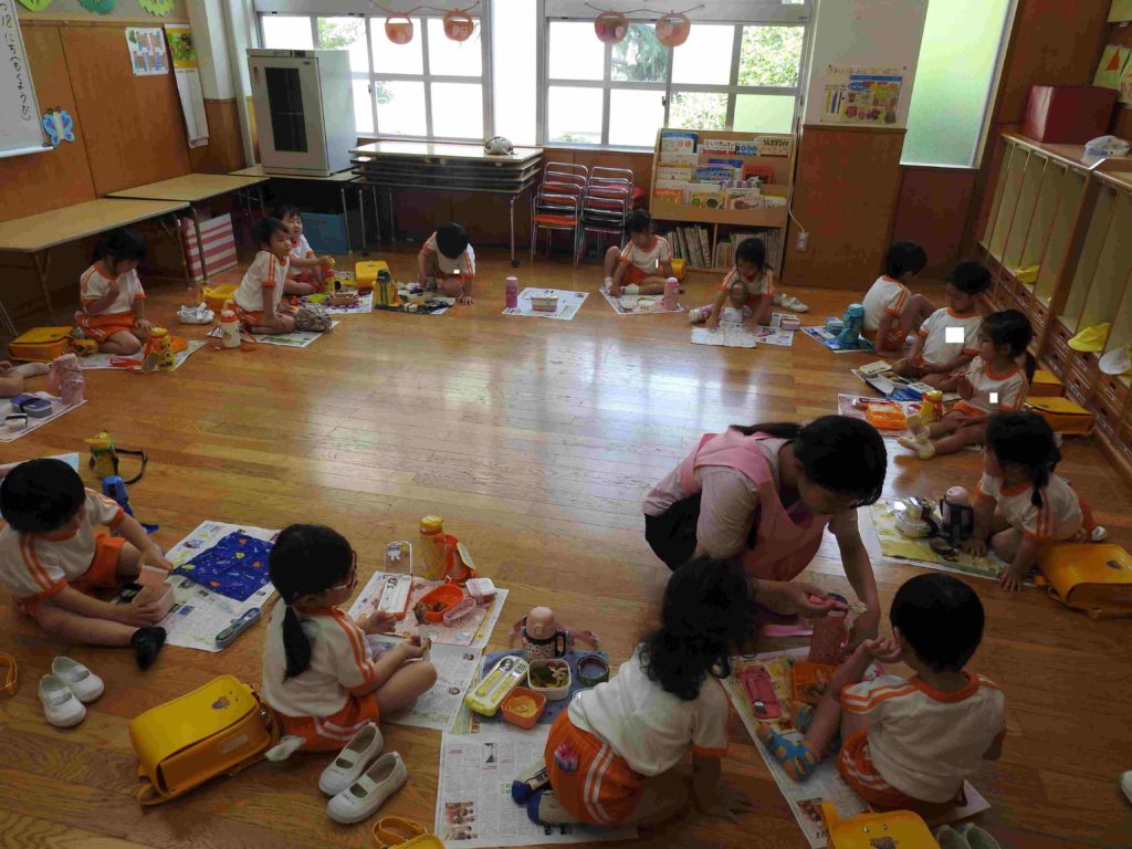 明日の園外保育に向けて年少組ではお弁当を食べる練習「遠足ごっこ」をしました。普段、お弁当は椅子に座って食べています。園外保育ではレジャーシートの上に座ってお弁当を食べます。年少組にとっては初めての経験です。今日は新聞紙をレジャーシートに見立て、床に座って食べました。いつもよりさらに楽しく食べられたようです。