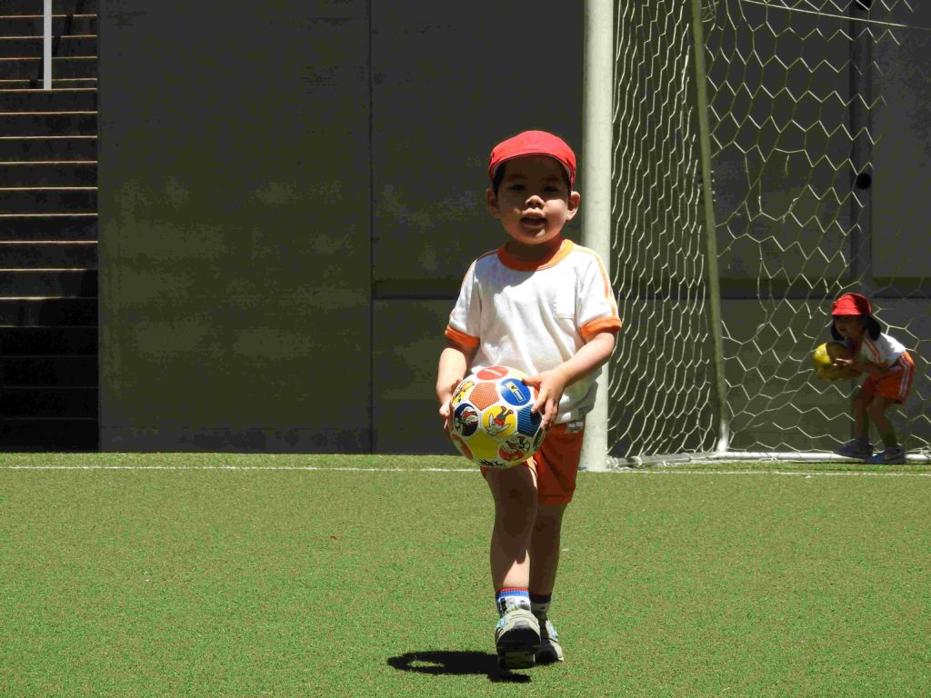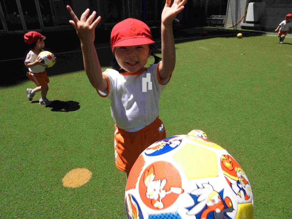 今日は3クラスが中庭で遊びました。園庭よりもずっと広く、人工芝なので転んでも痛くありません。思いっきりボール遊びができました。みんなニコニコして中庭を後にしました。