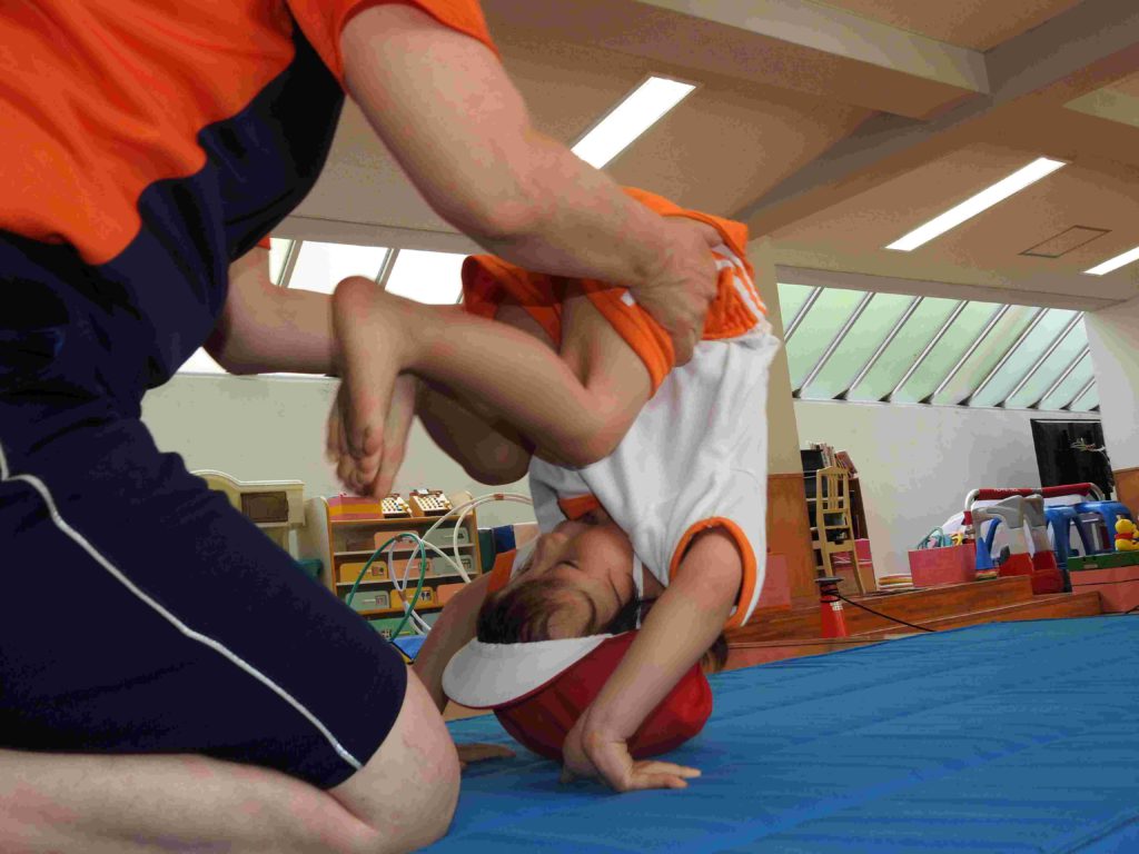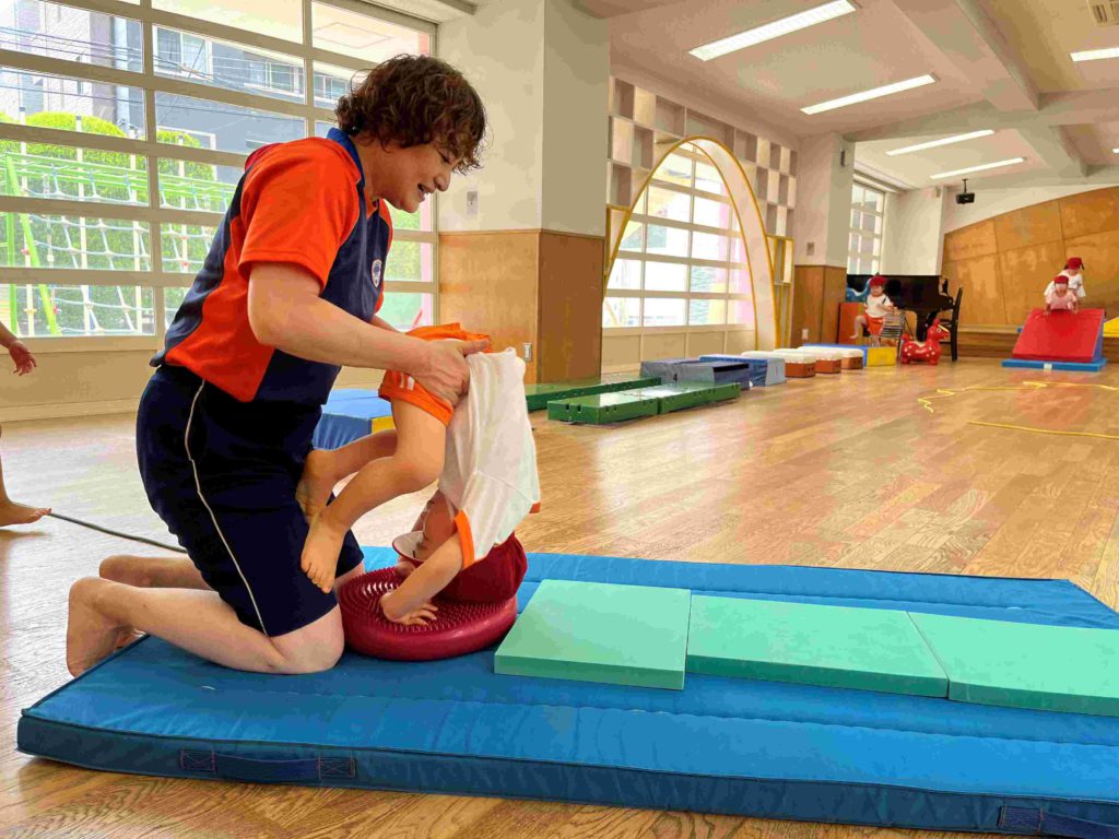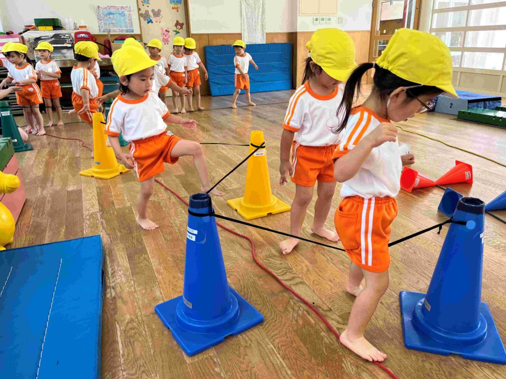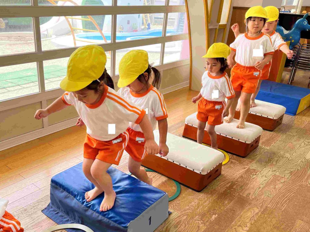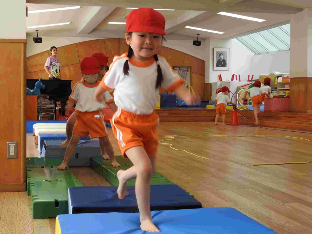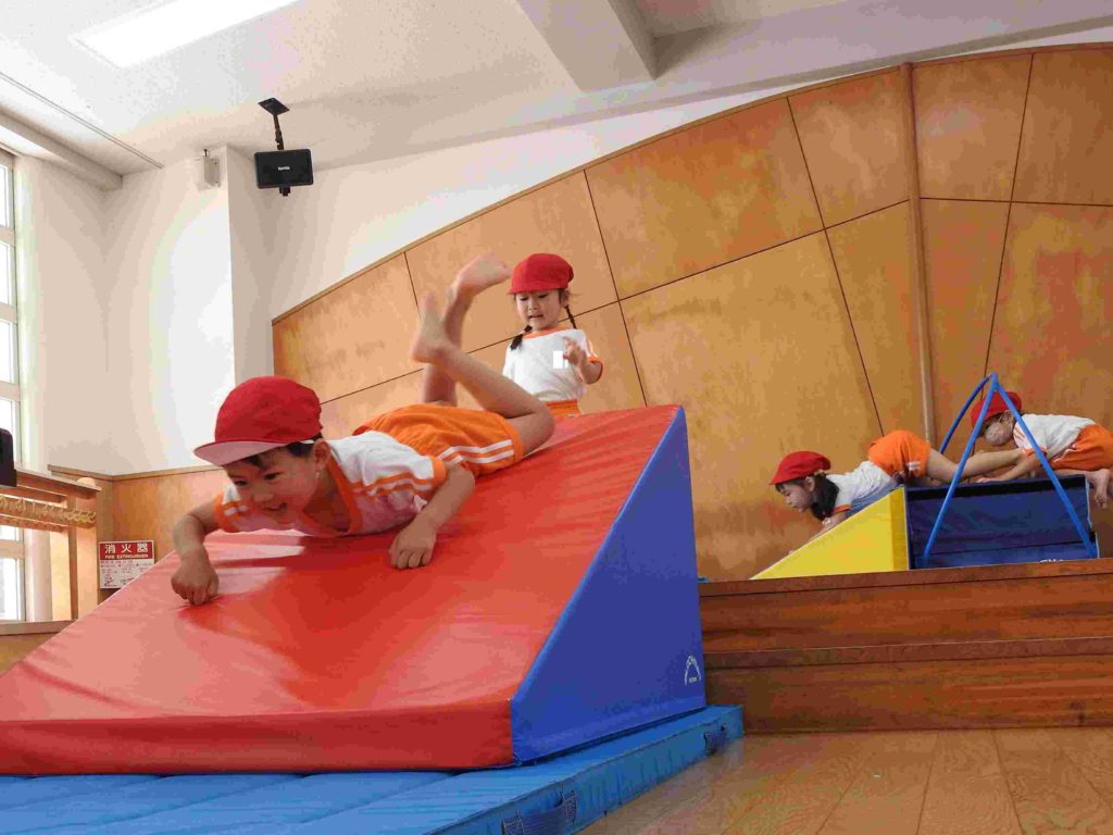 幼稚園に入園して、初めて講師の先生による体操教室を行いました。ジャンプ、ゴムをまたぐ、おへそをマットにつけて滑るなどの動きをしました。1234の色のついた数字を見つけてサーキットを行いました。また、補助をしてもらいながら前転も行いました。マットに手を着けておへそを見てくるりと回りました。「お家でも練習してみる!」と楽しく取り組むことができました。