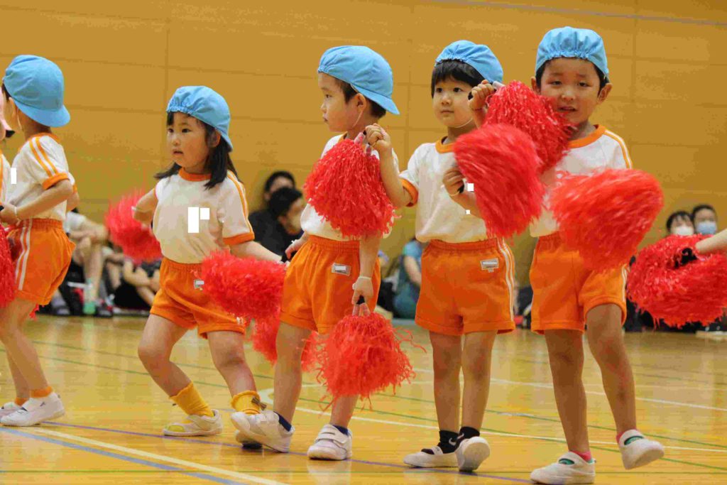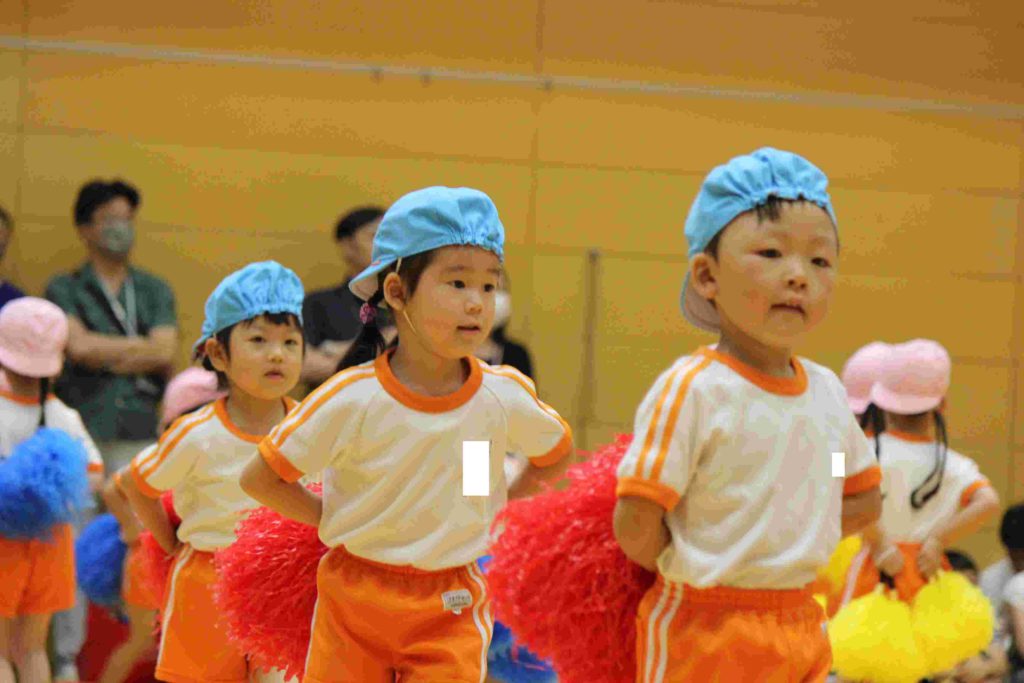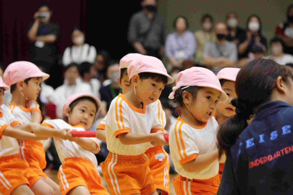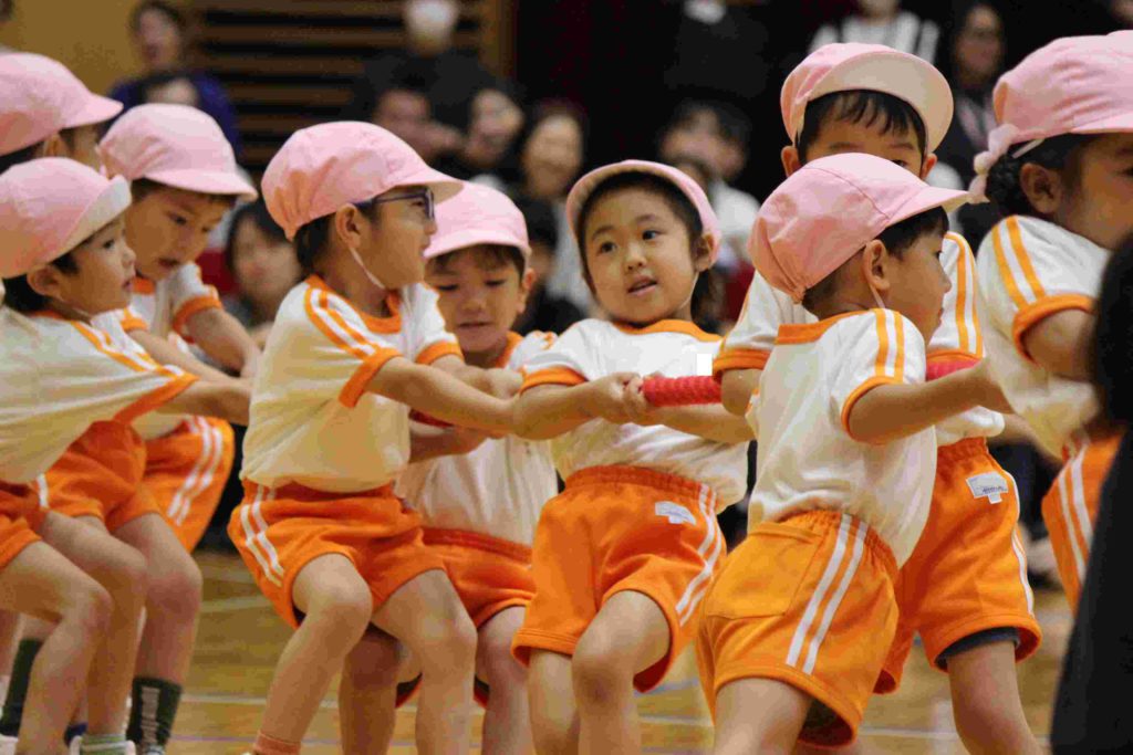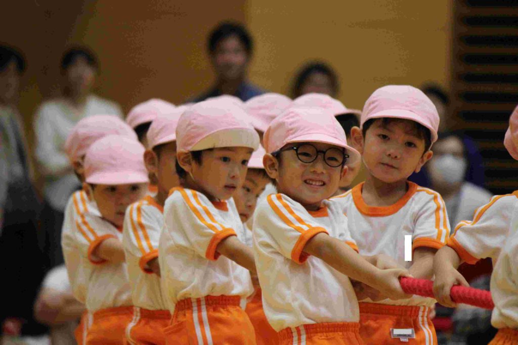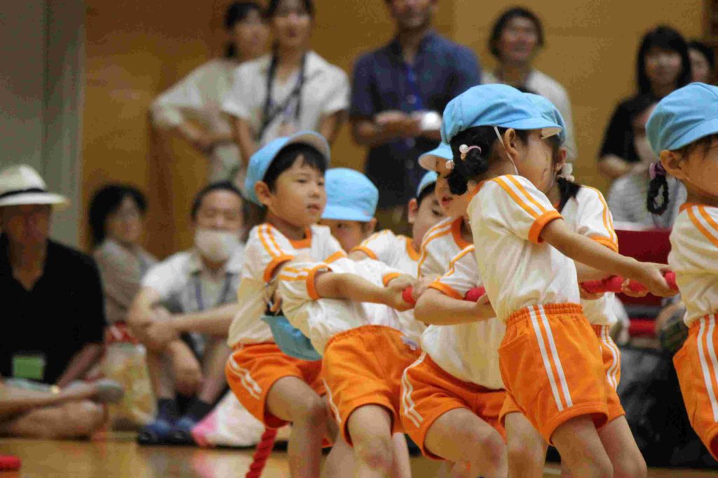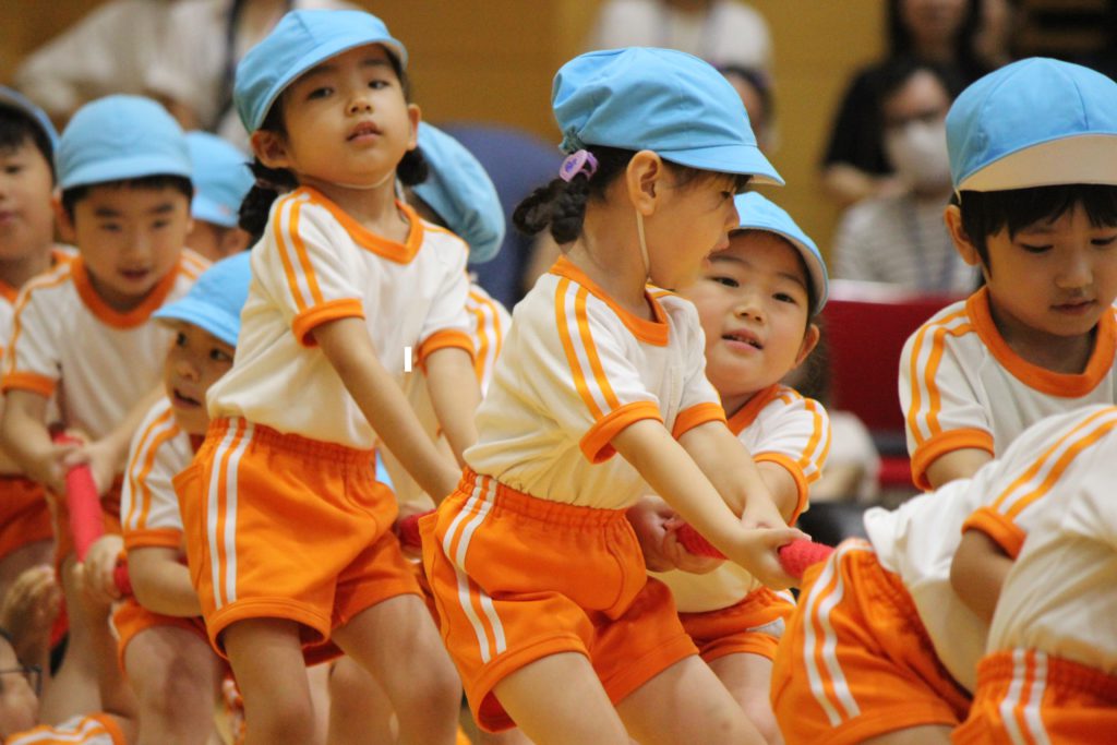 年中組も頑張りました。特に綱引きは大接戦。見ているほうも力が入りました。年中さんも一生懸命頑張る姿が格好良くて素敵でしたね。そんな姿を見て、胸がジーンとなり目頭があつくなりました。