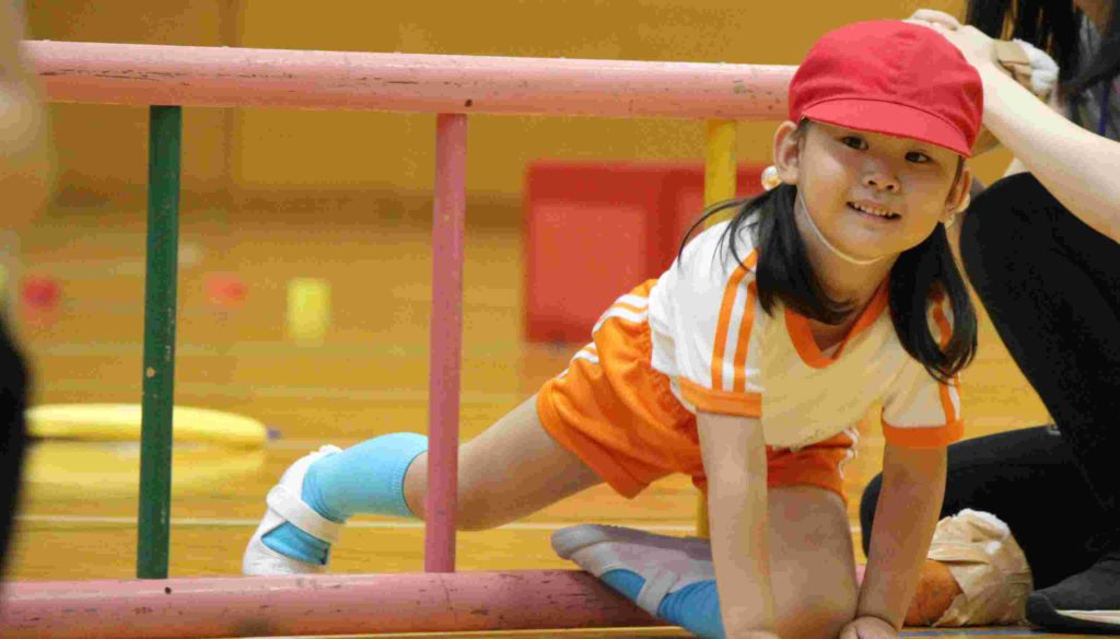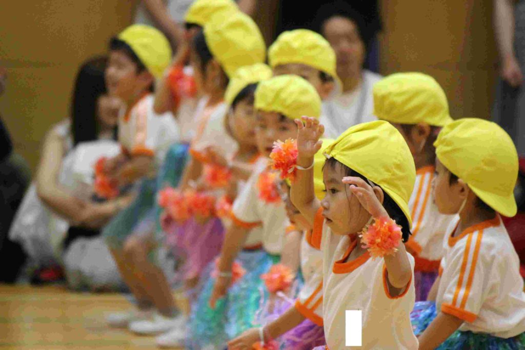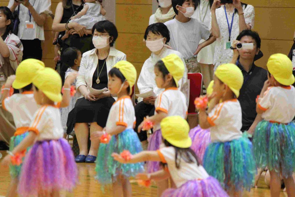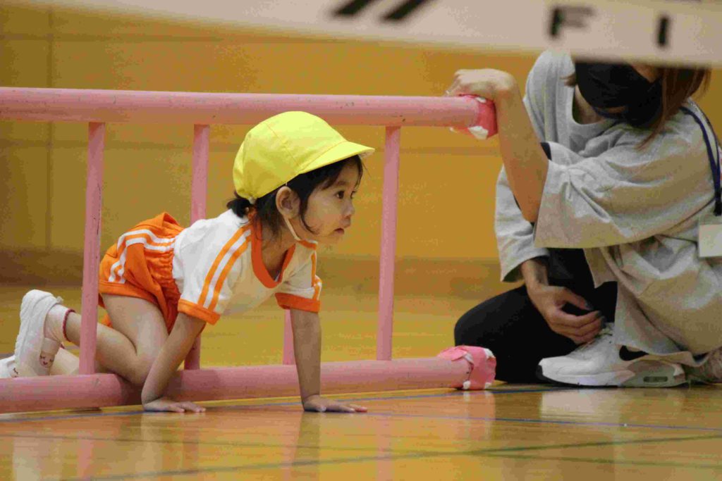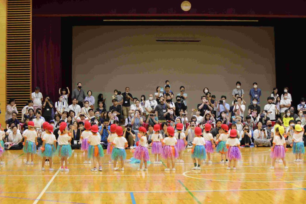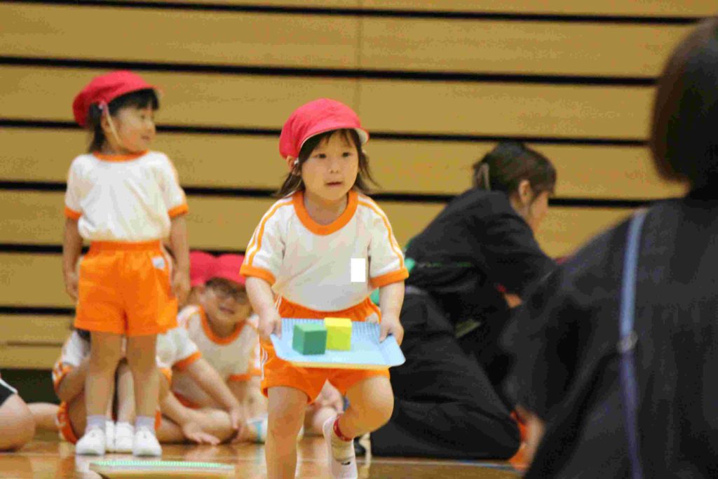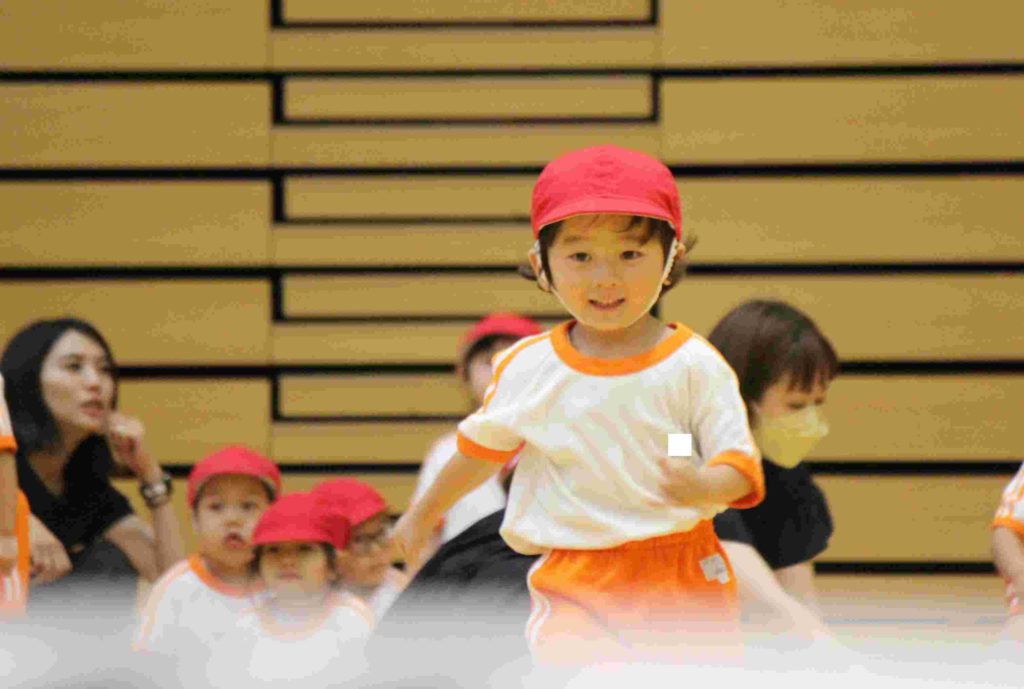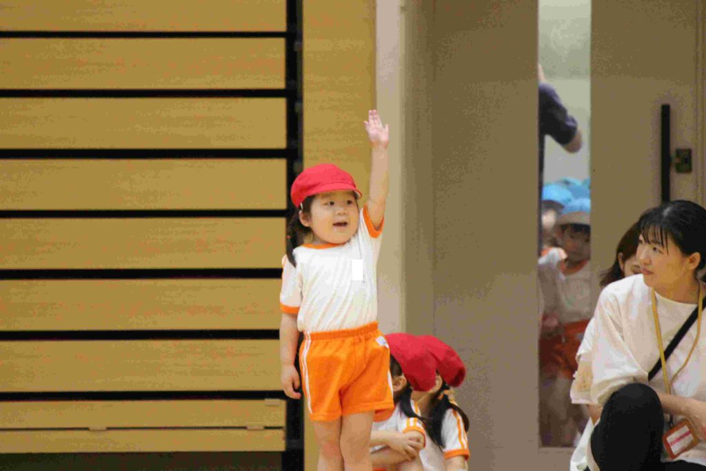 年少組にとっては、初めての運動会。最初はかけっこも戸惑ってしまい、スタートができなかったり、ゴールテープの手前で止まってしまったり…。それが本番では、しっかりと手を挙げて返事をする園児もたくさんおり…走りだすと速い、速い。応援にいらした理事長先生と園歌を作詞なさった秋田先生もニコニコ顔で園児を見守ってくださいました。初めてのお遊戯も楽しくできました。運動会を通してすっかりたくましくなった年少組です。