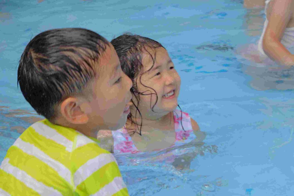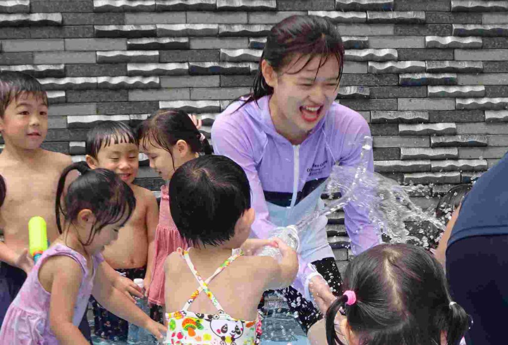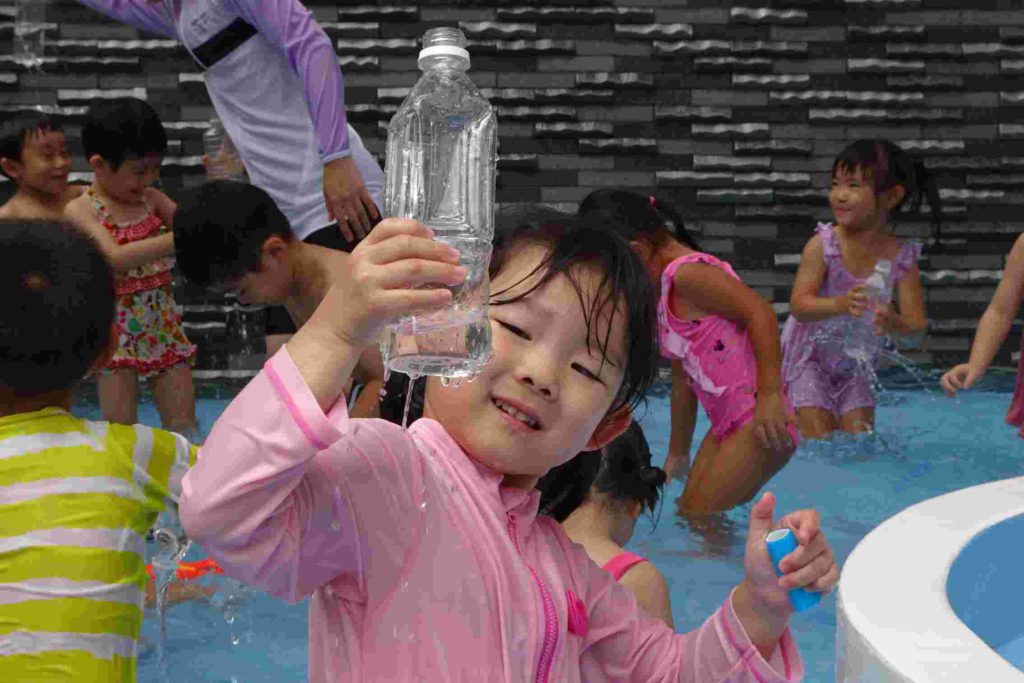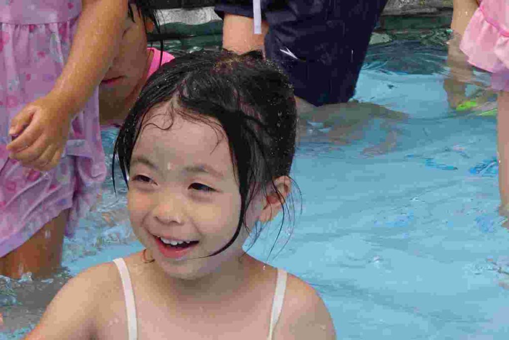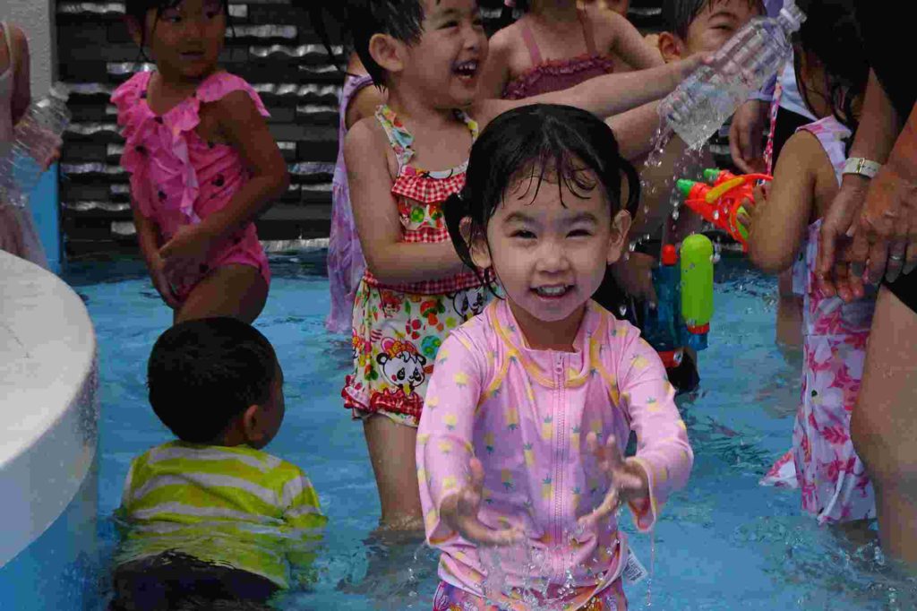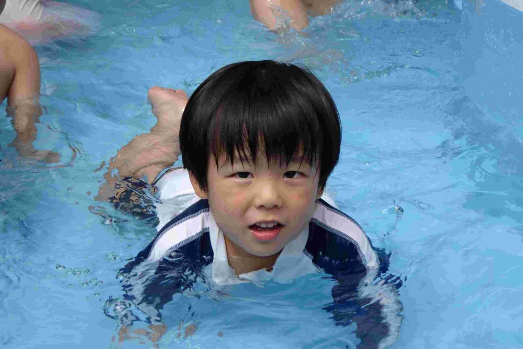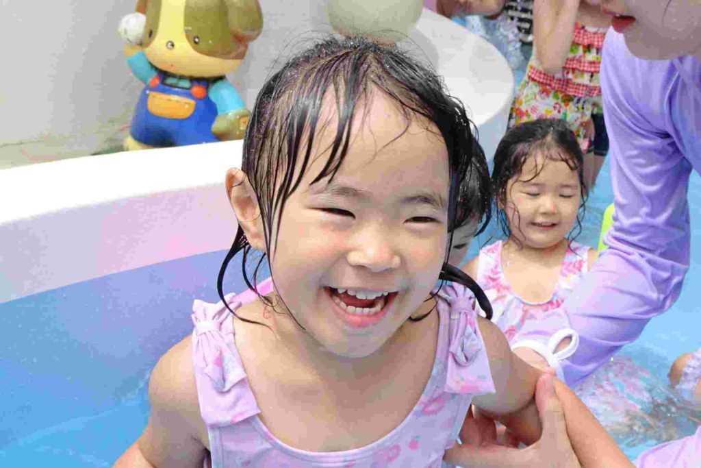 今日は雲が多く、時折太陽が顔を出すお天気でしたが、プールを実施しました。年少さんの中にはプールが初めてという子もいて、最初はおそるおそるでしたが、だんだん水にも慣れてきて楽しく遊ぶことができました。担任の先生とも水のかけ合いっこをして盛り上がっていました。