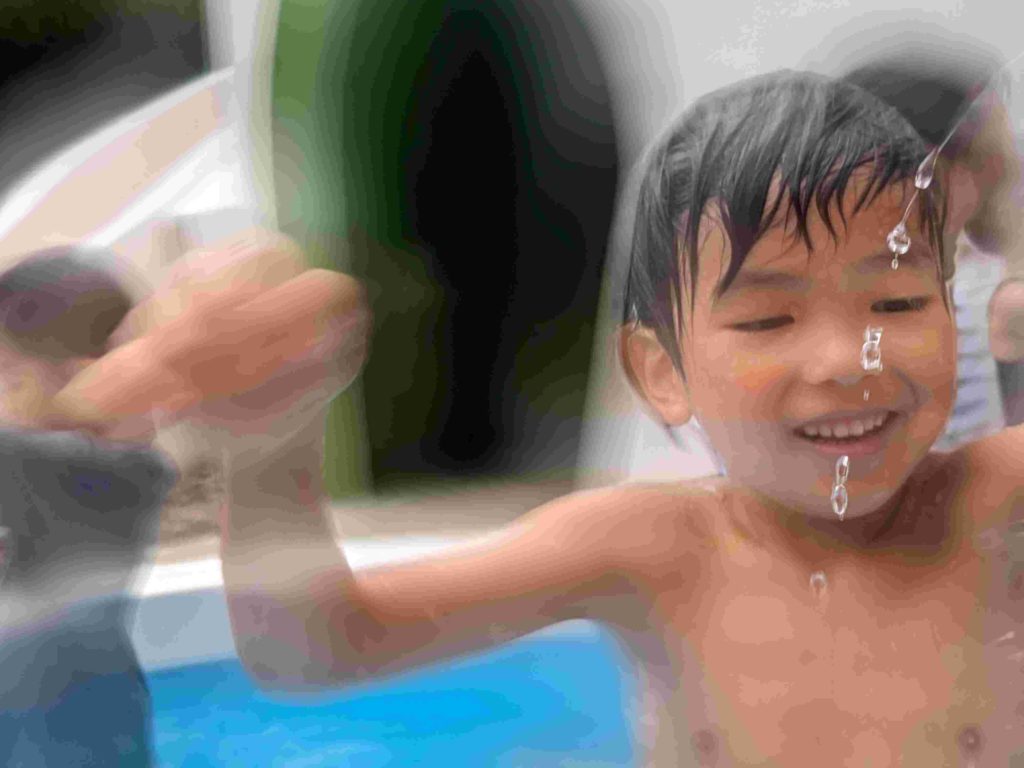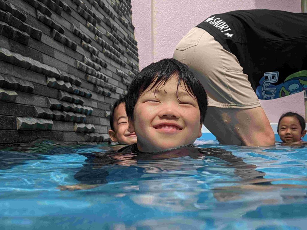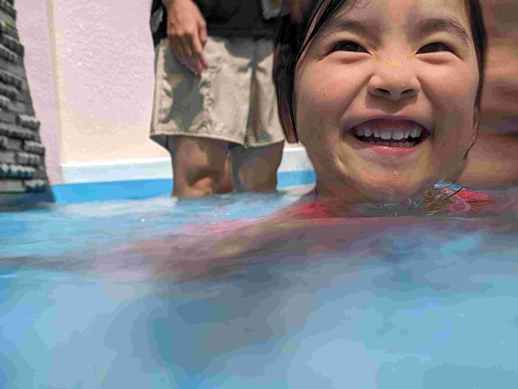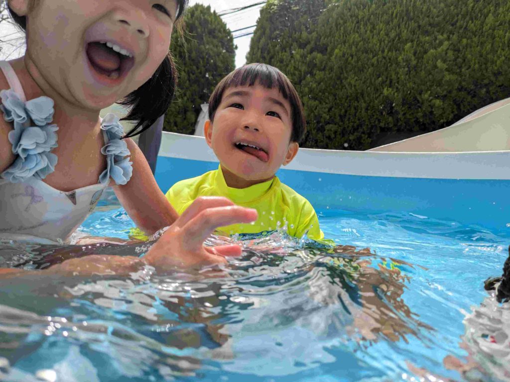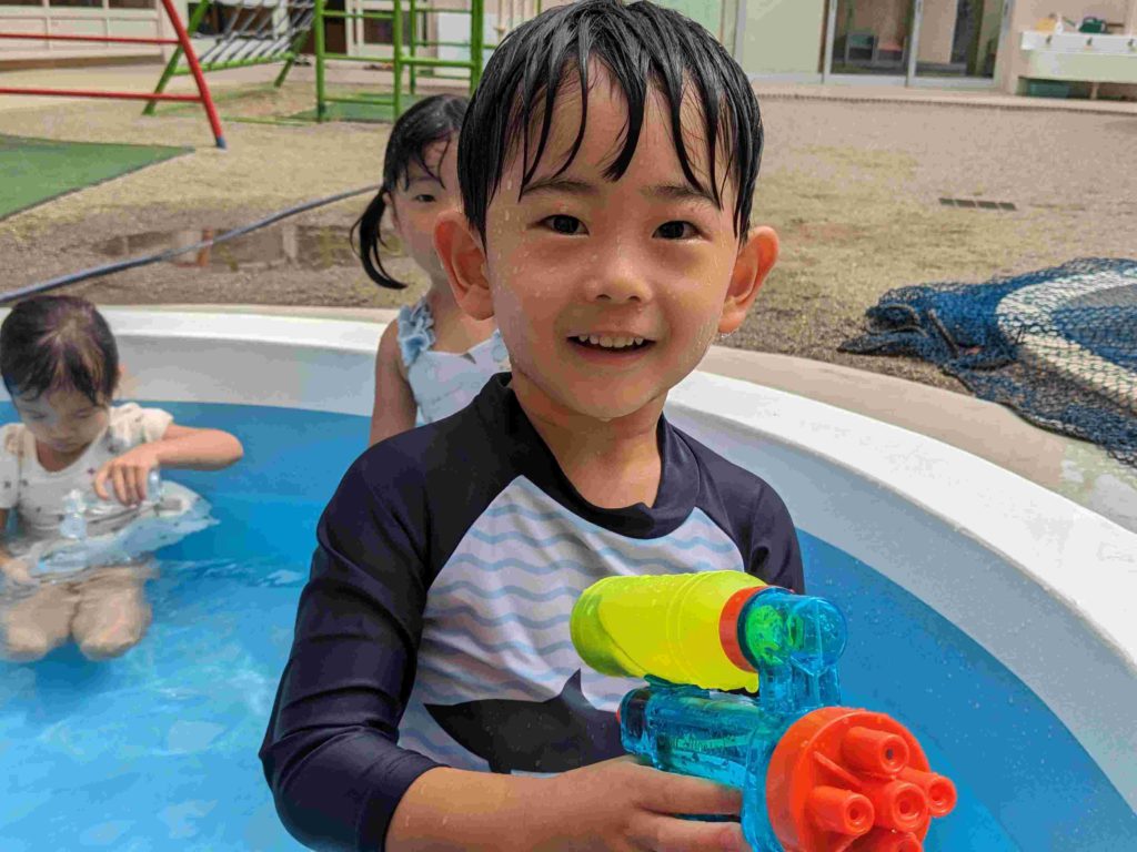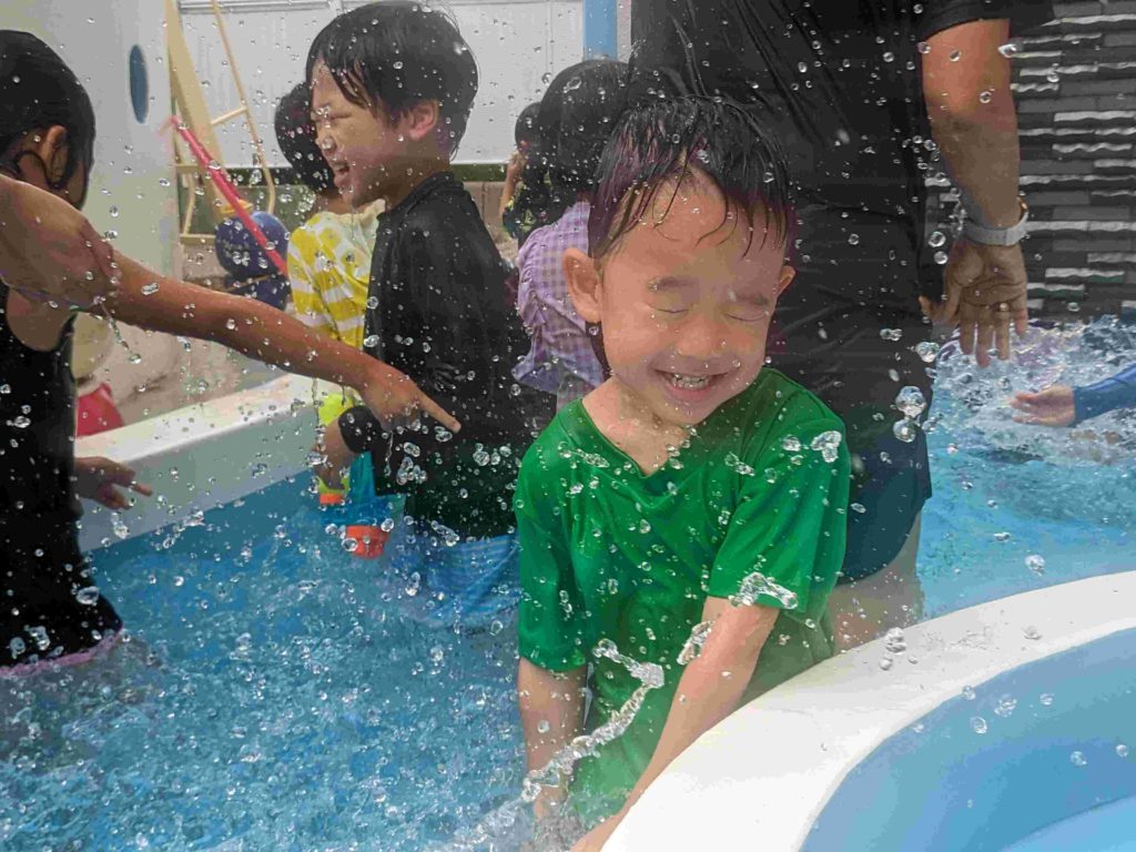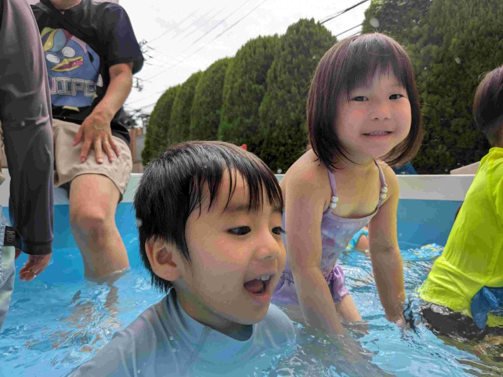 今日は2回目のプールでした。水にもかなり慣れてきて、顔に水がかかることにも平気になってきています。中には水にもぐれる子もいてびっくりします。子どもたちが元気に水遊びをする様子を見て、来年は7月にプールをやりたいと改めて思いました。