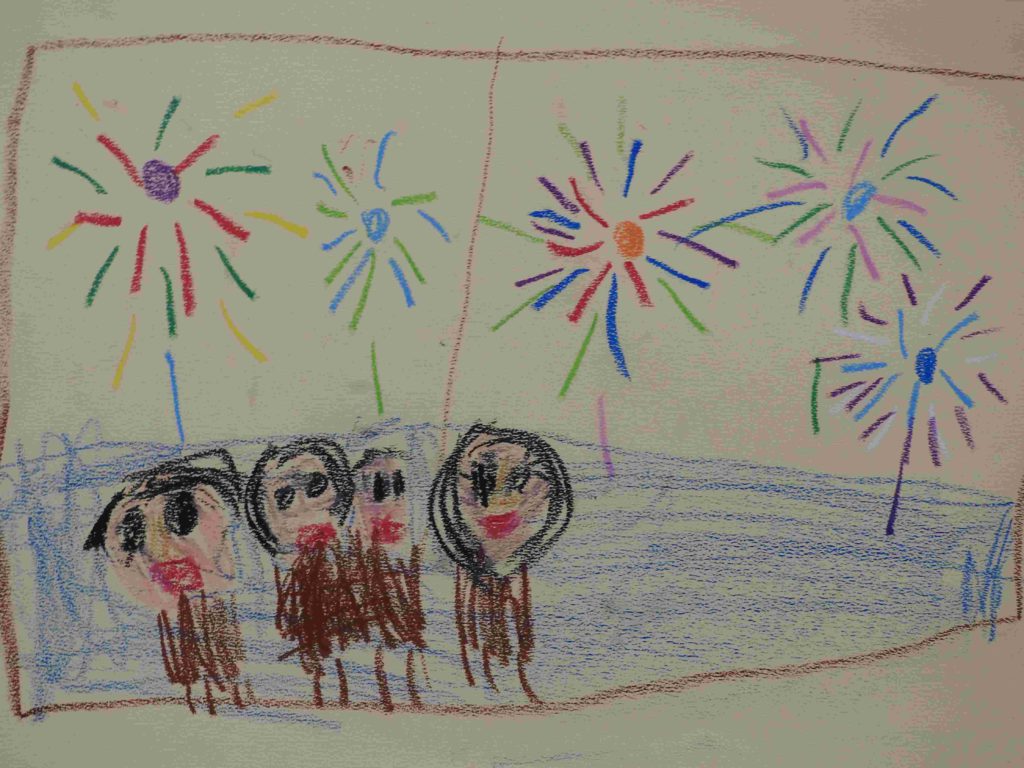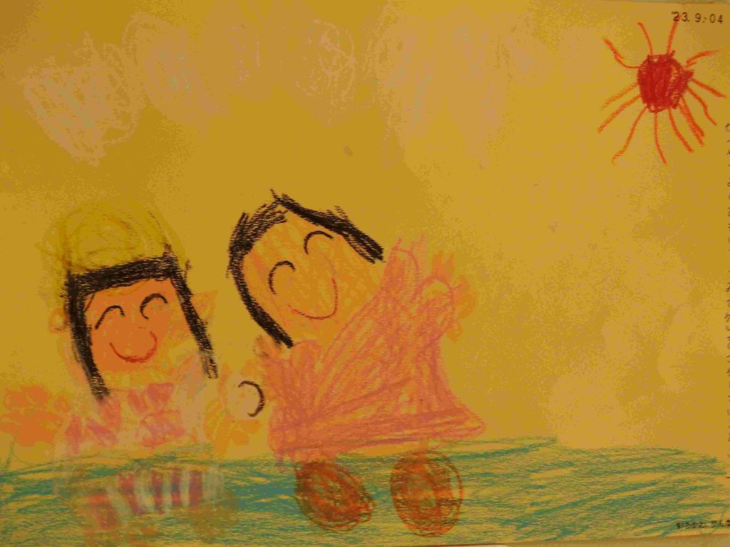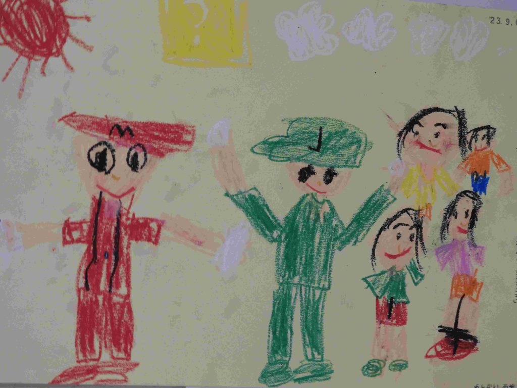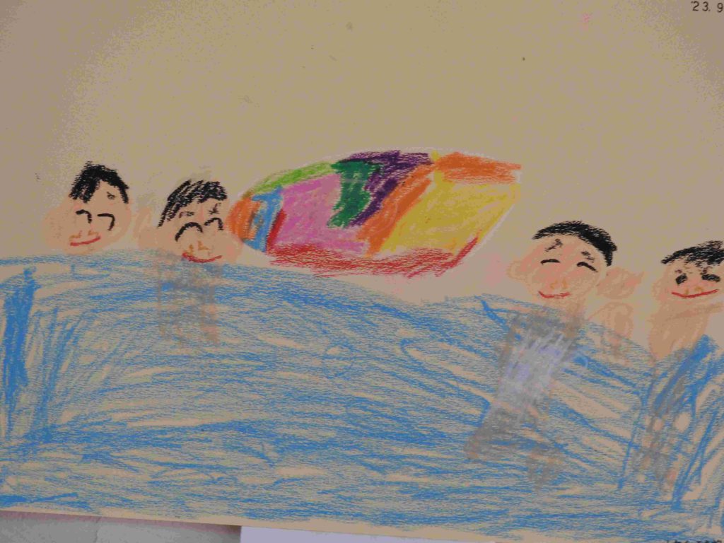 夏休みの思い出を画用紙いっぱいに描きました。年長組の絵です。ニコニコ顔があふれんばかりで、楽しかった様子がよく伝わってきます。色をたくさん使って丁寧に描きました。
