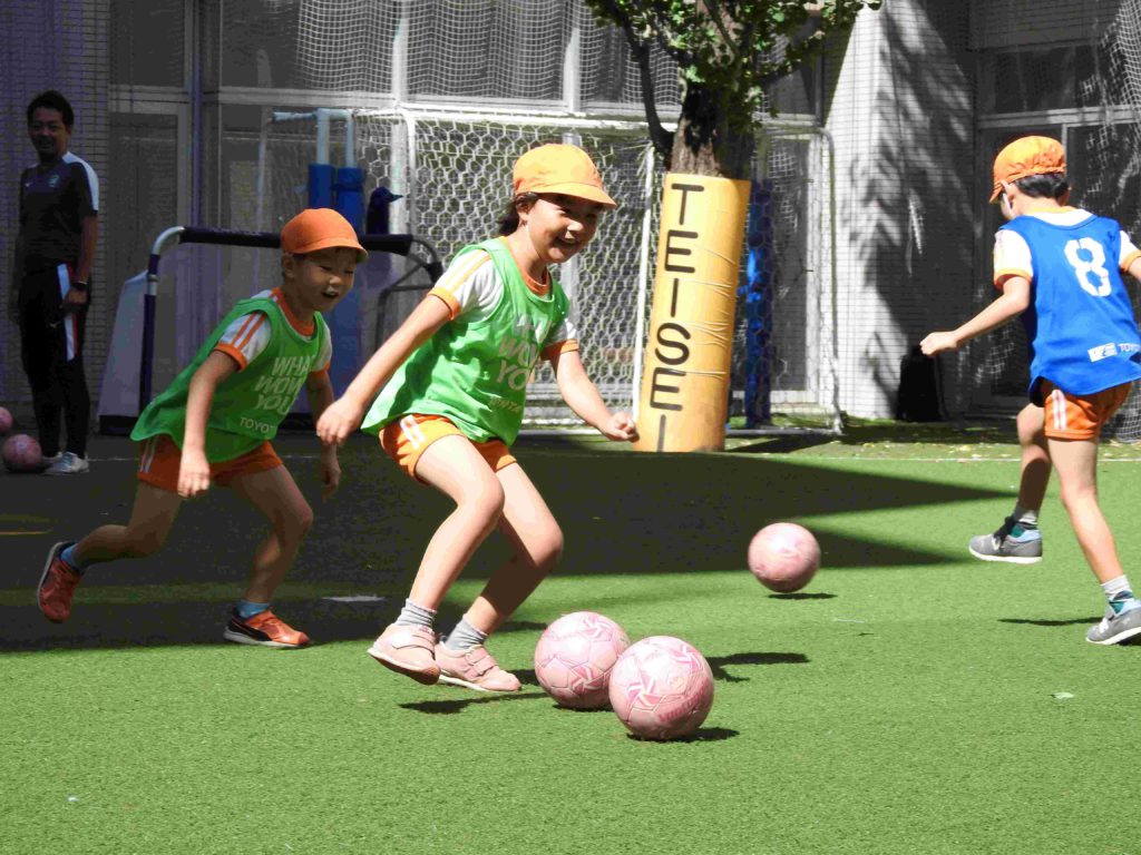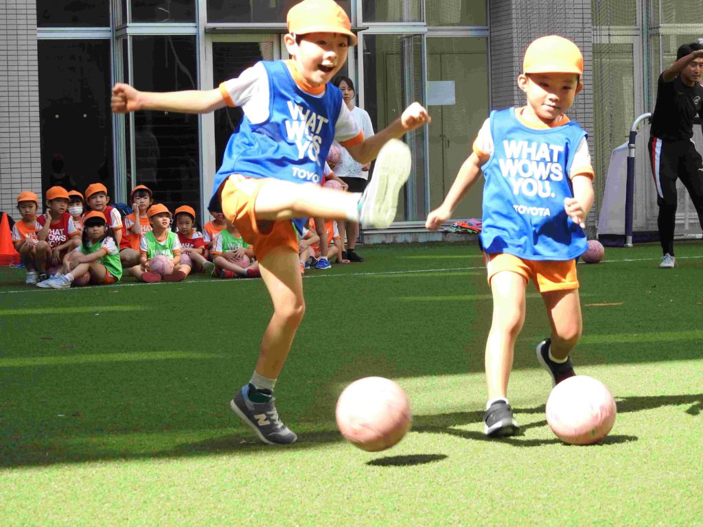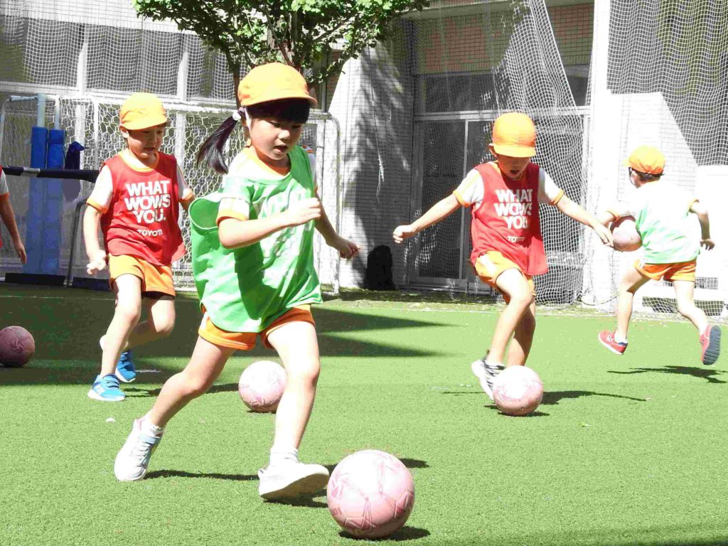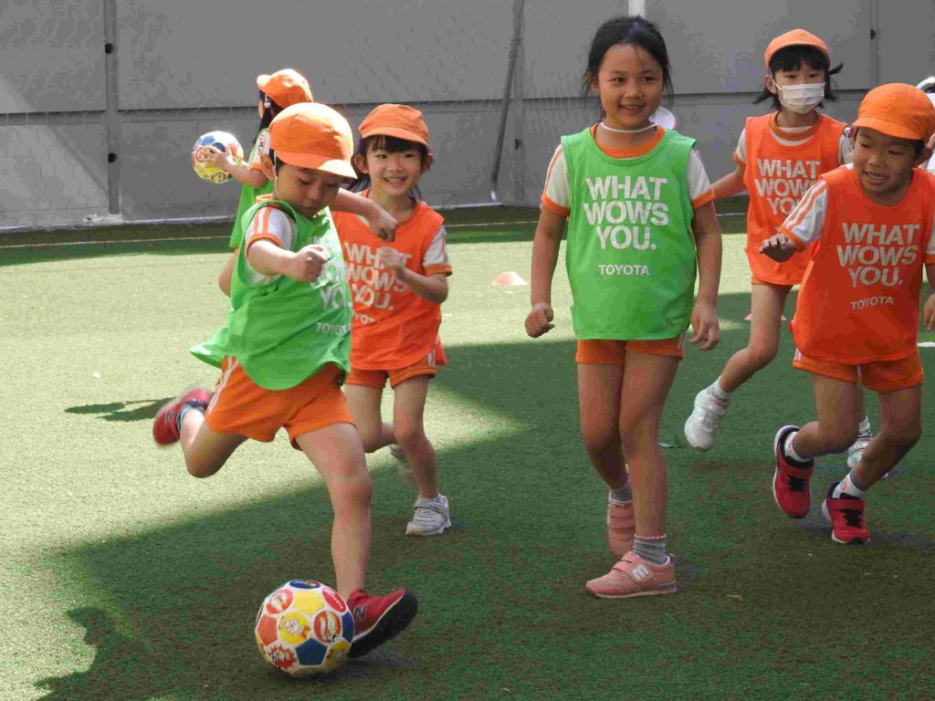 今日は年長組の「サッカー教室」でした。東京都サッカー協会の方と三菱養和サッカースクールのコーチが指導にいらっしゃいました。普段、サッカーに触れる機会が少ない子どもにも優しく丁寧に教えてくださるため、みんなが楽しくサッカーに取り組むことができました。この中から将来のサッカー選手が出てくるでしょうか。