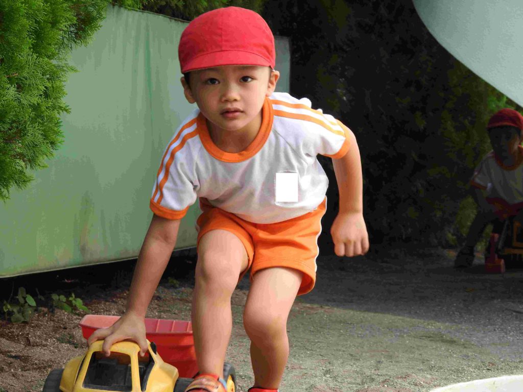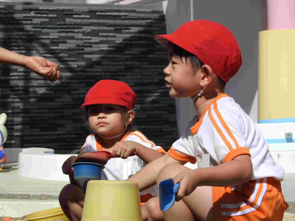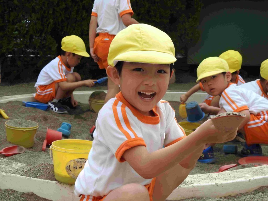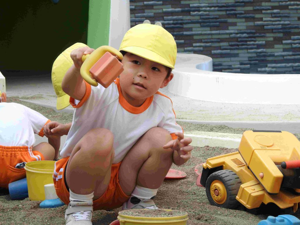 今日は年少組の自由遊びの様子です。今日も砂場が人気スポットでした。一心不乱に道具を使っている様子は、砂場の芸術家であるかのようです。