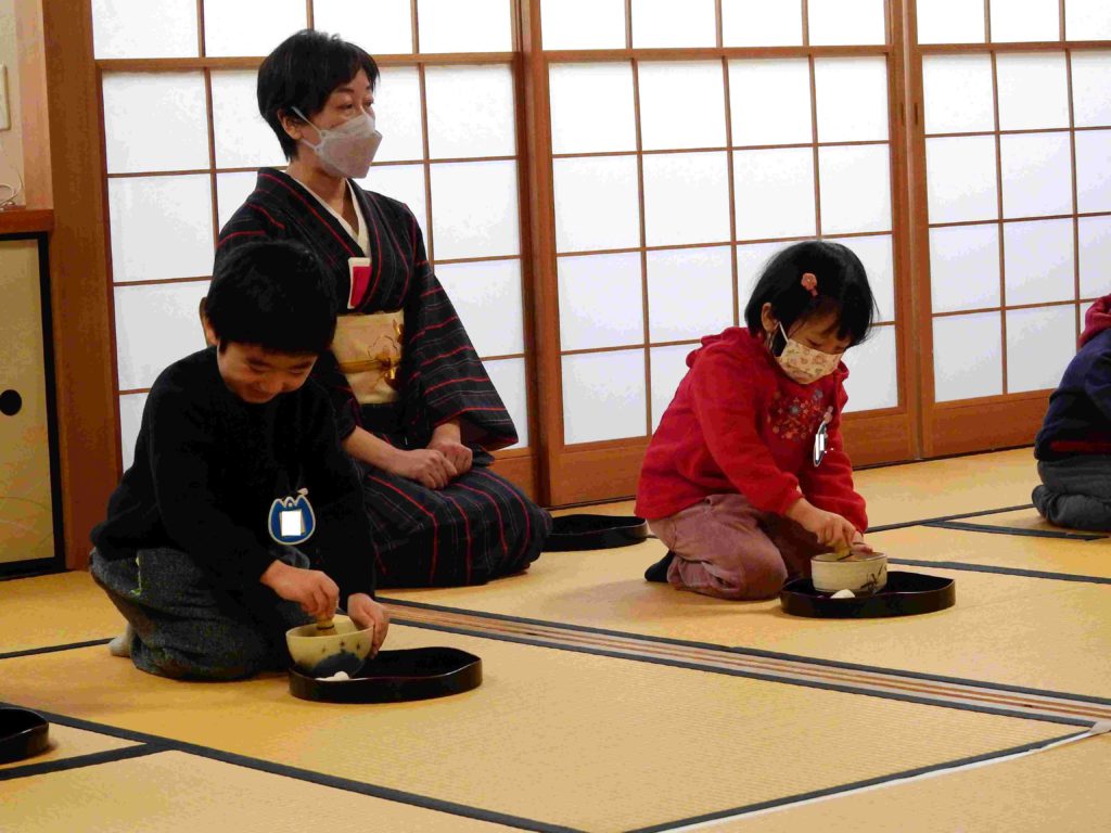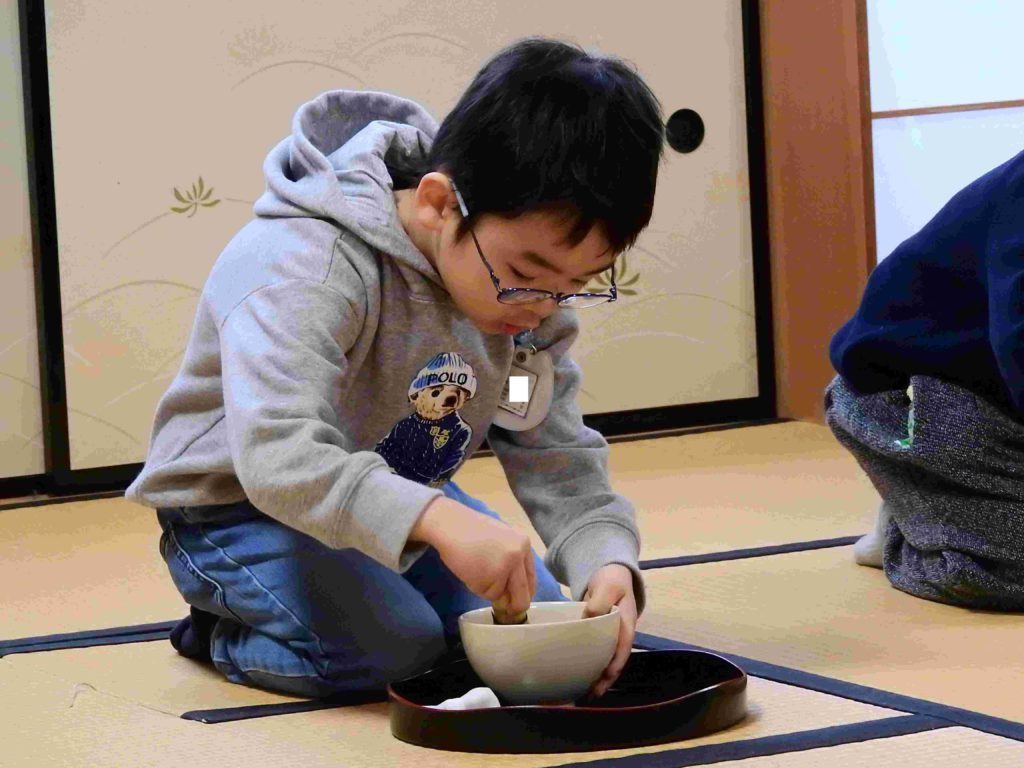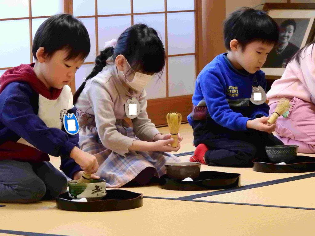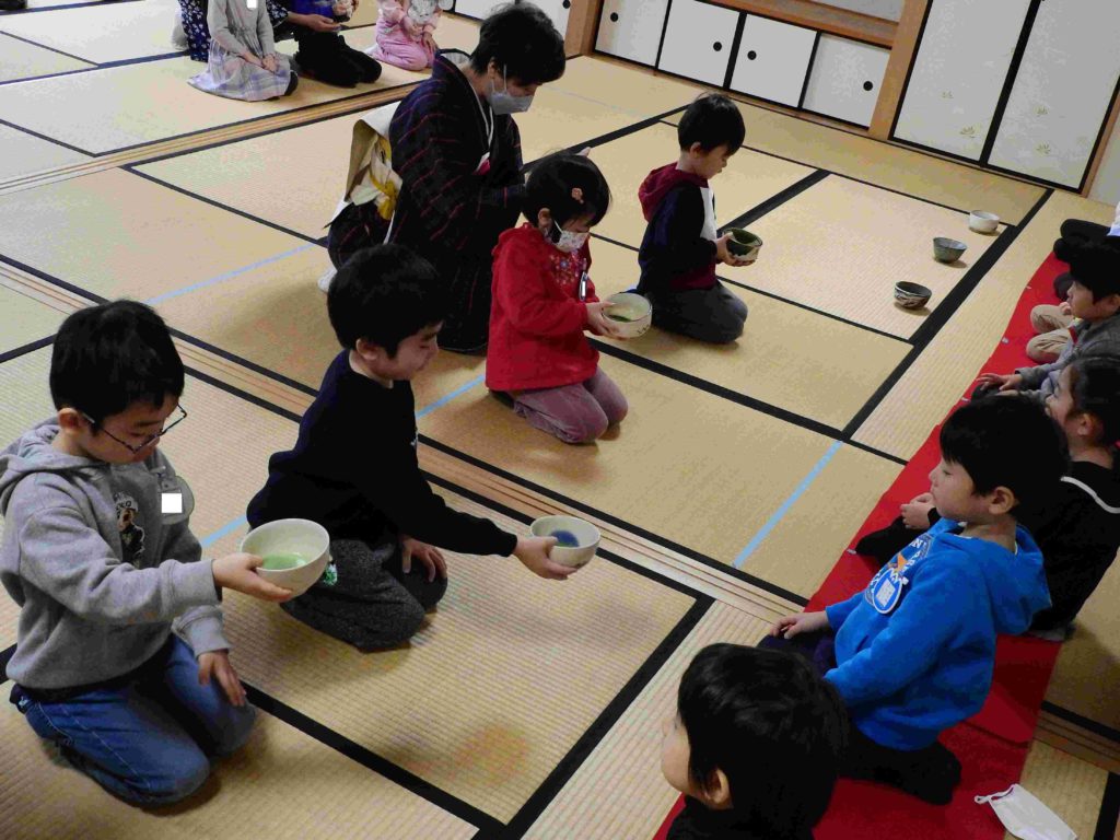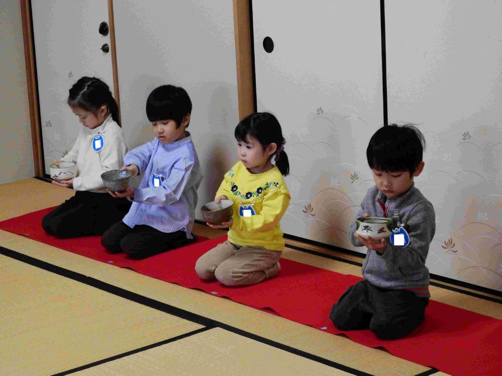 年中組の様子です。来週、保護者を招待して「お茶会」を行います。その予行練習の意味合いもあり、今日は「お友だちへのお茶会」を行いました。これまで学んできた作法をしっかりと生かしています。小さいけど立派な日本文化の継承者です。