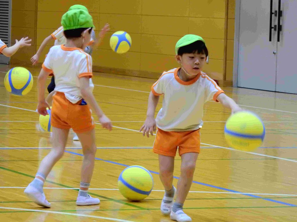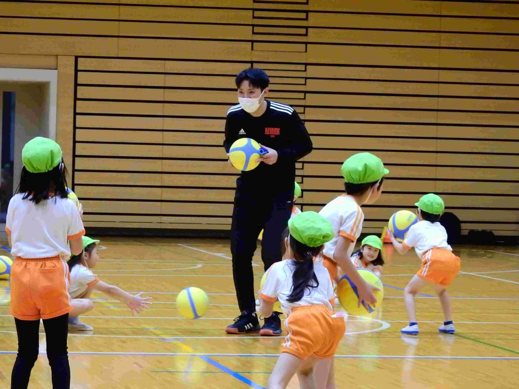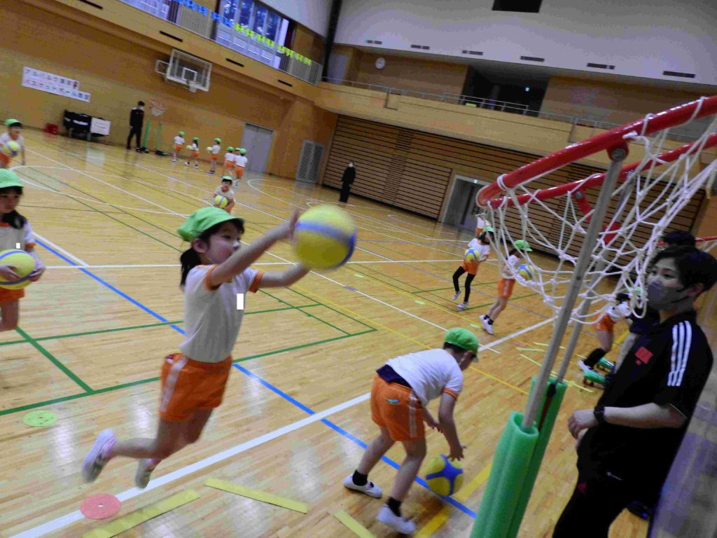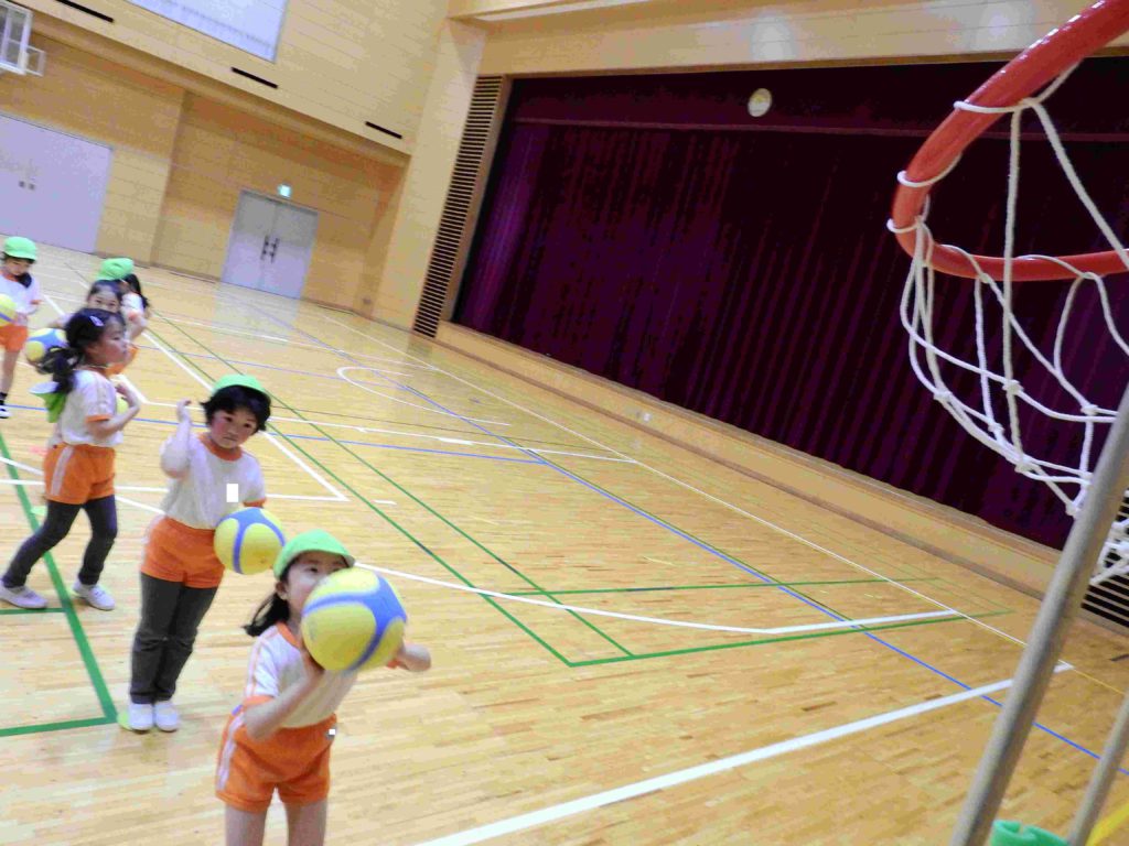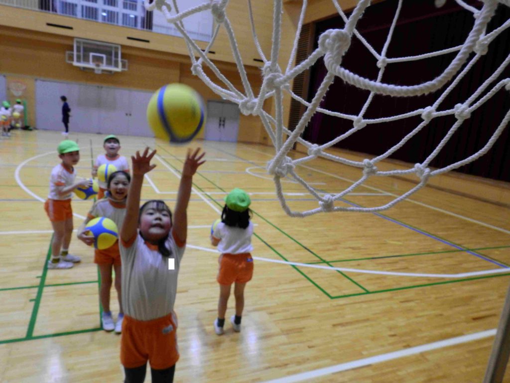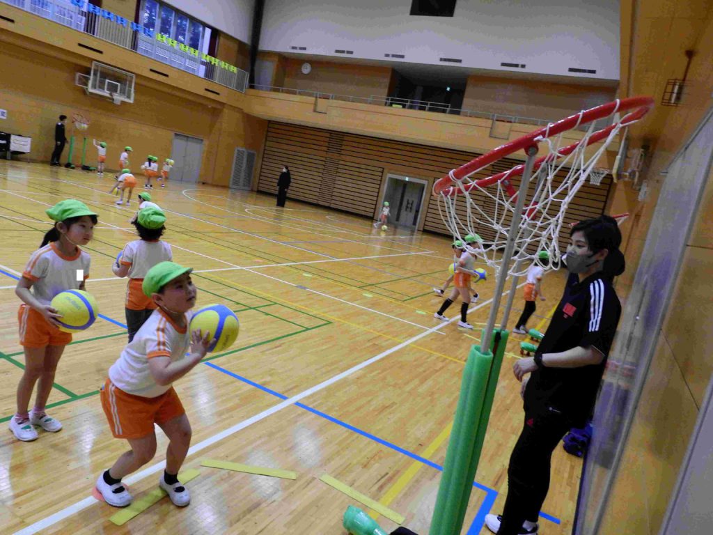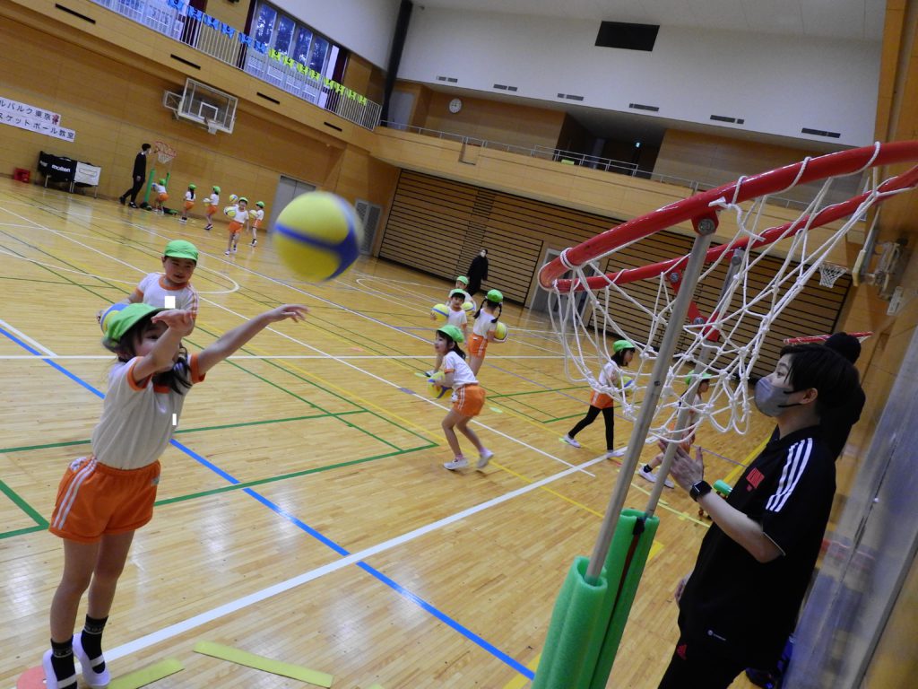 今日は幼稚園に「プロバスケットボールBリーグ アルバルク東京」のコーチをお招きして「バスケットボール教室」を行いました。中学高校の広い体育館を使い、子どもたちは初めてのバスケットボールを思いっきり楽しみました。ボールもゴールも子ども向けの物を使いました。コーチの指導で子どもたちはみるみるうちに上達していきます。ジャンプシュートもできるようになった子もいます。貞静幼稚園では、子どもたちが様々なスポーツに触れるチャンスを作りたいと考えています。