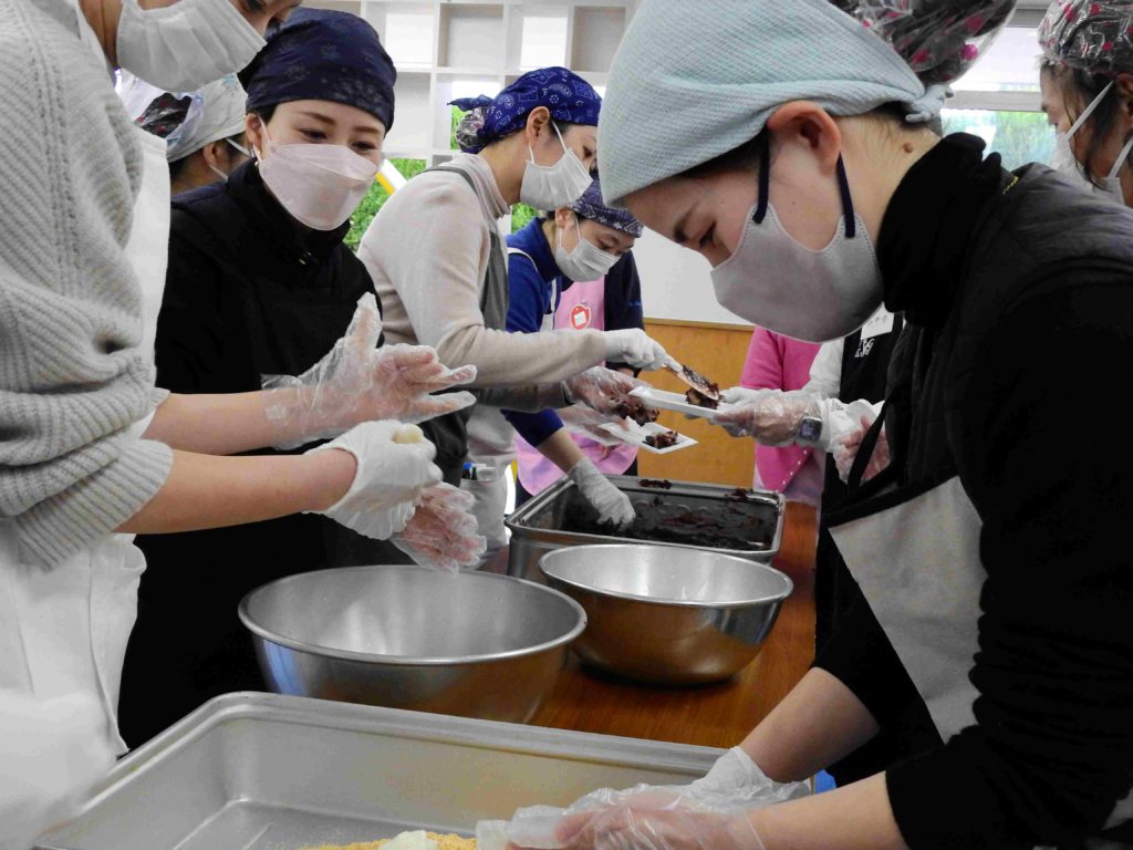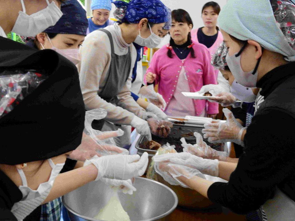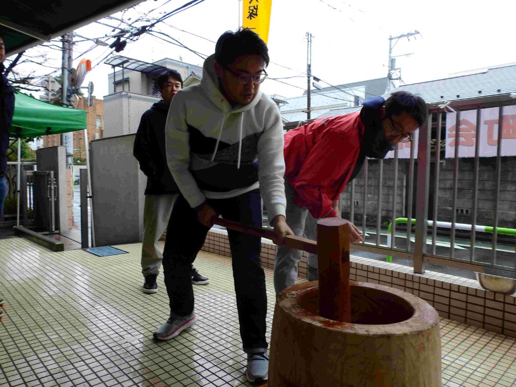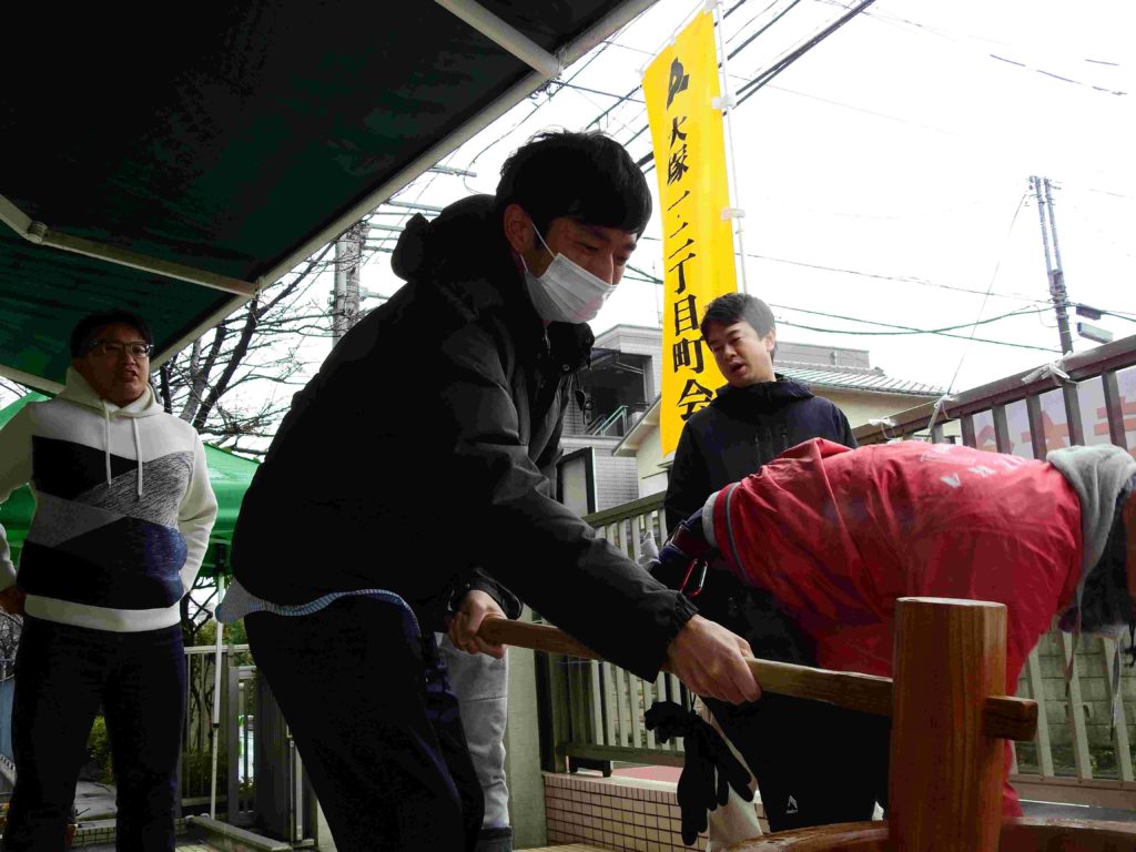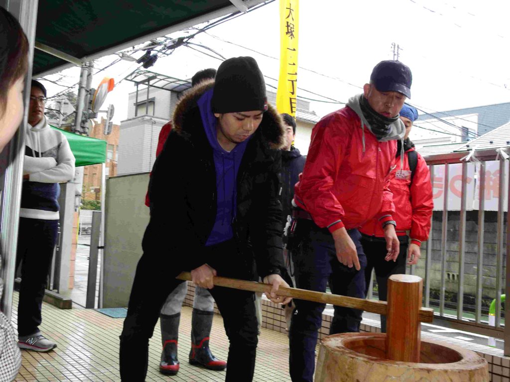 大塚一・二丁目町会の協力を得てもちつき大会が実現しました。ボランティア保護者の方々の力もお借りしていよいよ始まりです。