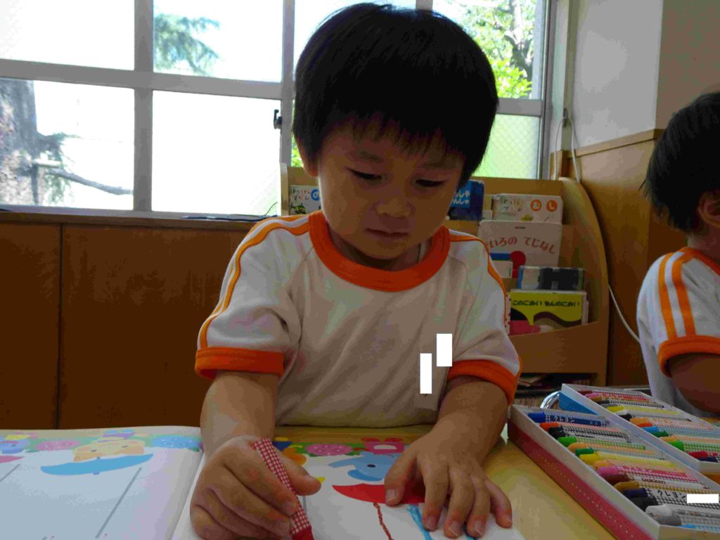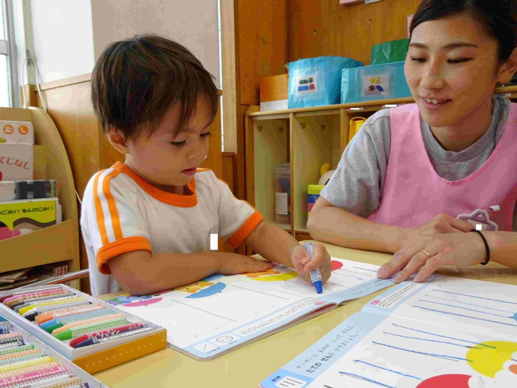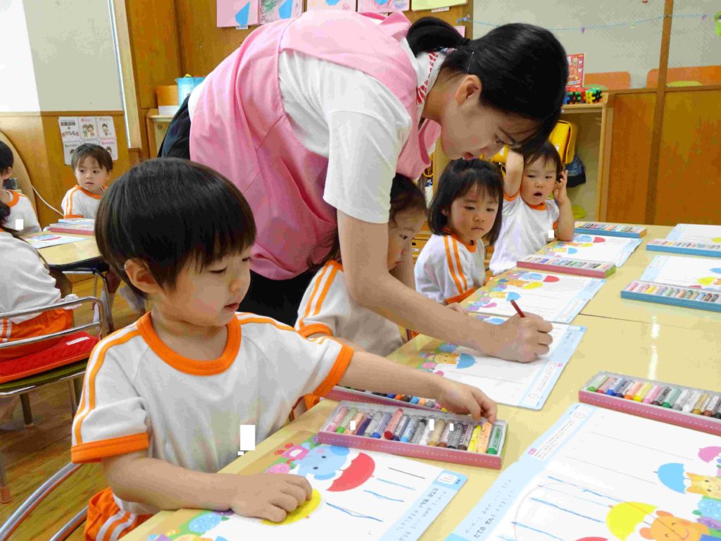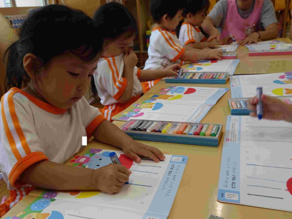 文字を描くことの導入として、年少組では「線を引く」活動に取り組んでいます。クレヨンの持ち方、線の引き方も先生からの支援があります。終わった子は先生から◎をもらってうれしいです。