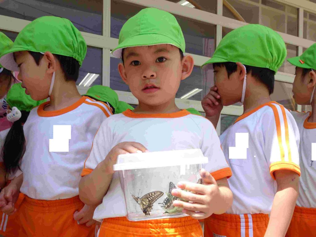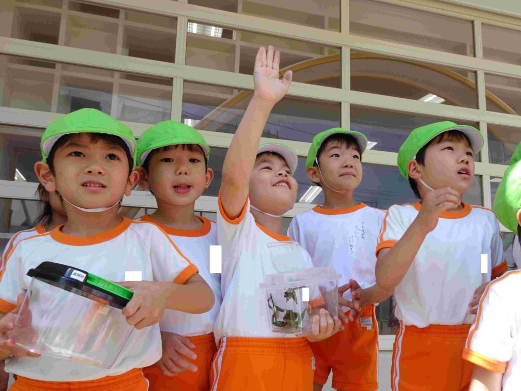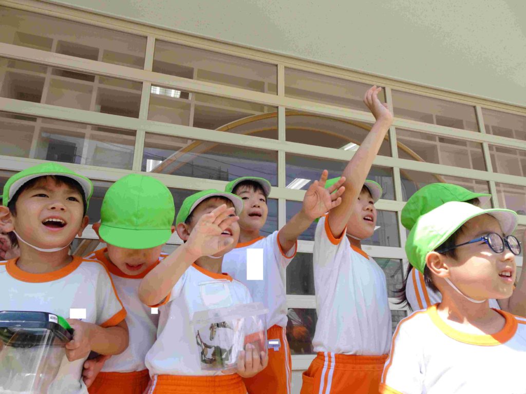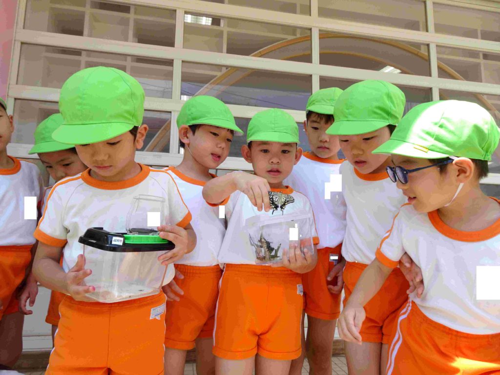 「元気に飛んでいって!」年長組の部屋で見守っていたアゲハチョウのさなぎが羽化しました。みんなで空に飛び立っていくのを手を振って見送りました。