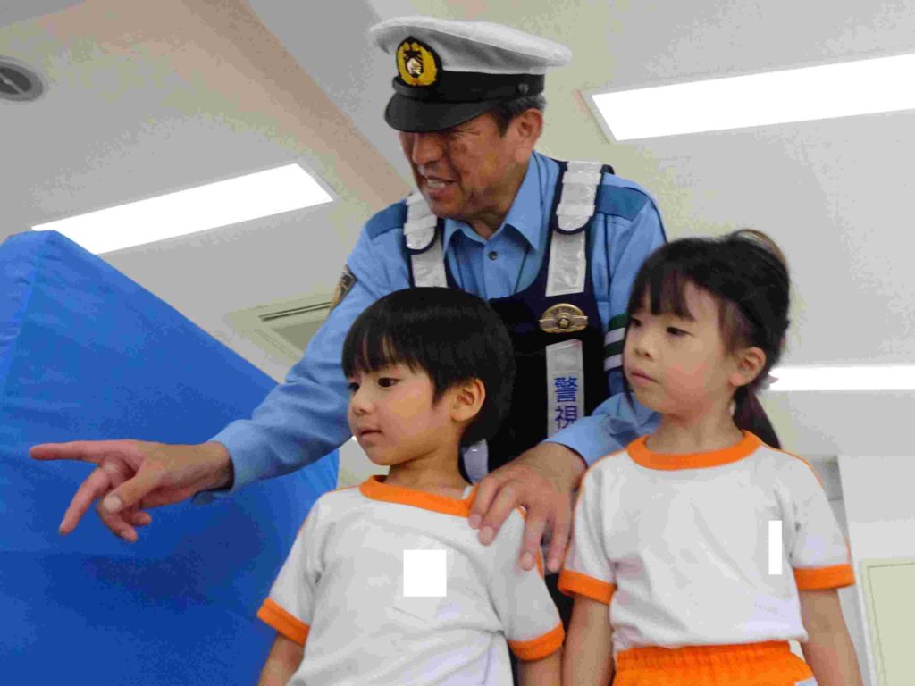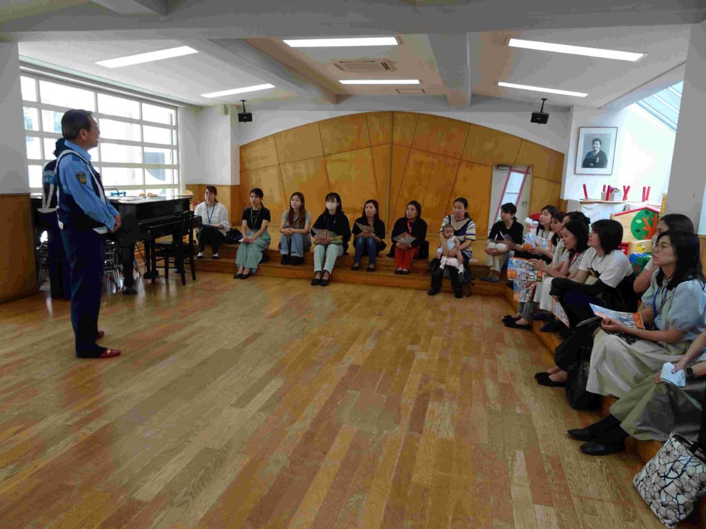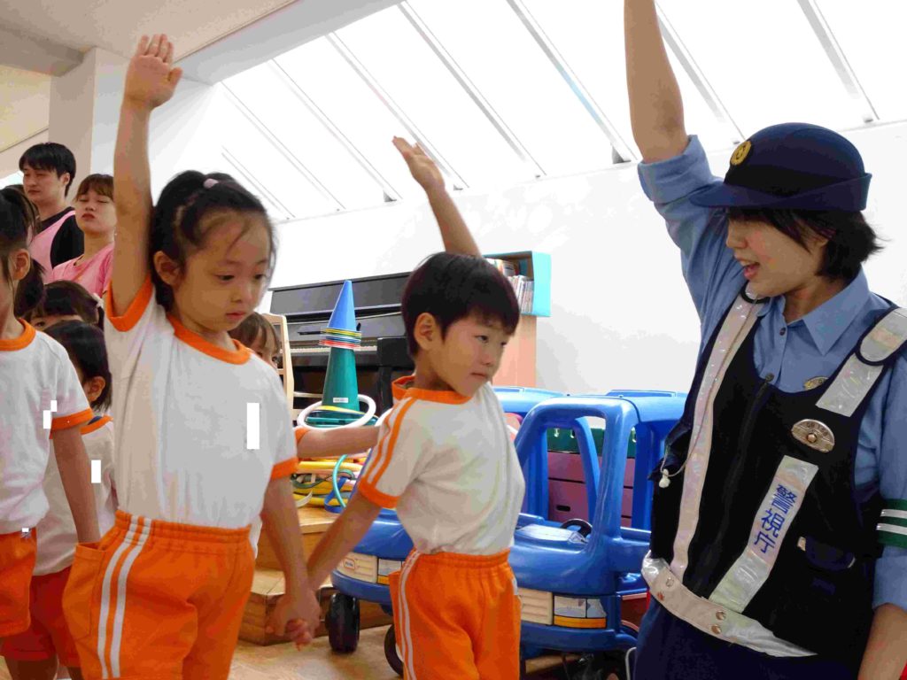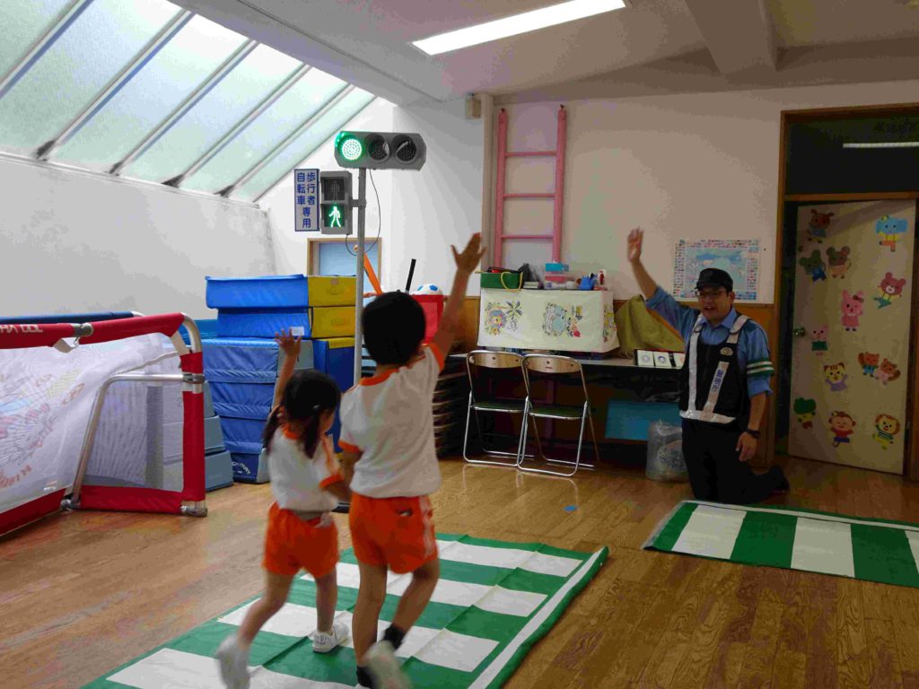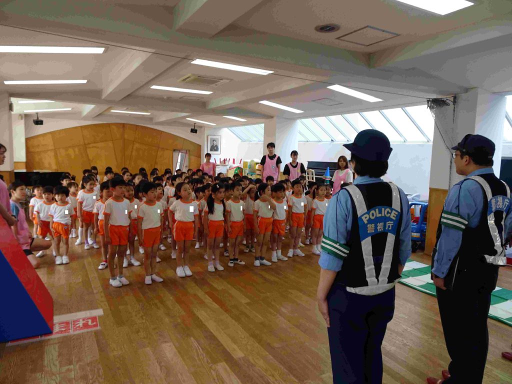 大塚警察署の協力を得て行いました。はじめに今年度入園の保護者の皆さまを対象として、交通安全、特に自転車の乗り方についてお話をしていただきました。後半は園児に向けてのお話の後、交差点の安全な渡り方を学びました。年少さんは年長のお兄さんお姉さんと一緒に歩いて学びました。年長さんは優しい心遣いで年少さんの手を引いていました。
