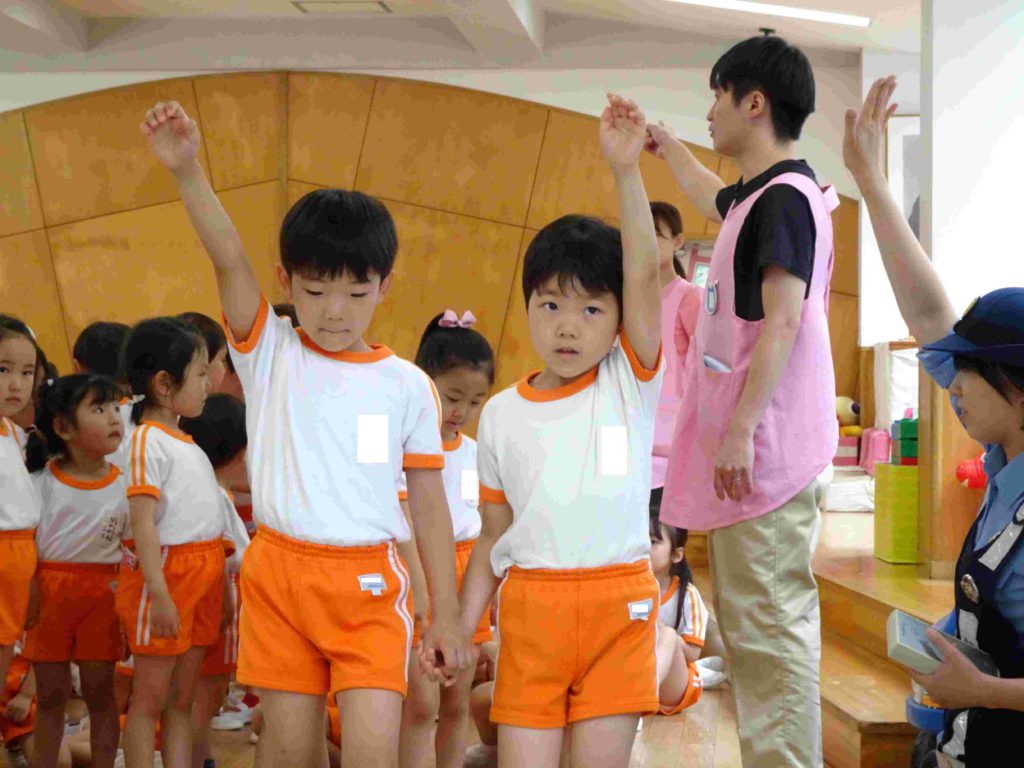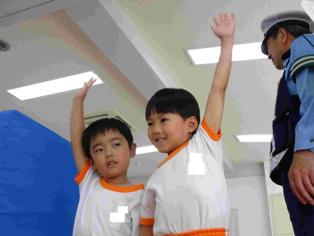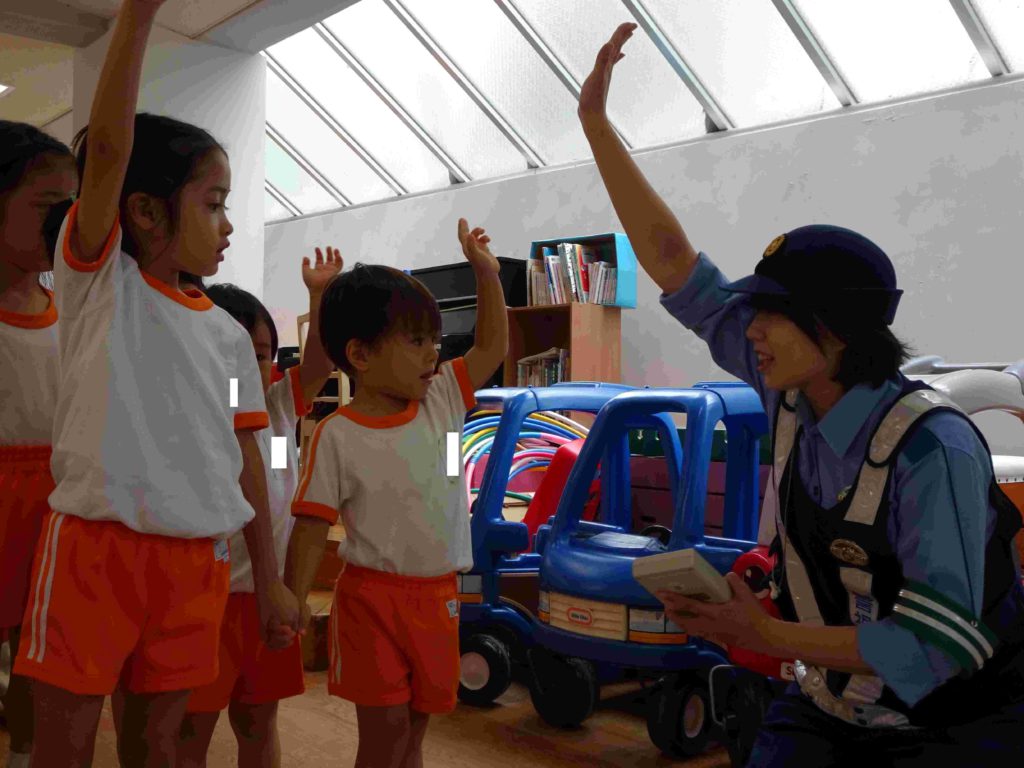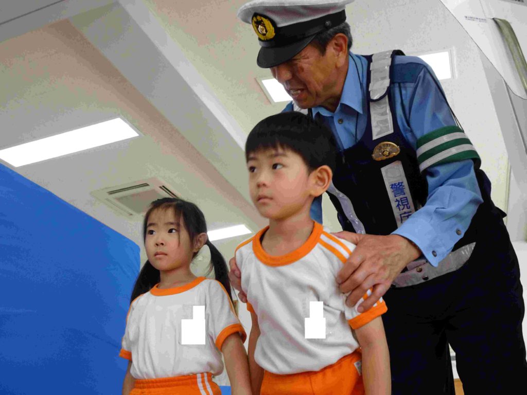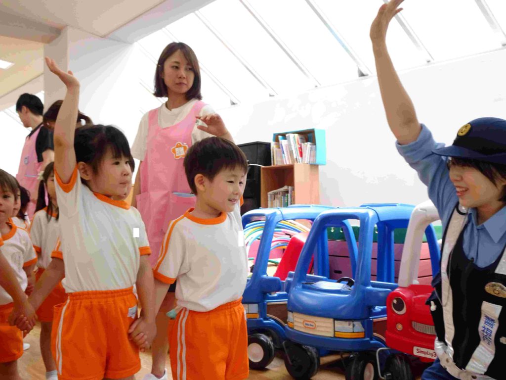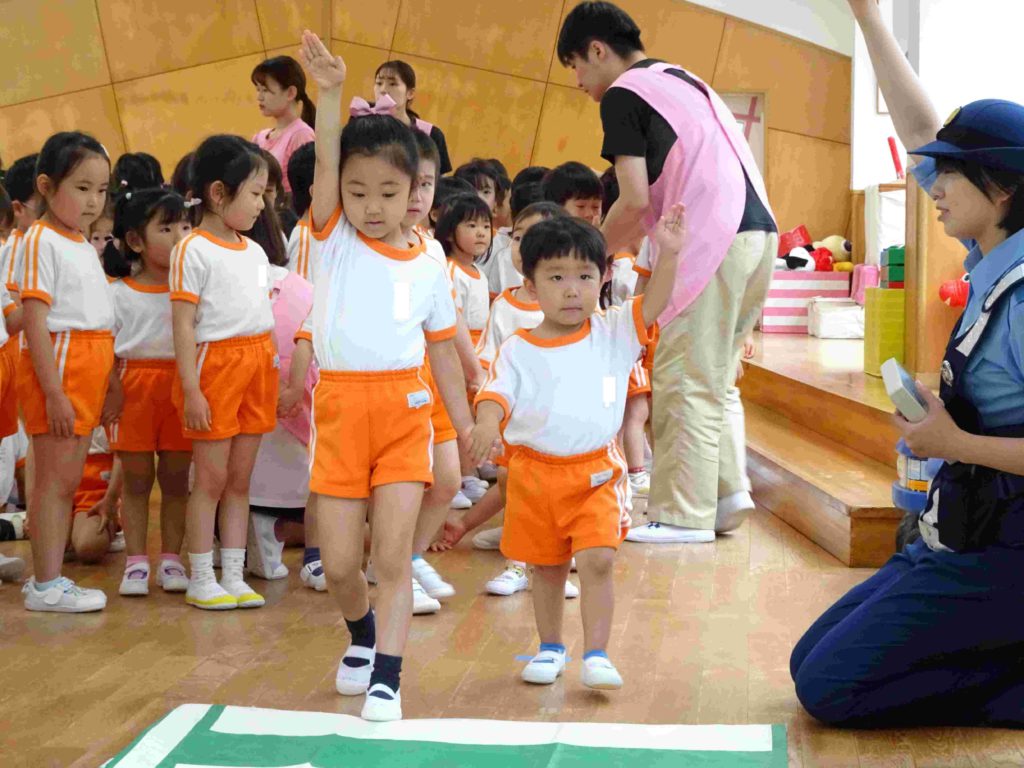 大塚警察署の協力を得て行いました。はじめに今年度入園の保護者の皆さまを対象として、交通安全、特に自転車の乗り方についてお話をしていただきました。後半は園児に向けてのお話の後、交差点の安全な渡り方を学びました。年少さんは年長のお兄さんお姉さんと一緒に歩いて学びました。年長さんは優しい心遣いで年少さんの手を引いていました。