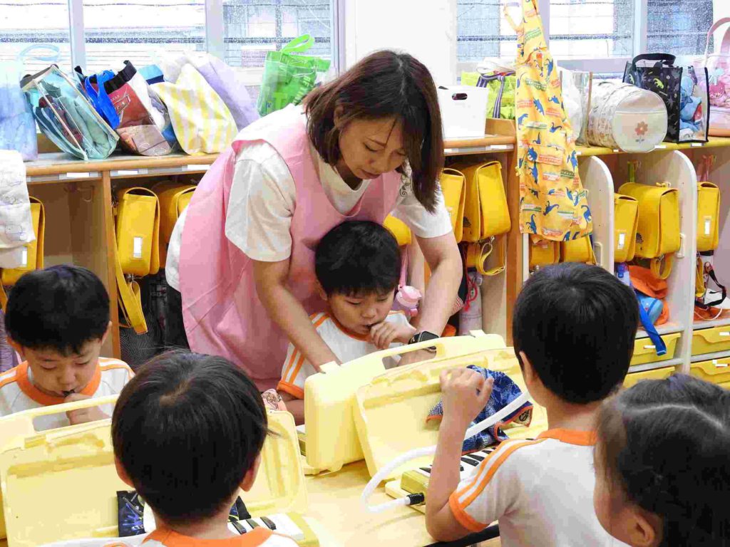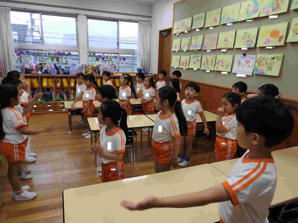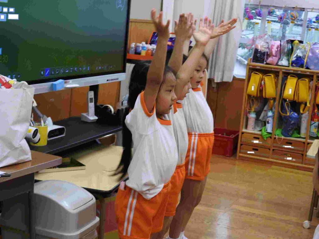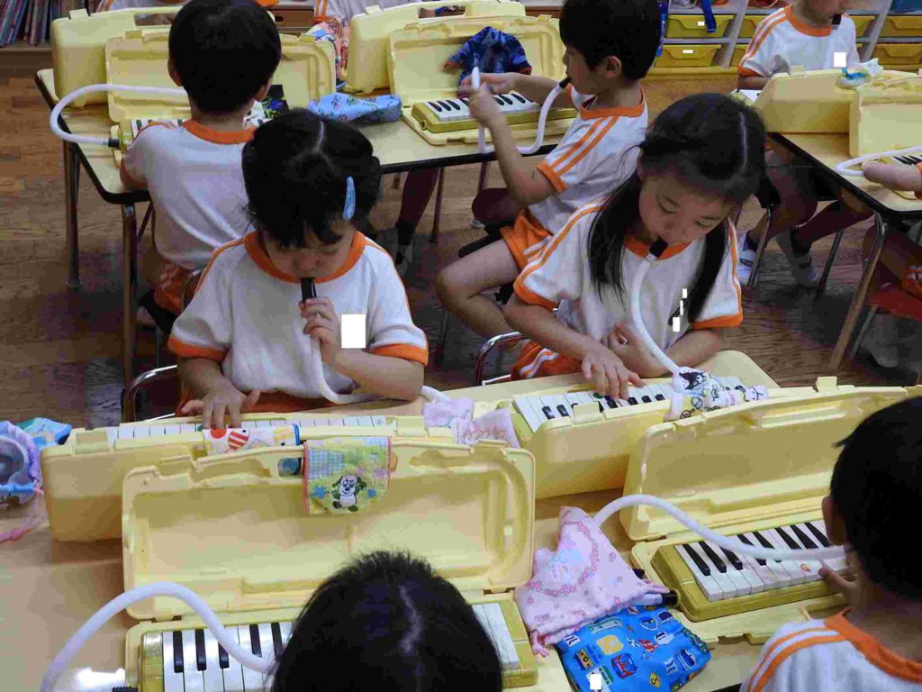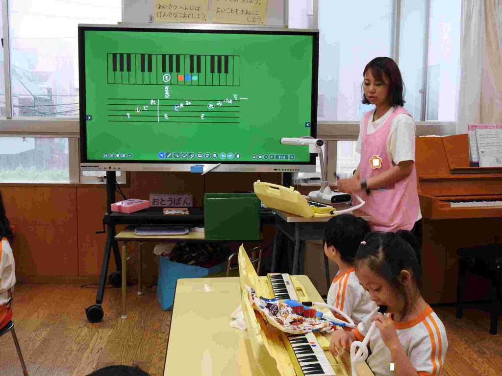 今日の年長組の様子です。朝の会はいつものとおり元気です。素晴らしい!鍵盤ハーモニカの練習では、電子黒板を使ったわかりやすい指導を行っています。先生の指遣いを画面上で見せて、弾くイメージをもたせています。