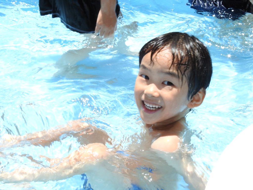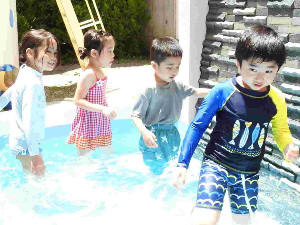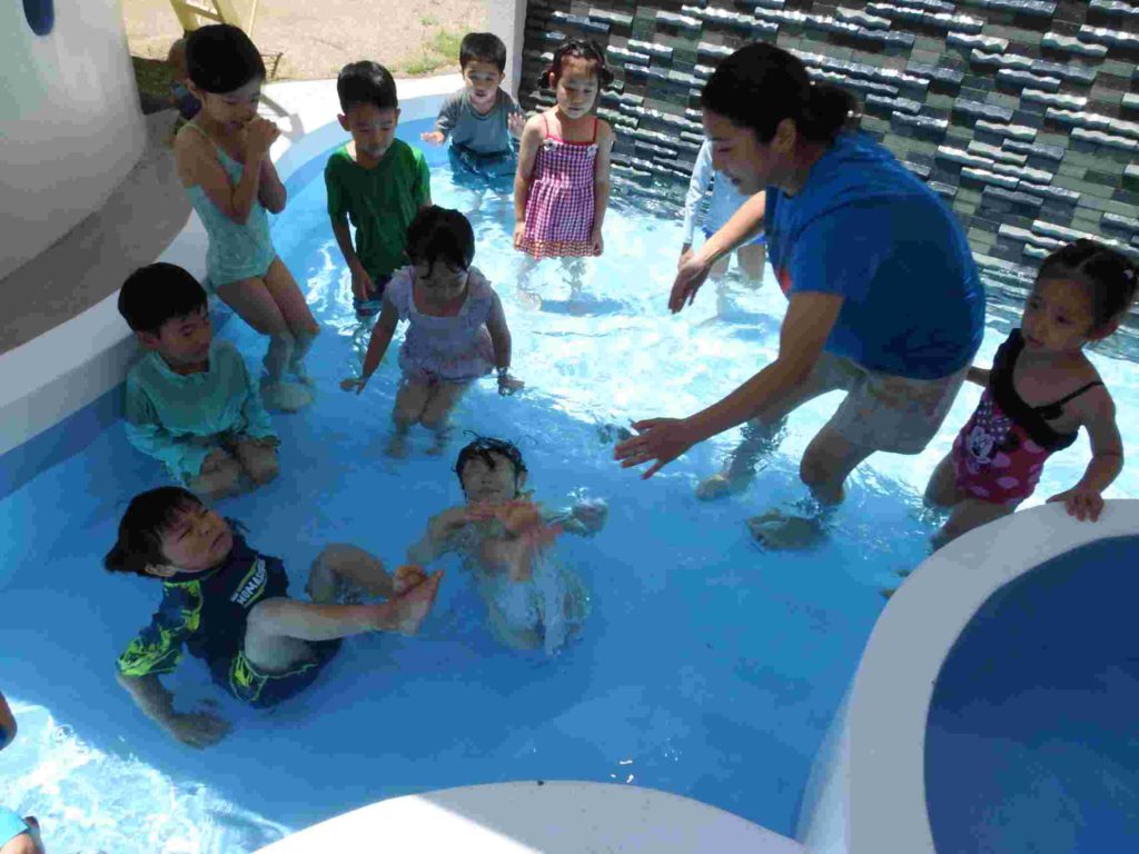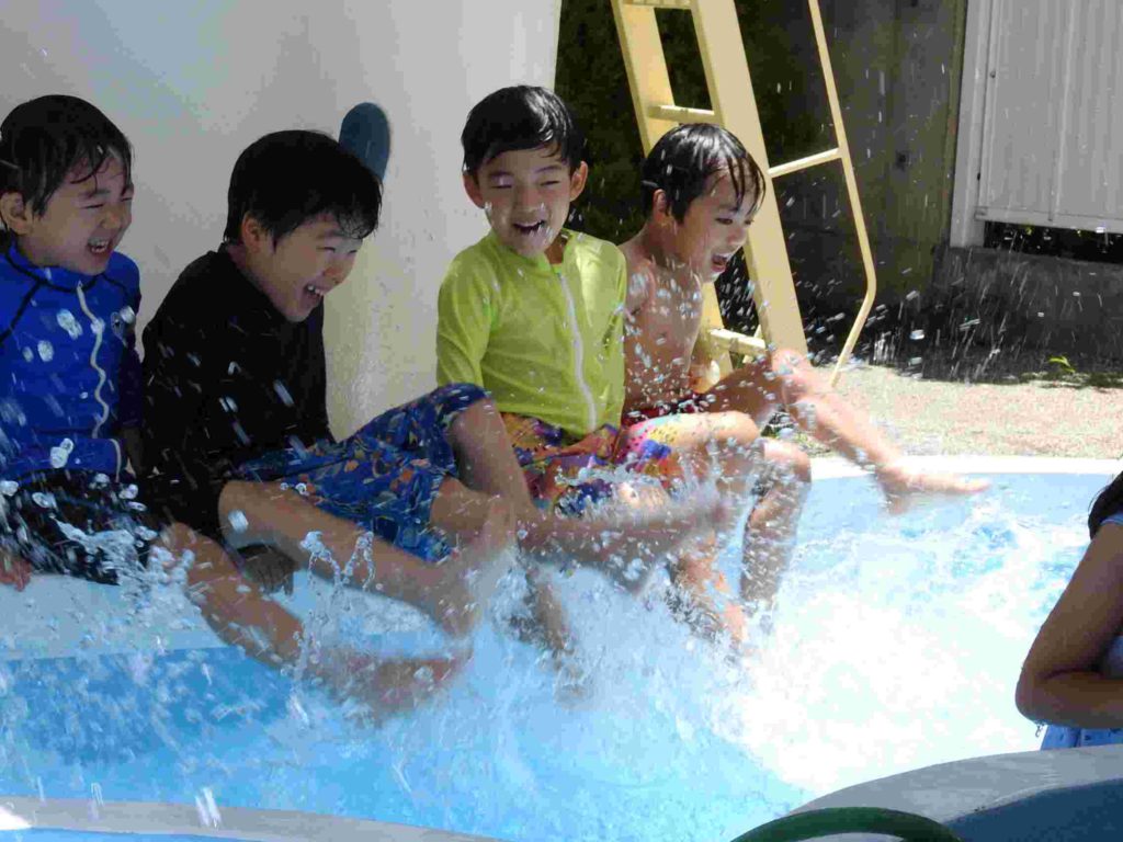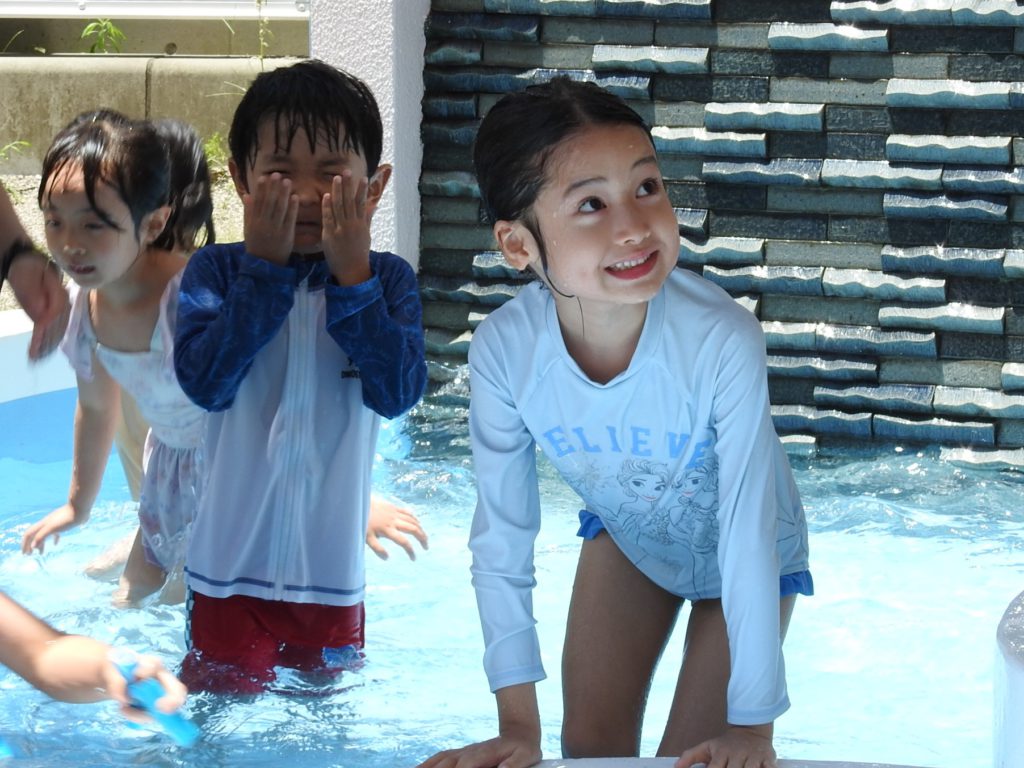 今日はプール開き。昨年度は9月実施でした。先週末はお天気が悪くてプール開きができるかどうか心配でした。でも、朝から太陽はカンカン照り、絶好のプール日和になりました。はじめはそっと水につかっていましたが、すぐに慣れました。プカプカ浮かぶ練習もしました。