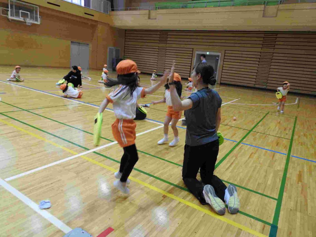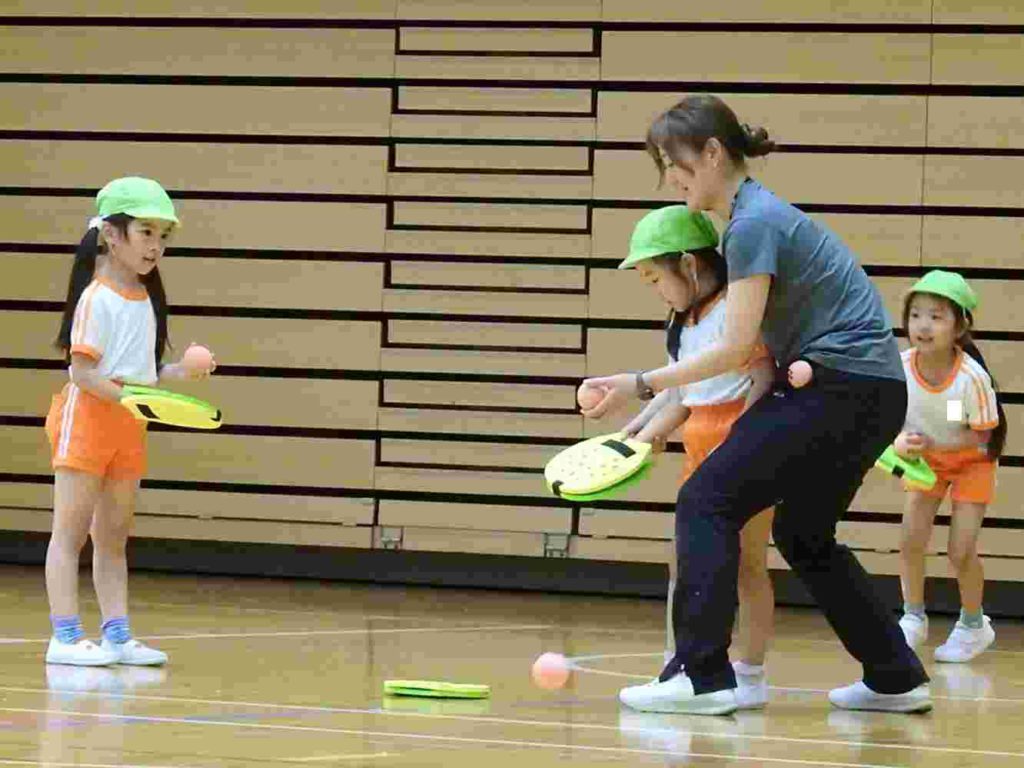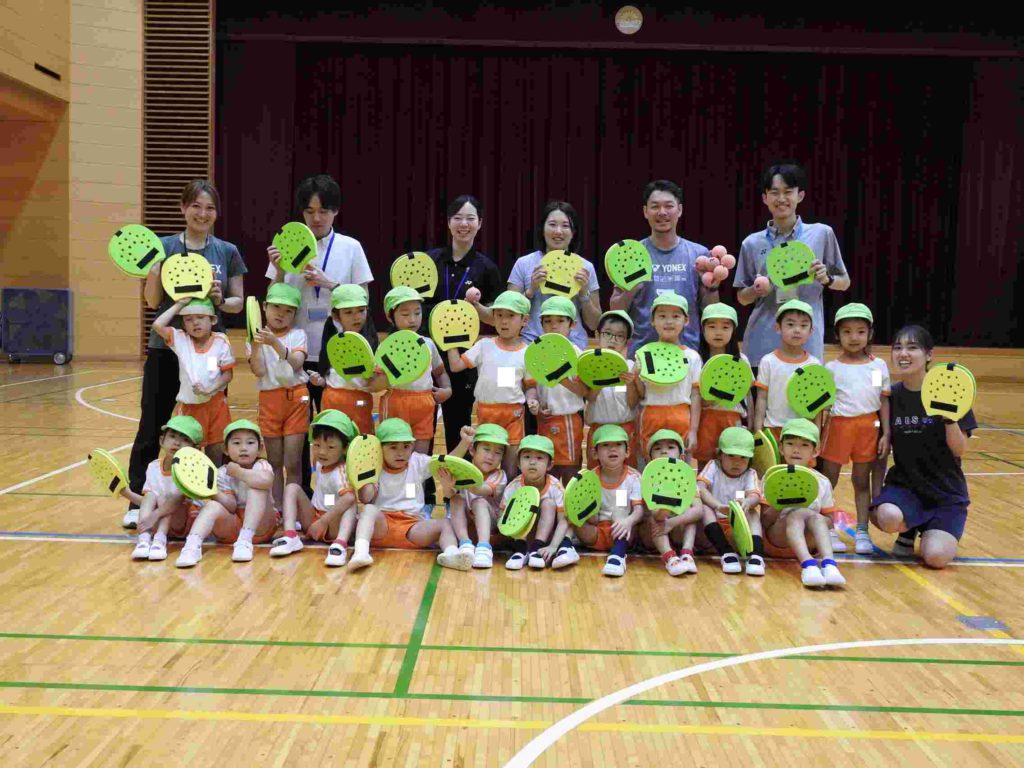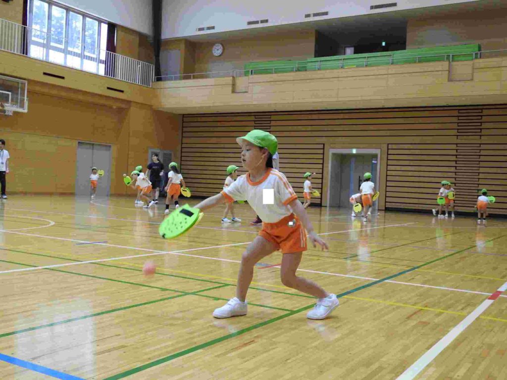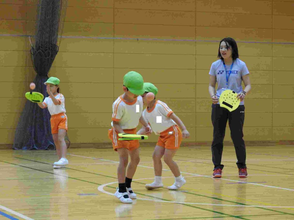 ヨネックスジャパンの協力を得て、テニピン教室を行うことができました。テニピンは日本テニス協会が子ども向けのラケットスポーツとして推奨しているものです。幼稚園ではサッカーやバスケットボールなどボールを使った運動には取り組んできました。ボールと道具を使う運動は初めて、という子も多くいましたがとても楽しく取り組めました。。ヨネックスジャパンからは6名ものスタッフが指導に訪れ、優しく丁寧に教えてくれたためです。おかげで子どもたちはテニピンが大好きになりました。
