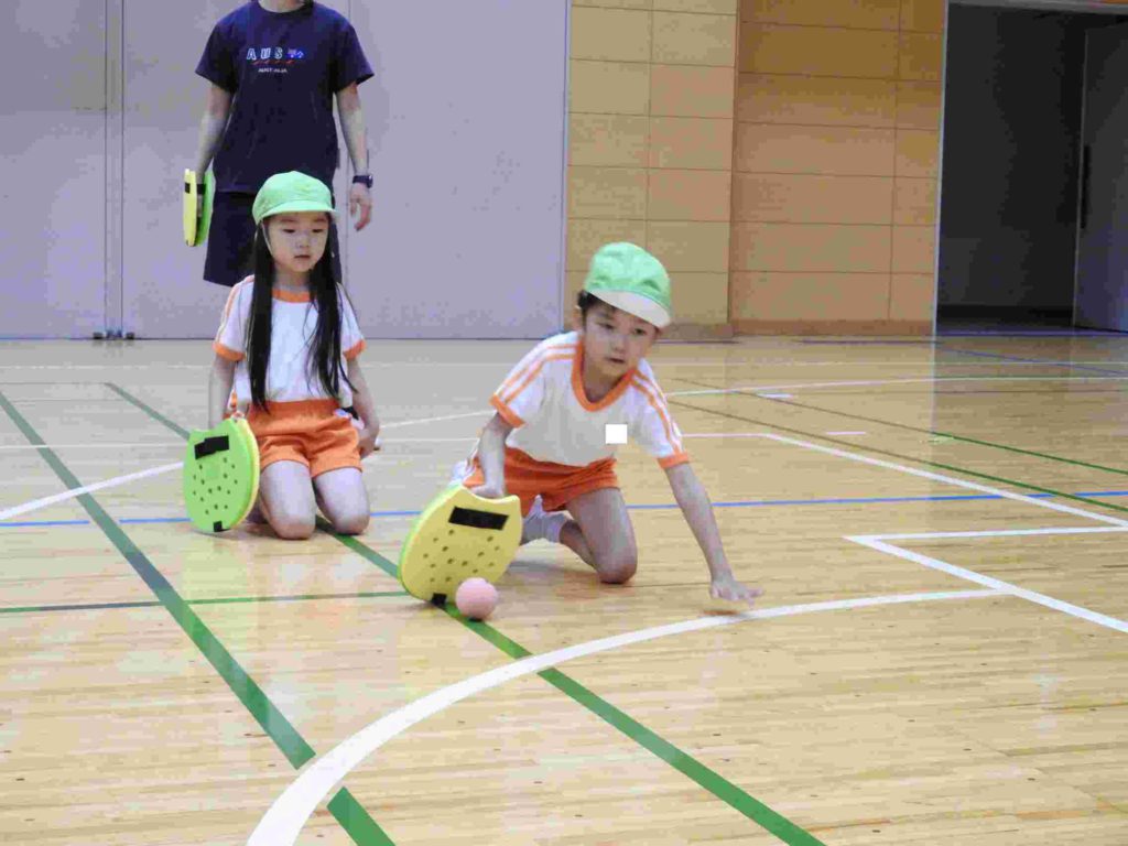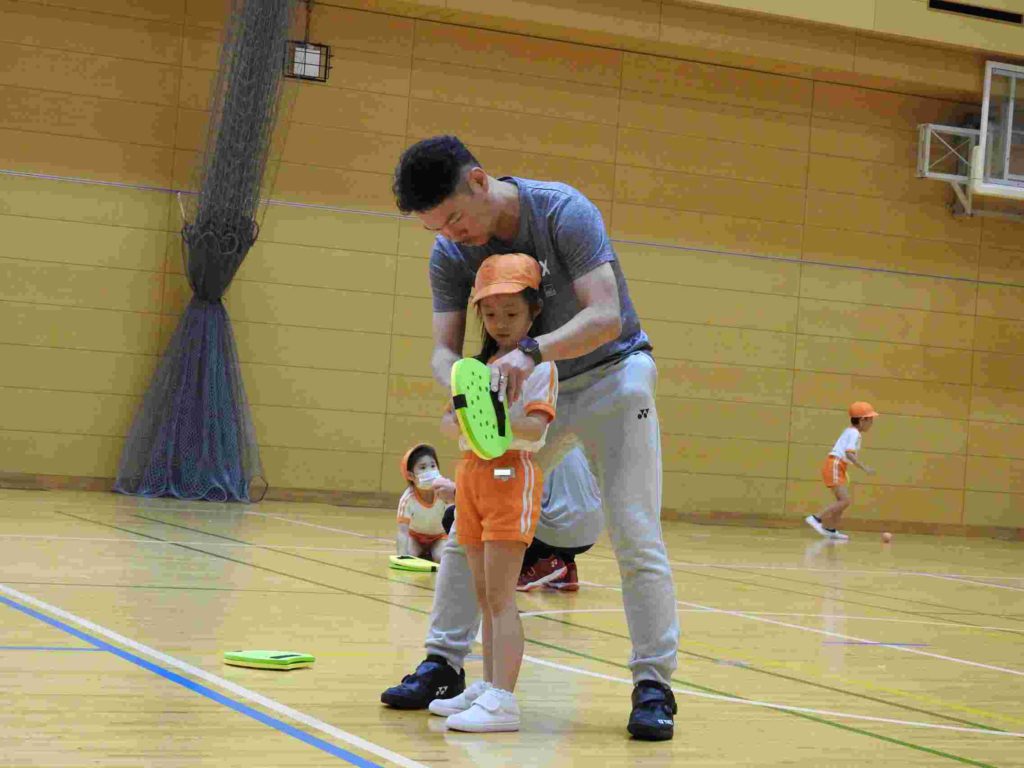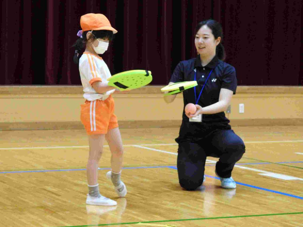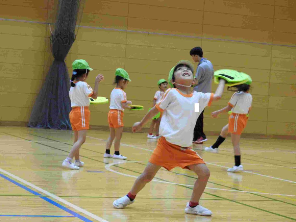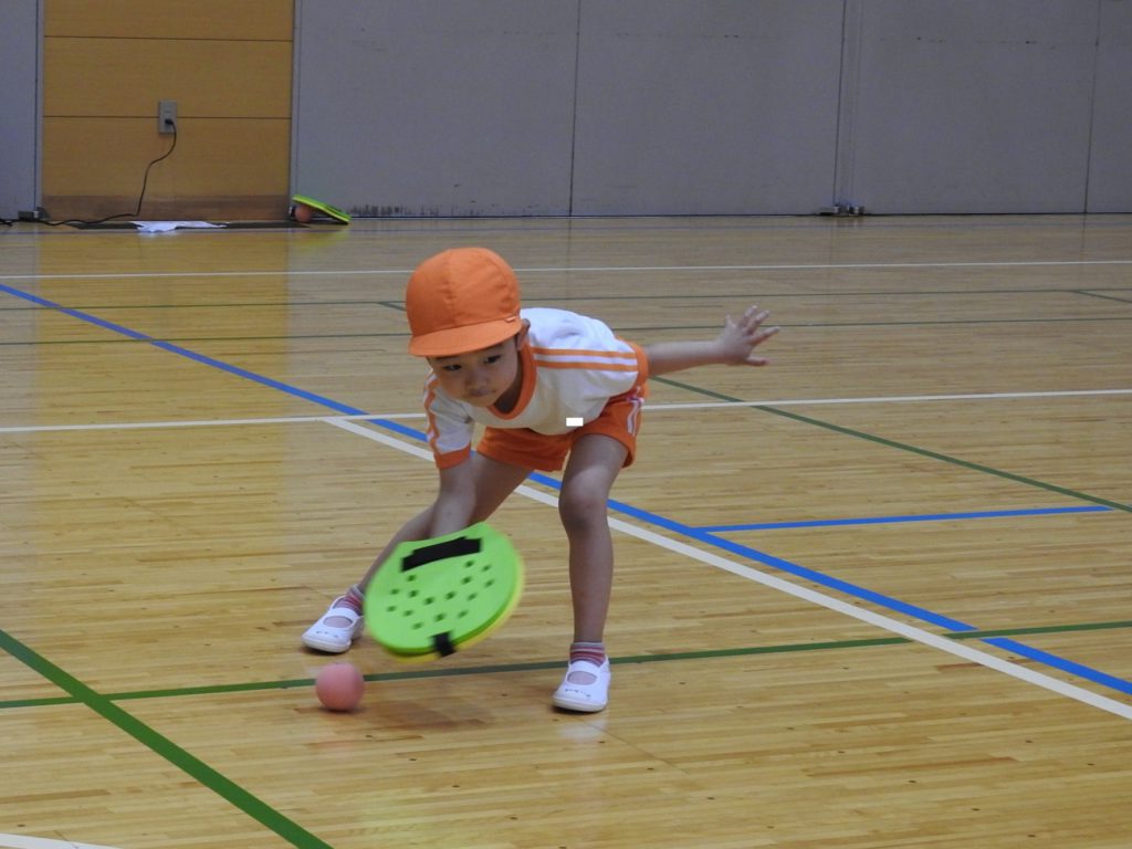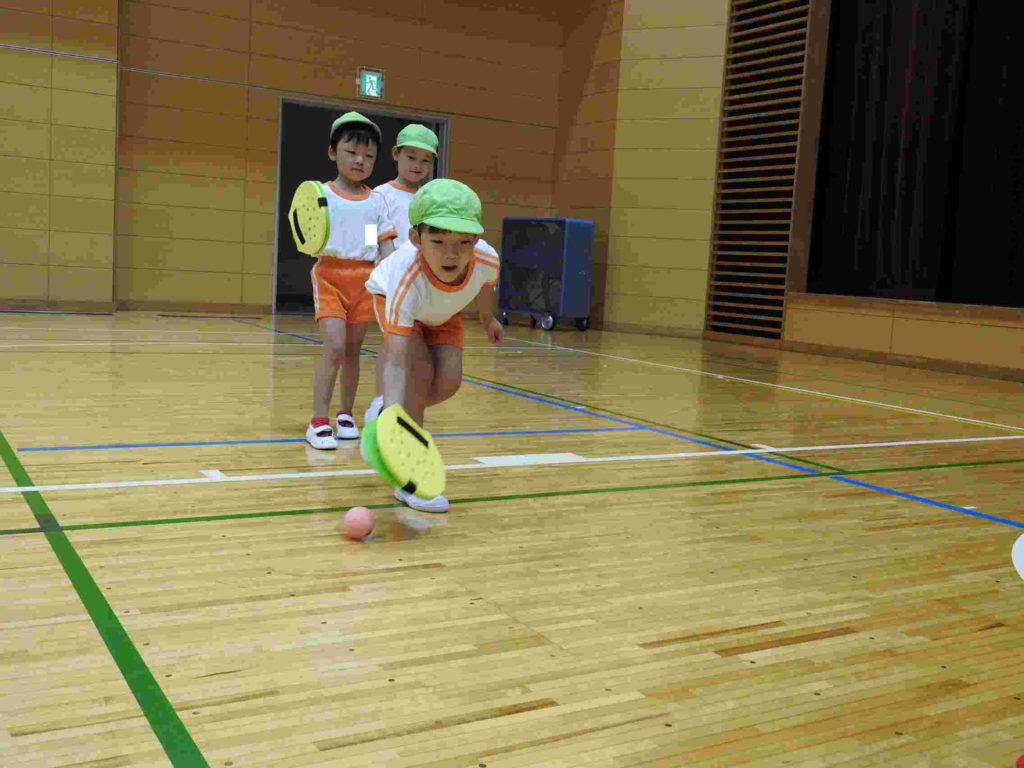 ヨネックスジャパンの協力を得て、テニピン教室を行うことができました。テニピンは日本テニス協会が子ども向けのラケットスポーツとして推奨しているものです。幼稚園ではサッカーやバスケットボールなどボールを使った運動には取り組んできました。ボールと道具を使う運動は初めて、という子も多くいましたがとても楽しく取り組めました。。ヨネックスジャパンからは6名ものスタッフが指導に訪れ、優しく丁寧に教えてくれたためです。おかげで子どもたちはテニピンが大好きになりました。