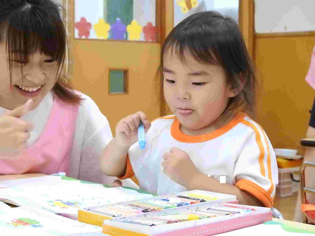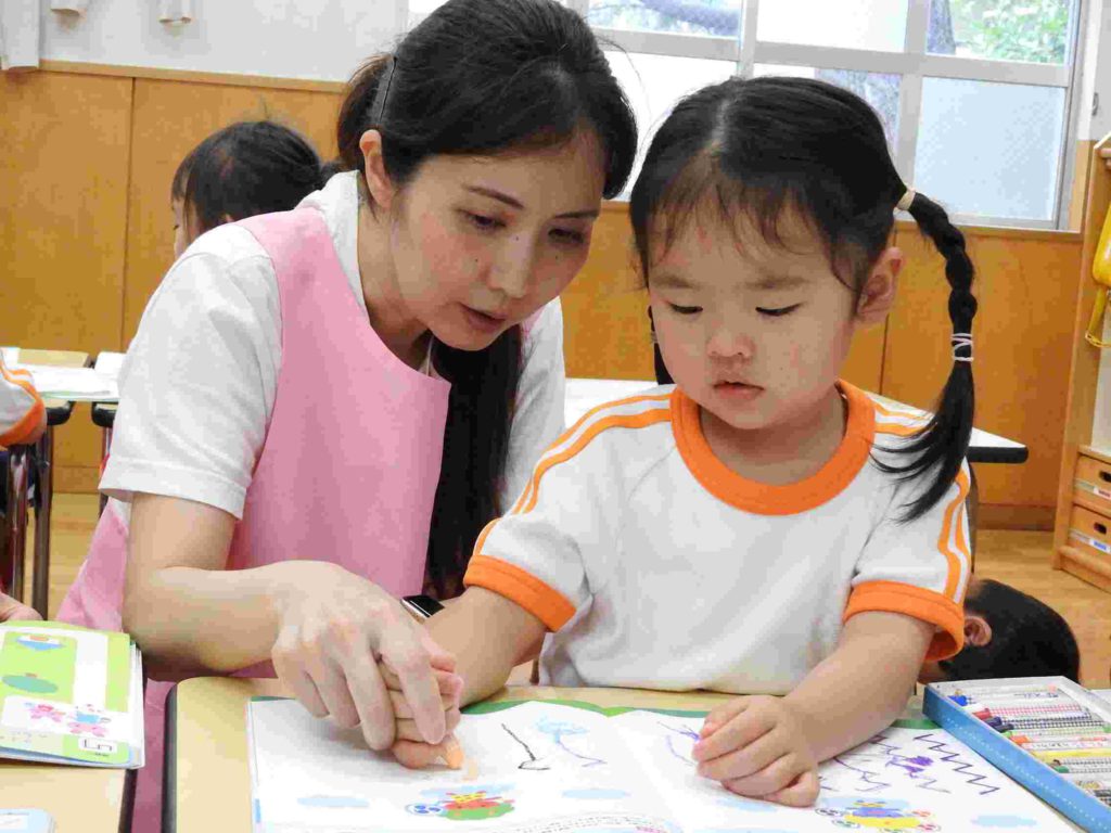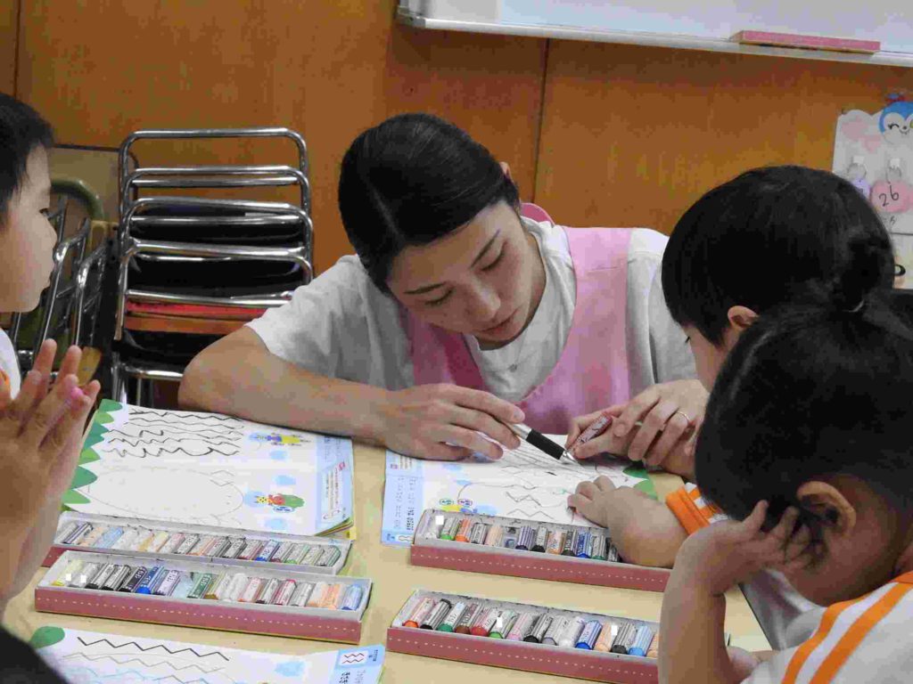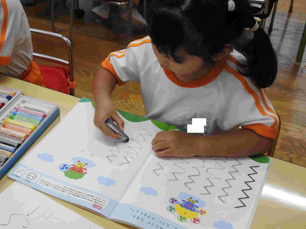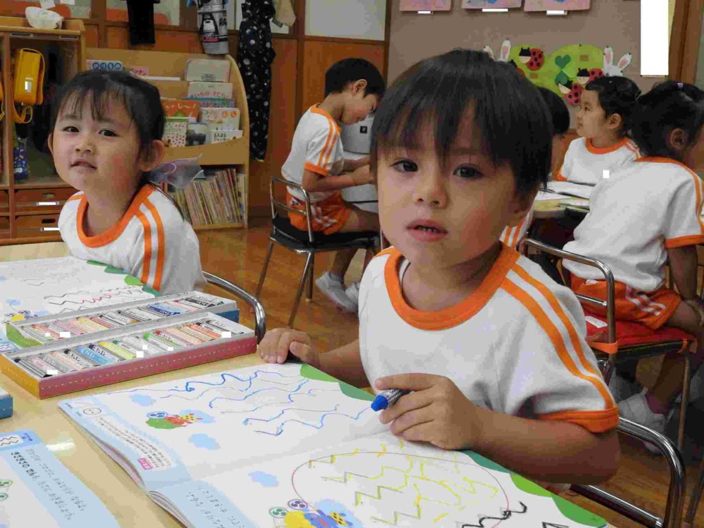 今日は雨のため計画していたプールができませんでした。残念、今日は室内での活動です。年少は「かこうせん」、今日はギザギザに挑戦です。しっかりとクレヨンを持って、丁寧に書きます。先生方も一人ひとりの子どもをしっかりと見ています。
