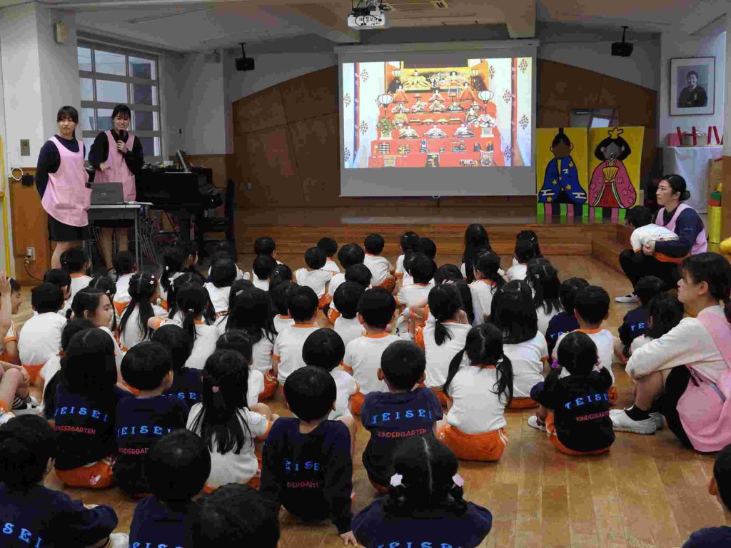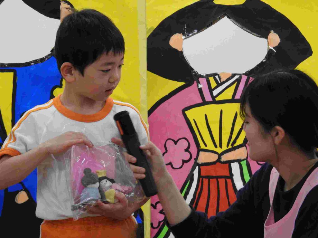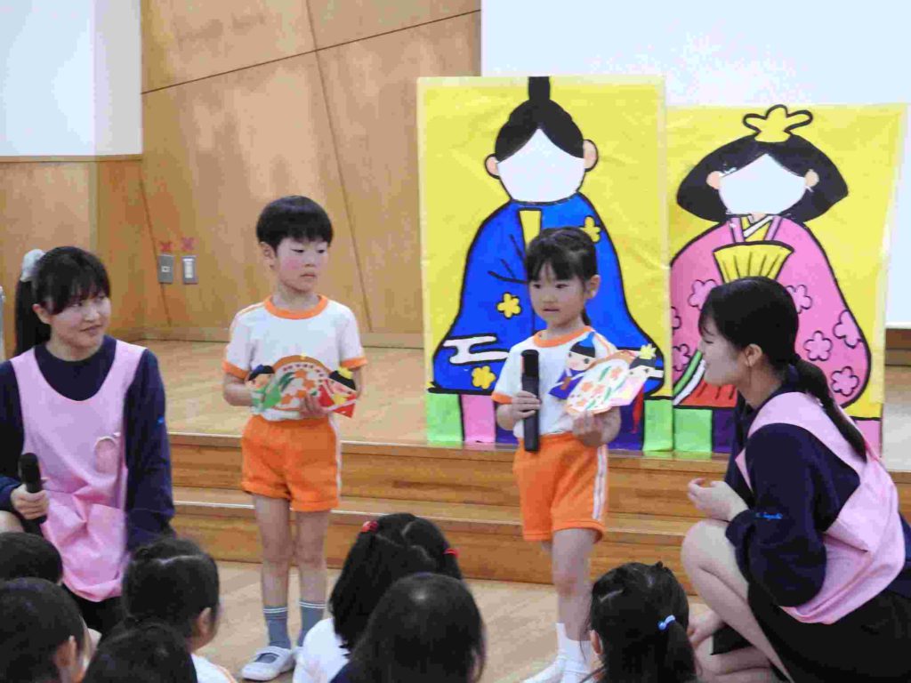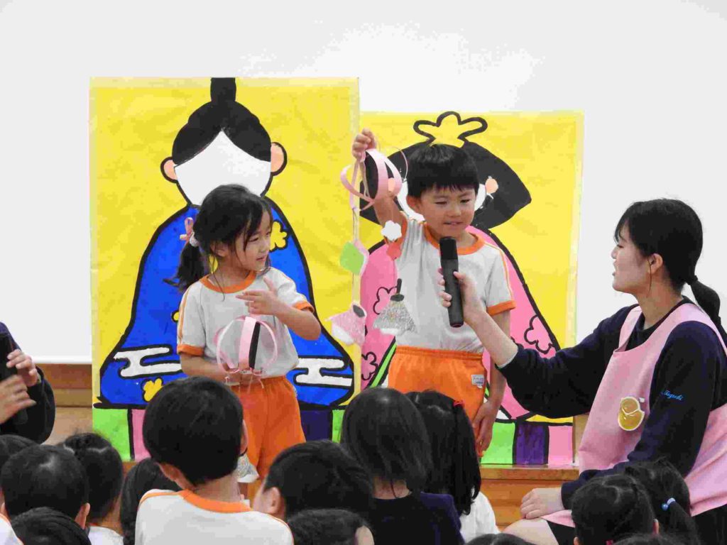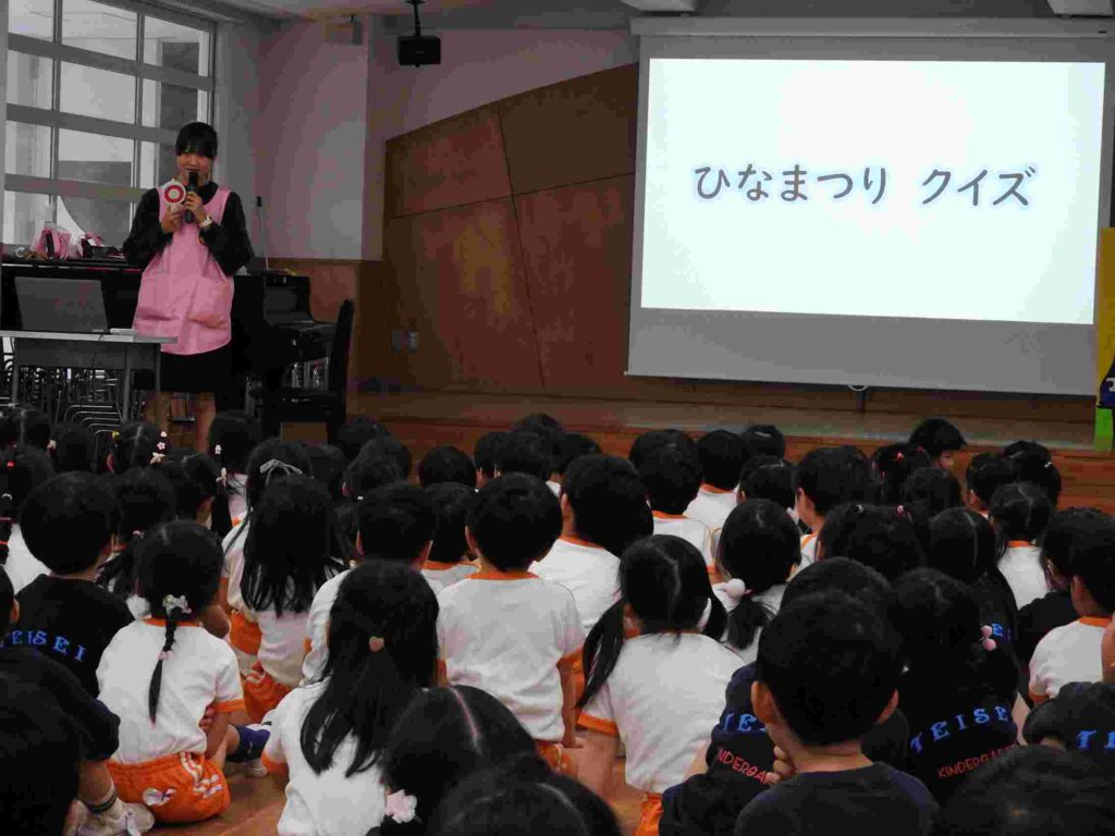 お誕生日会の後、ひな祭り会を行いました。先生からひな祭りの由来や歴史を聞いた後、「ひな祭りクイズ」で大いに盛り上がりました。全問正解した園児もたくさんいました。一番難しかったのは「ひな祭りは何の節句というか」でした。その後、各学年のひな祭り製作の説明をしました。みんなしっかりと話せていて感心しました。