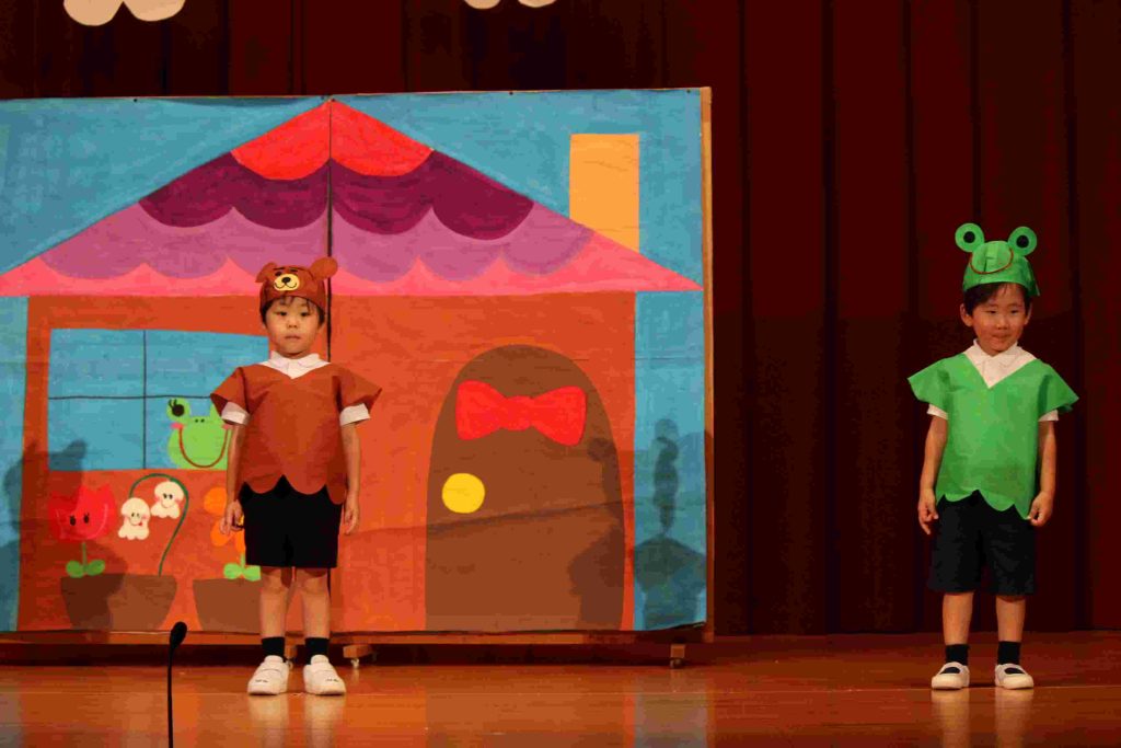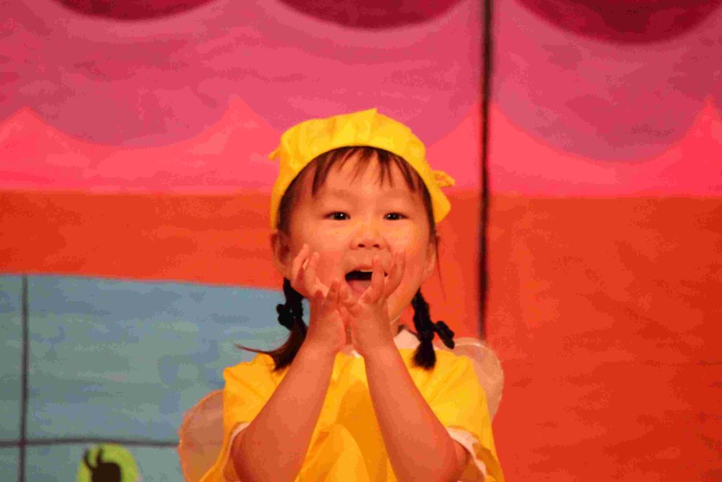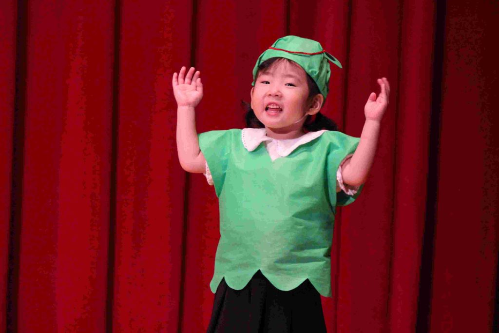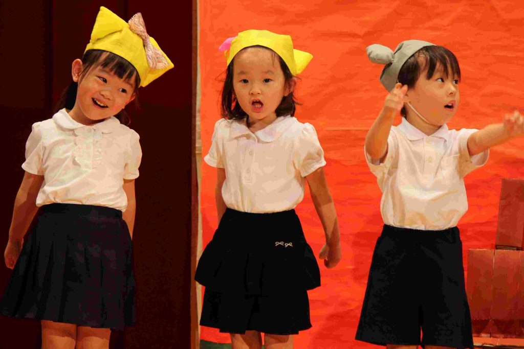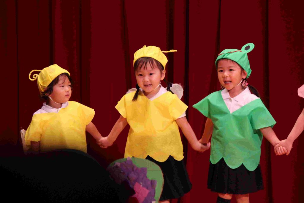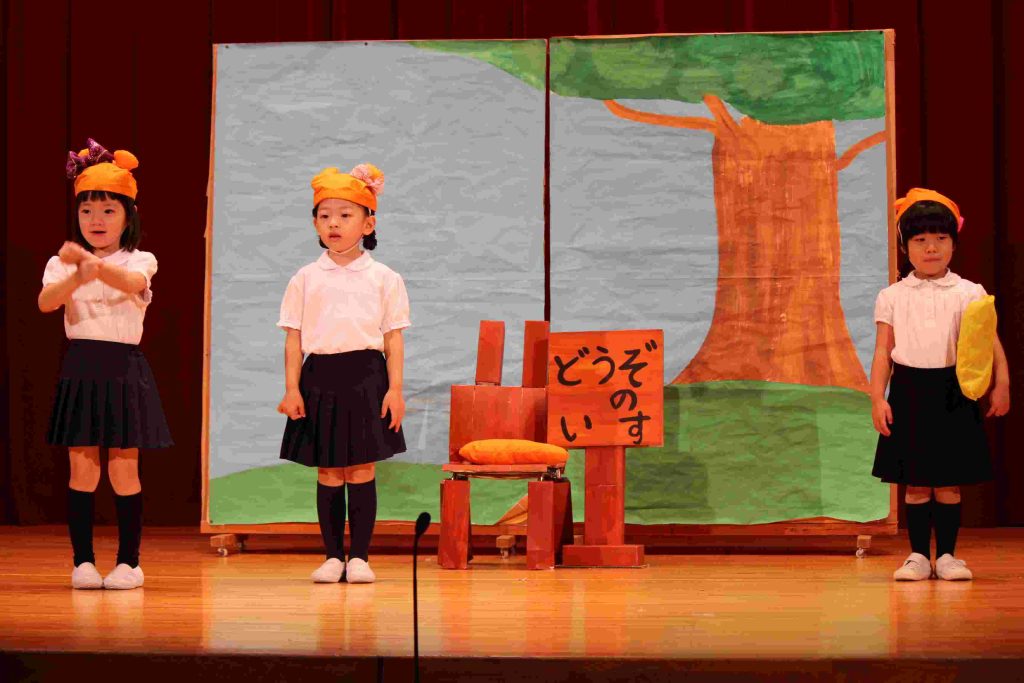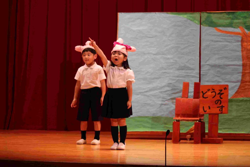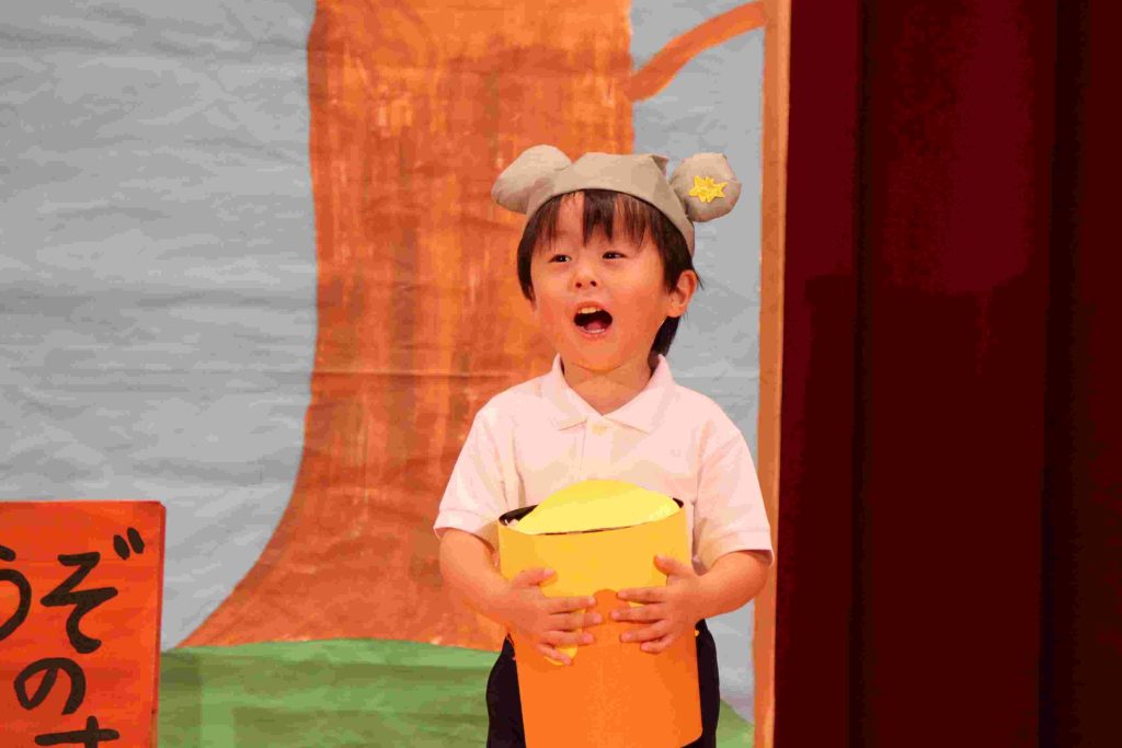 初めての劇発表会、ドキドキワクワクしてこの日を待っていた年少組の園児たち。今日はたくさんの保護者の皆さまの前で「大きな声でセリフが言えたこと、楽しく演じることができたこと」がよかったと担任の先生は話しています。年少とは思えないぐらい表現力が豊かです。