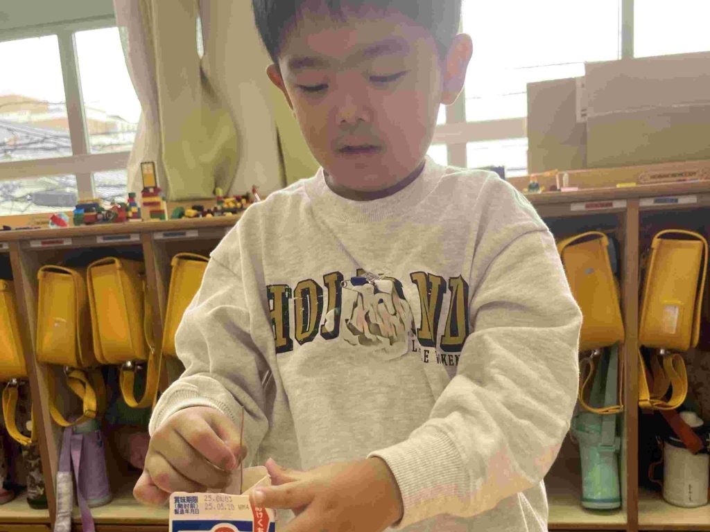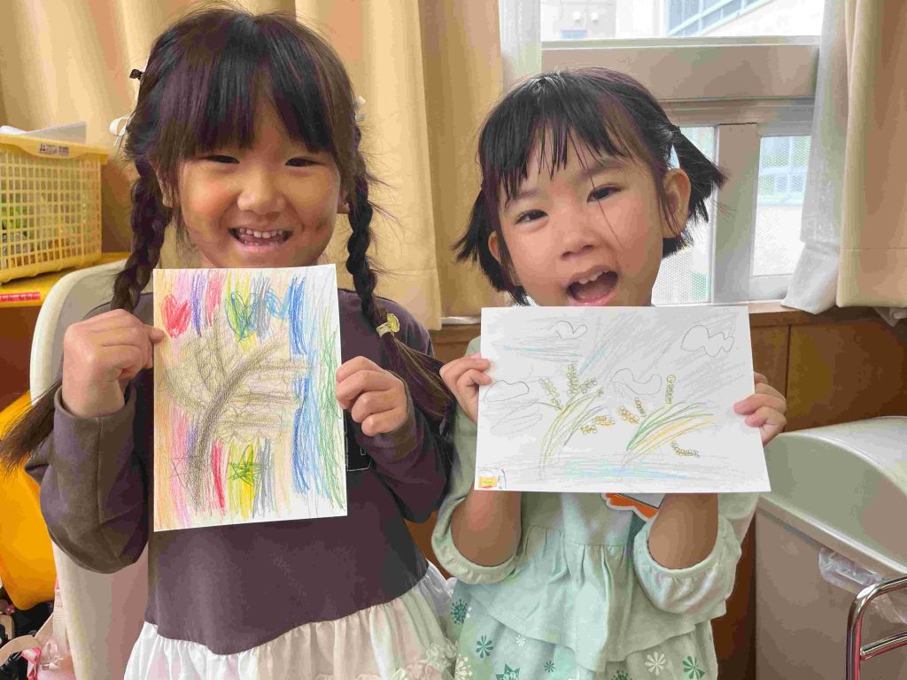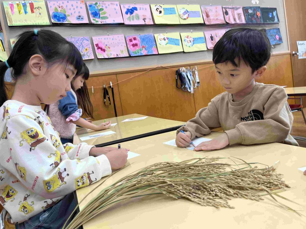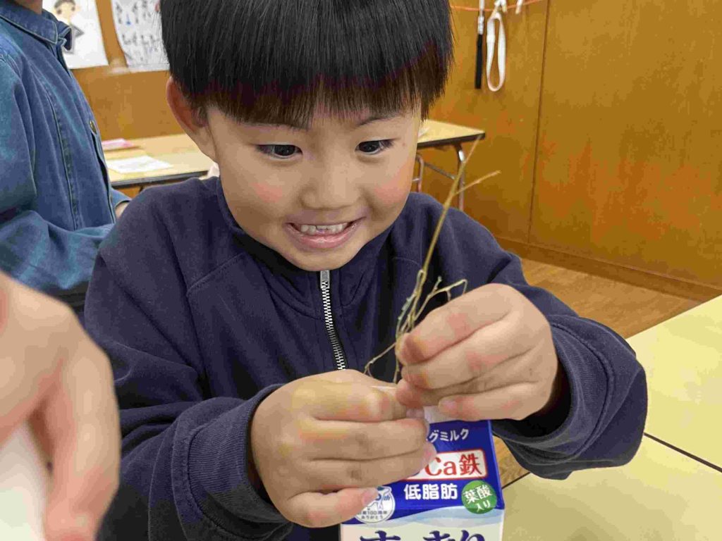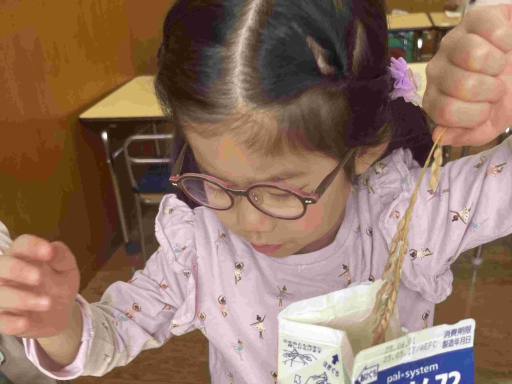 先日行った「食育 山形県 雪若丸おにぎりパーティー」でいただいた稲を脱穀しました。まず、お米がついている稲の絵を丁寧に描きます。稲穂をよく観察します。そのあと、牛乳パックを使って脱穀しました。ぎゅっと力を入れます。お米一粒一粒を大事にする心が育まれました。