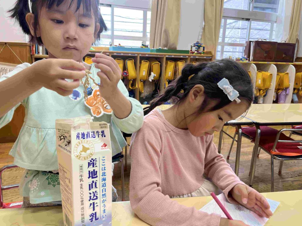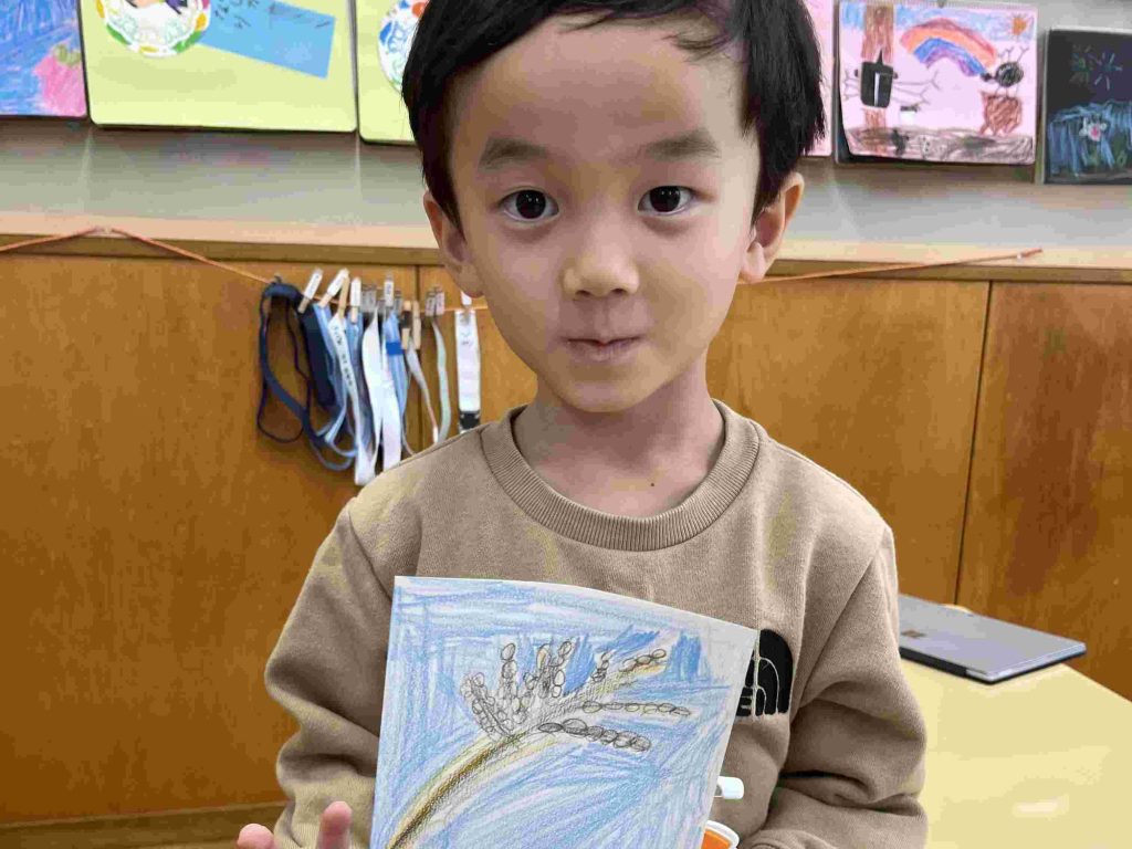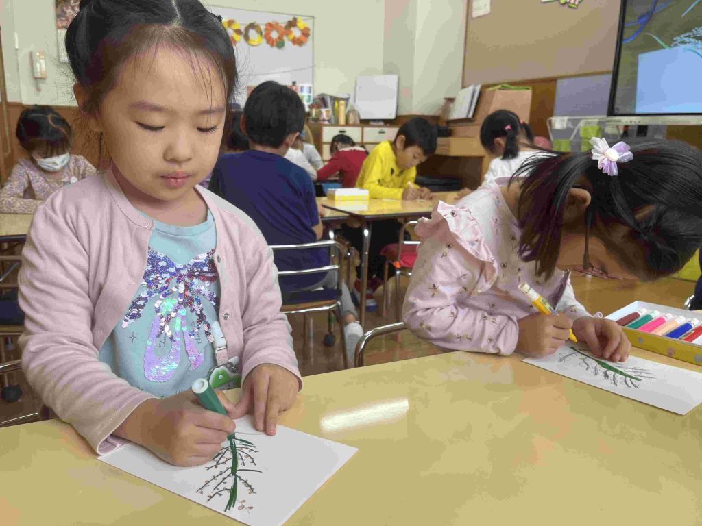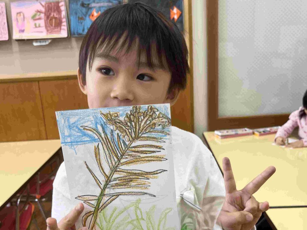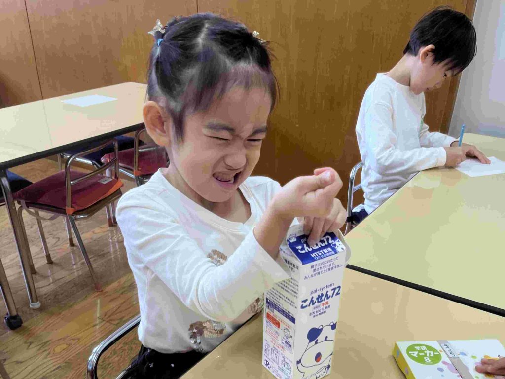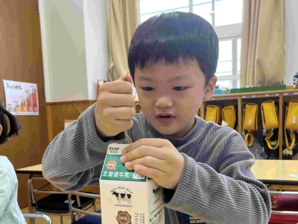先日行った「食育 山形県 雪若丸おにぎりパーティー」でいただいた稲を脱穀しました。まず、お米がついている稲の絵を丁寧に描きます。稲穂をよく観察します。そのあと、牛乳パックを使って脱穀しました。ぎゅっと力を入れます。お米一粒一粒を大事にする心が育まれました。