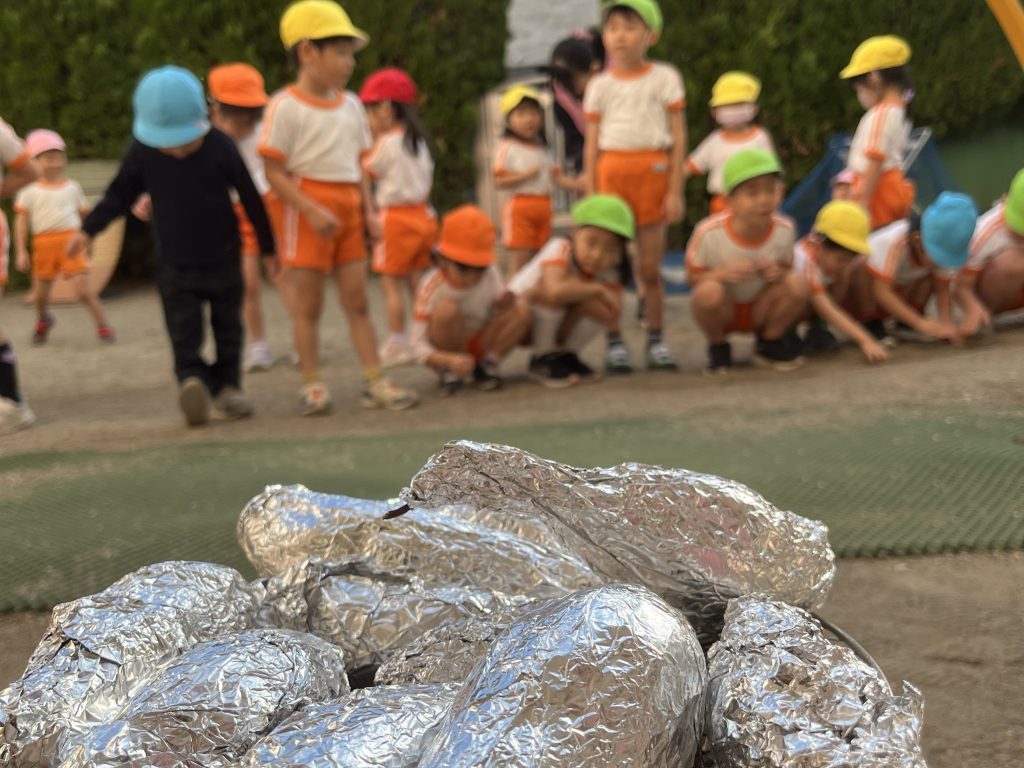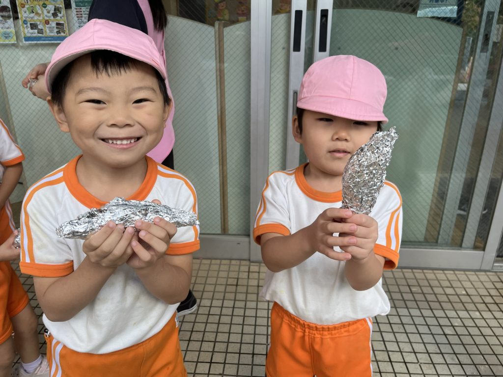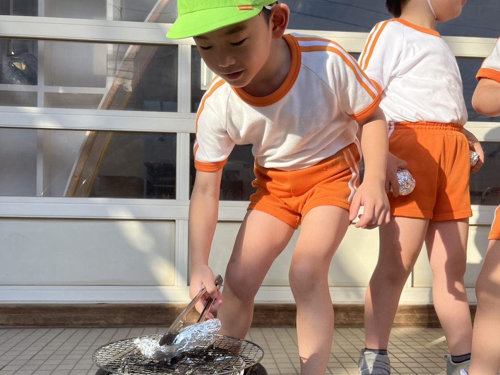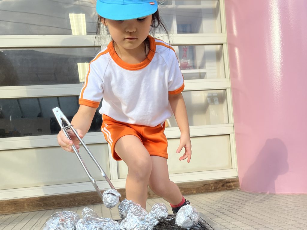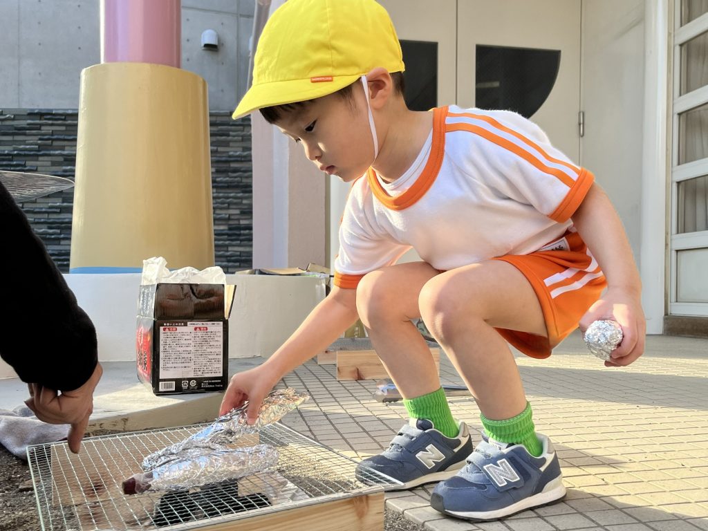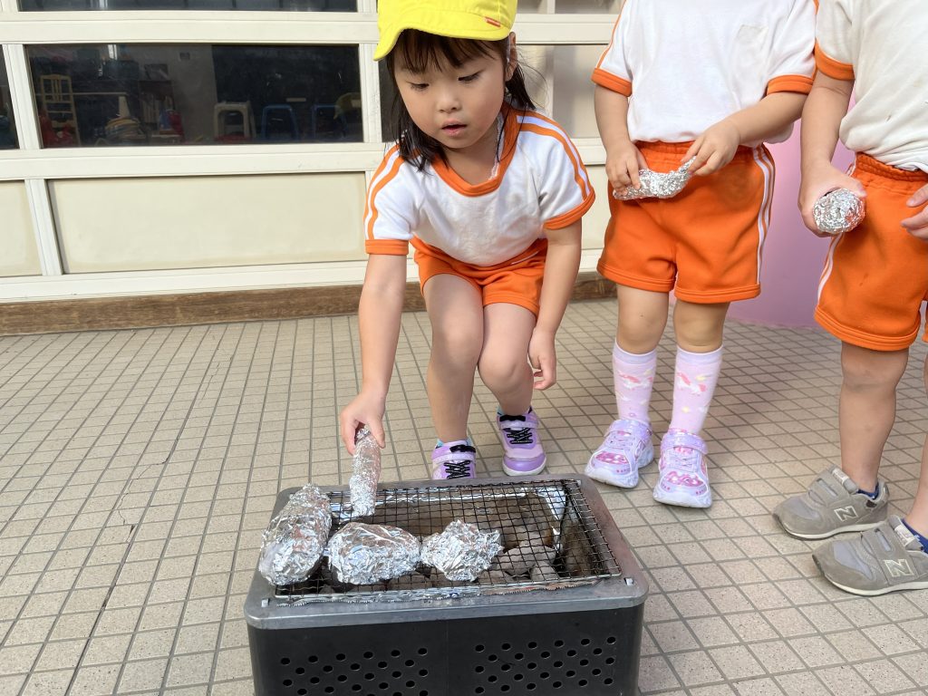 18日(水)の預かり保育の時間に「焼き芋」をしました。園外保育のときに農園の方がおすそ分けしてくださったお芋があったのです。園児はお芋を1本1本丁寧にアルミホイルでくるみ、七輪の上にそっと置いていきます。あとはおいしく焼けるのを待つのみ。熱々のぽくぽくしたお芋をみんなでおいしくいただきました。