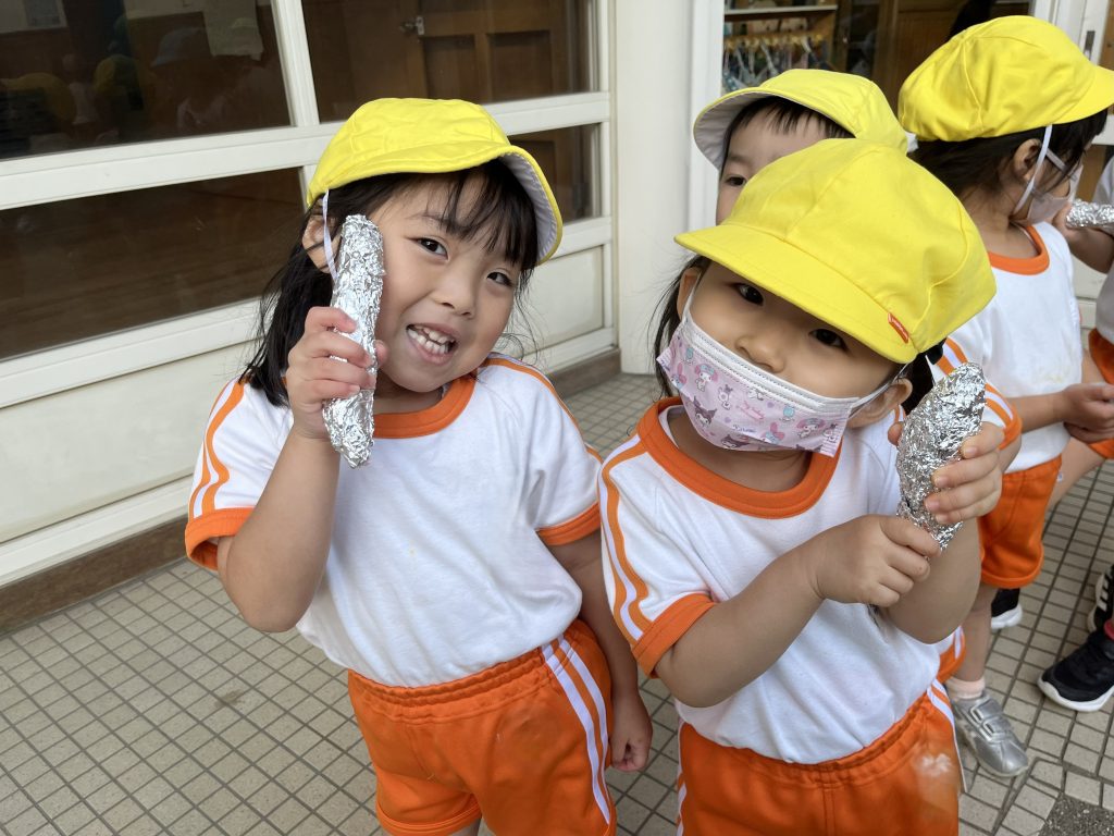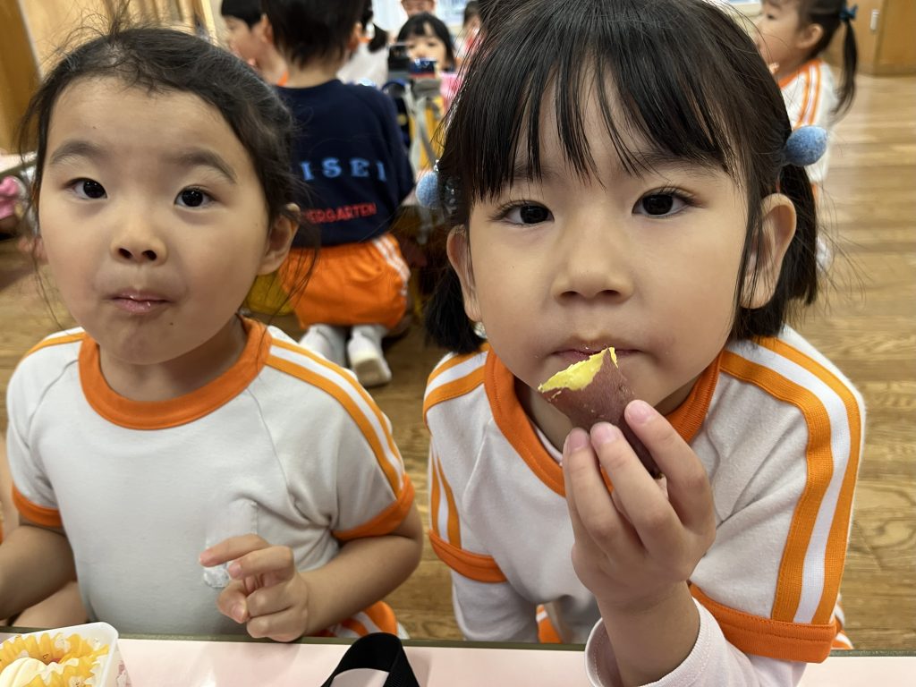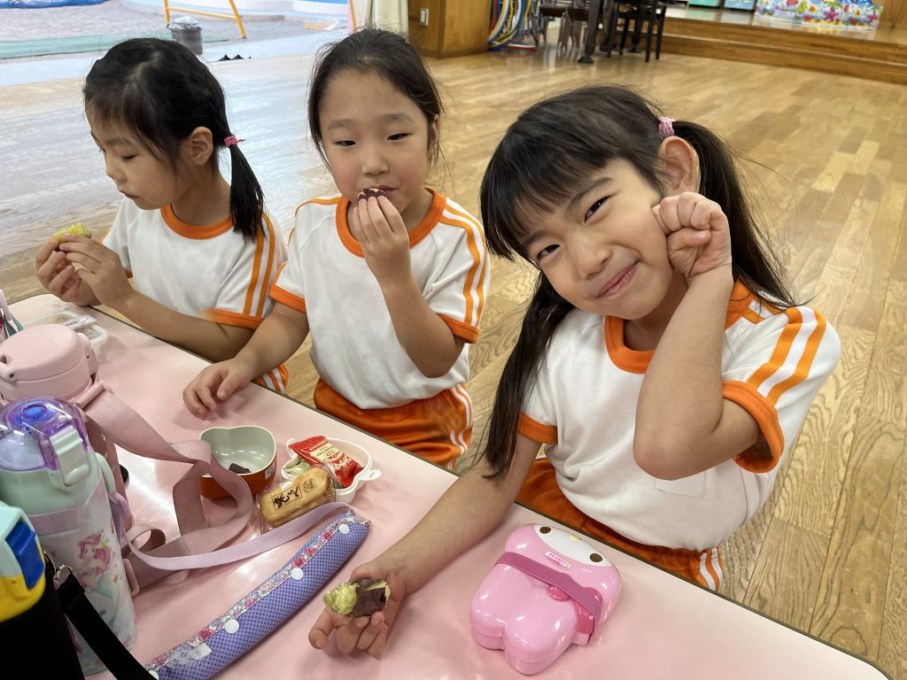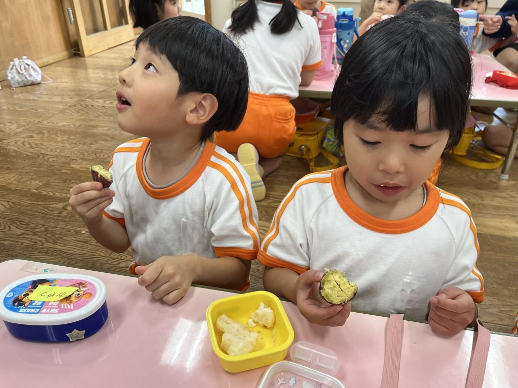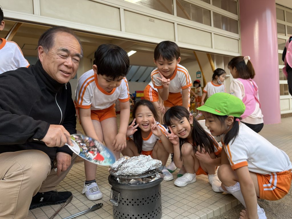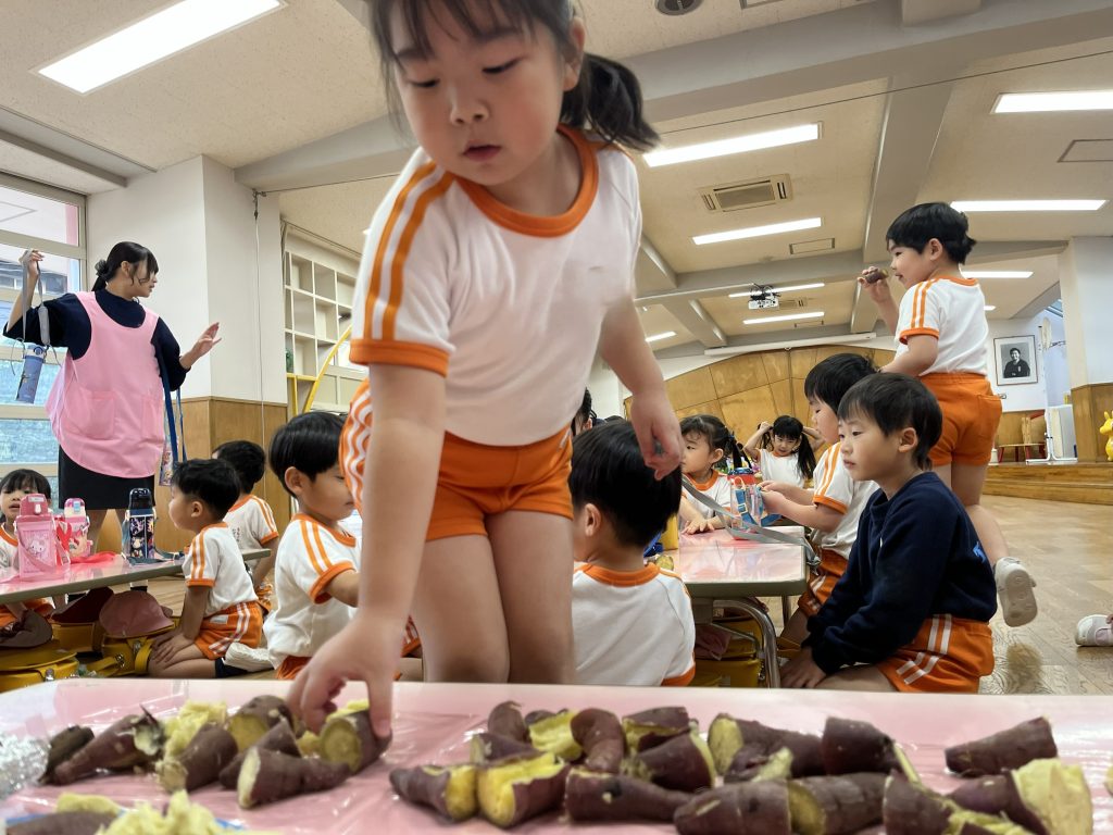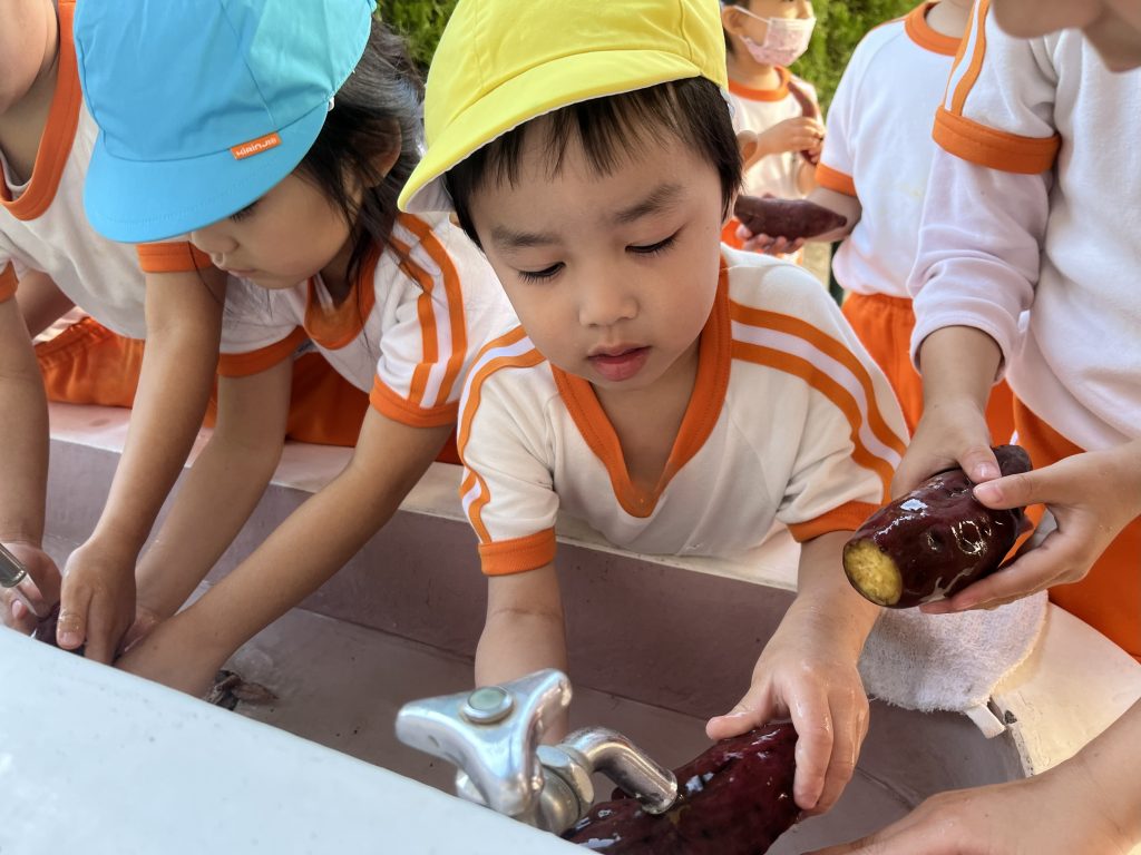 18日(水)の預かり保育の時間に「焼き芋」をしました。園外保育のときに農園の方がおすそ分けしてくださったお芋があったのです。園児はお芋を1本1本丁寧にアルミホイルでくるみ、七輪の上にそっと置いていきます。あとはおいしく焼けるのを待つのみ。熱々のぽくぽくしたお芋をみんなでおいしくいただきました。