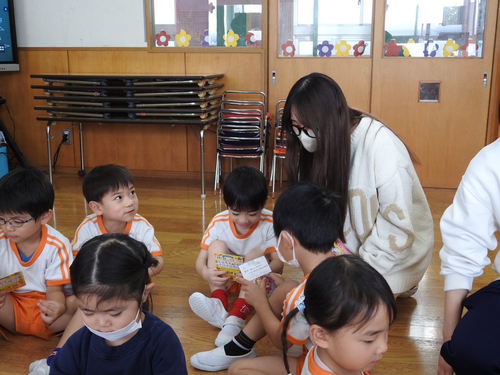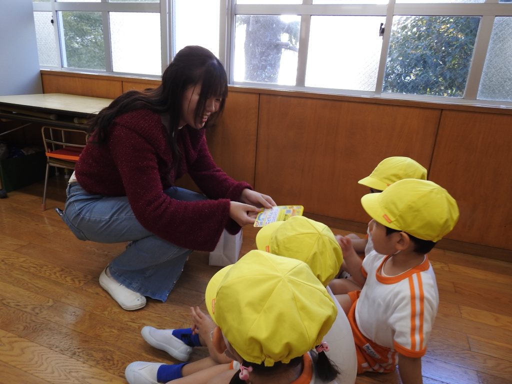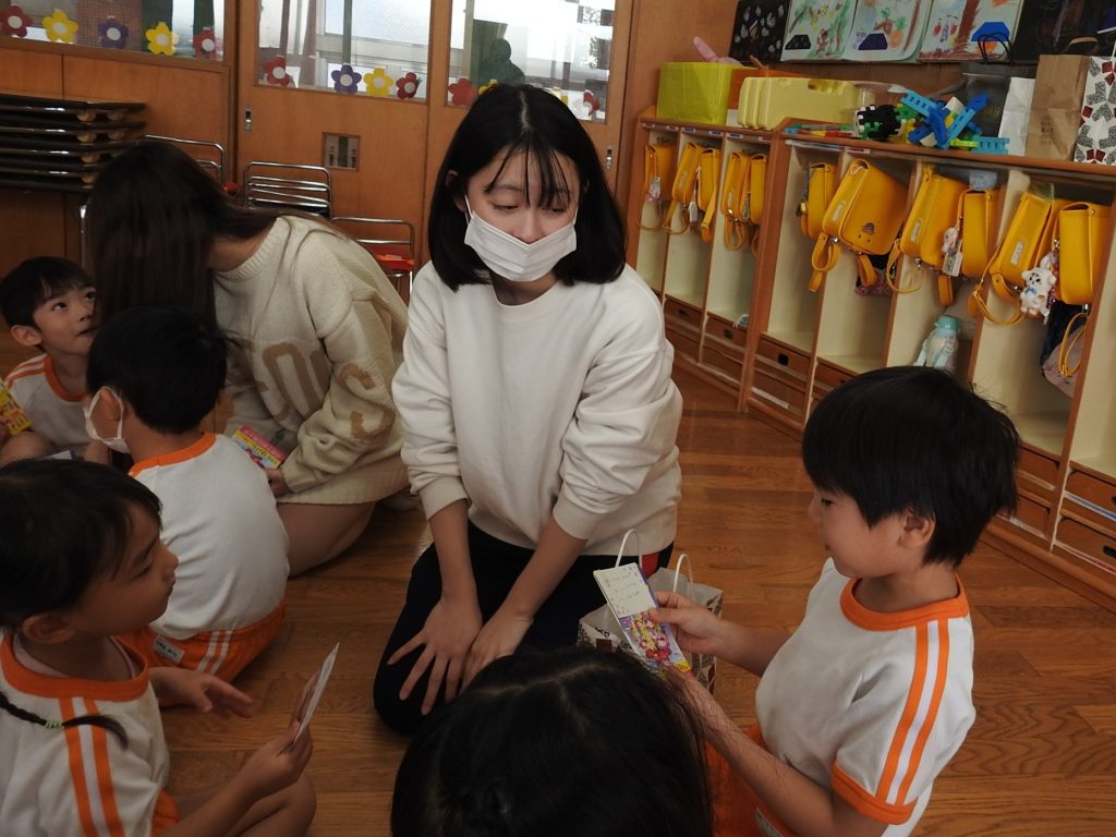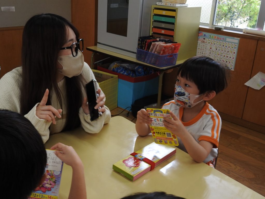 今日は併設の貞静学園短期大学の学生さんが来て、大学祭の案内に来てくれました。園児一人一人に手書きで「あそびにきてね」というメッセージが書かれたカードを、声をかけながら渡します。さすが保育士や幼稚園教諭を目指す学生さんです。降園時には保護者の皆さまにもご案内をしていました。大学祭、とても楽しみです。