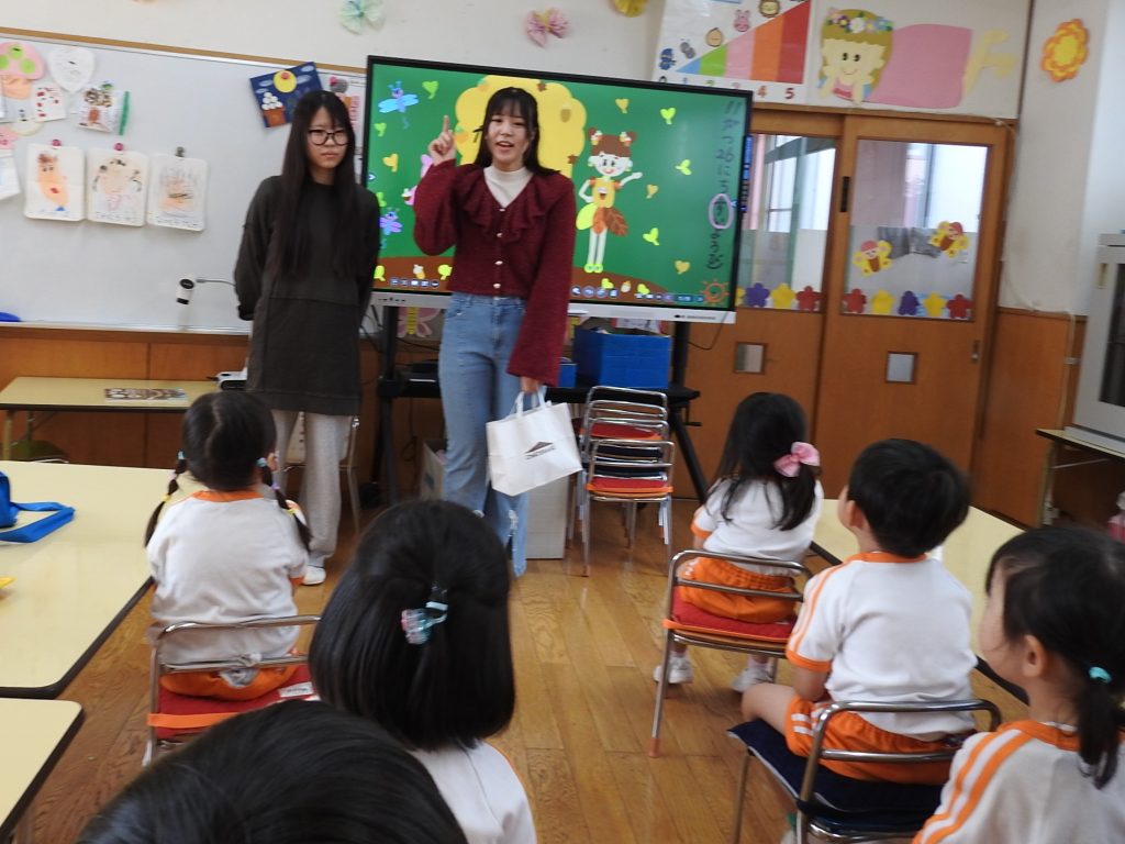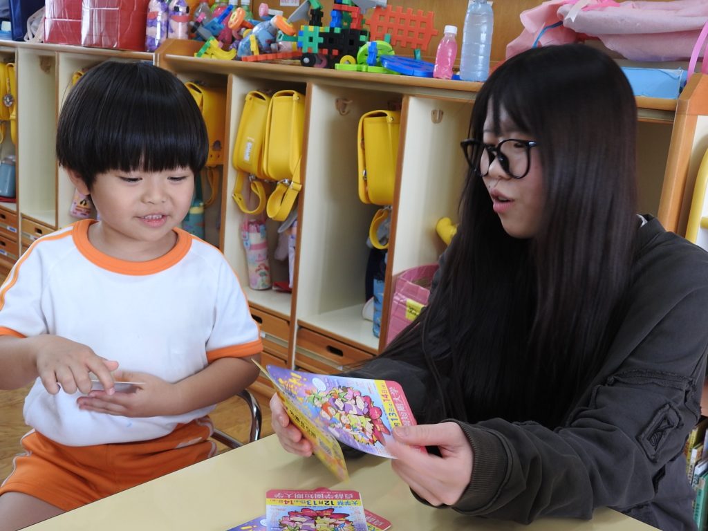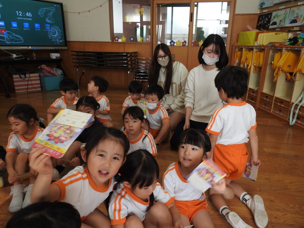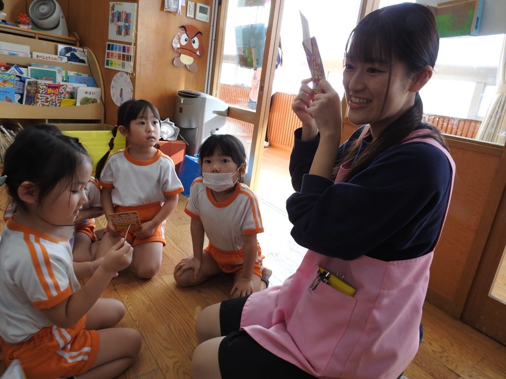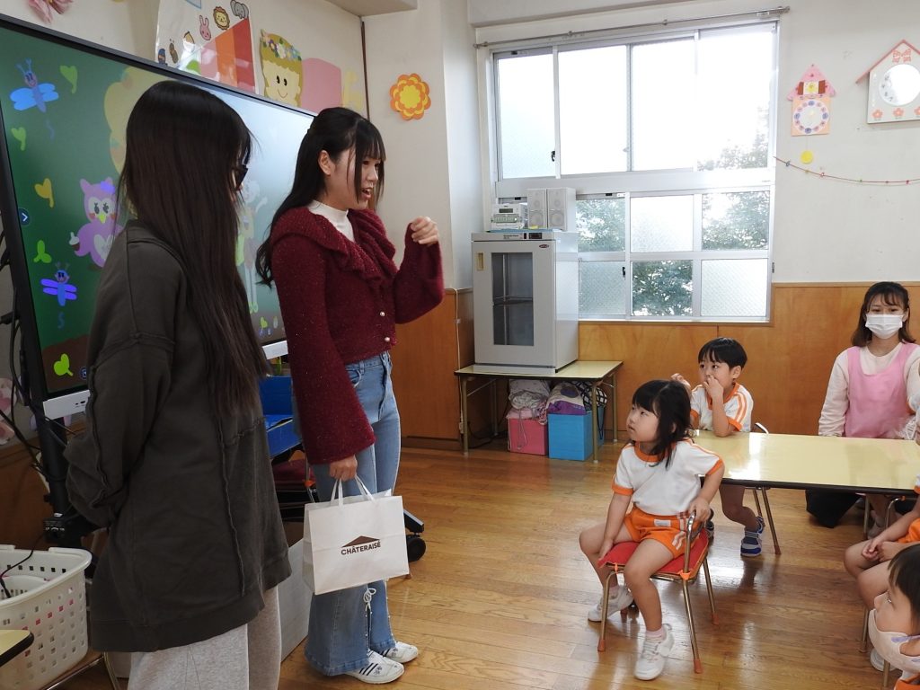 今日は併設の貞静学園短期大学の学生さんが来て、大学祭の案内に来てくれました。園児一人一人に手書きで「あそびにきてね」というメッセージが書かれたカードを、声をかけながら渡します。さすが保育士や幼稚園教諭を目指す学生さんです。降園時には保護者の皆さまにもご案内をしていました。大学祭、とても楽しみです。