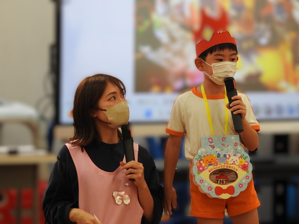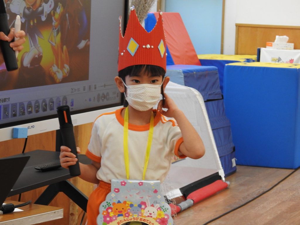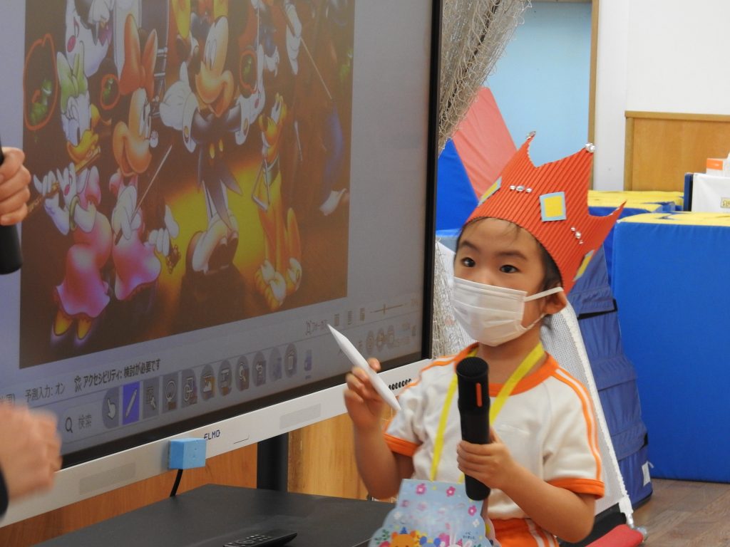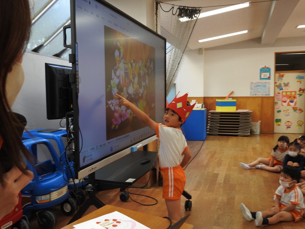 今日は11月のお誕生日会でした。今日のゲームは宝さがしです。電子黒板で表示された絵の中から宝物を見つけ、まるで囲みます。その宝物によって答える質問が違います。電子黒板にもこんな活用法があるのかと感心しきりです。